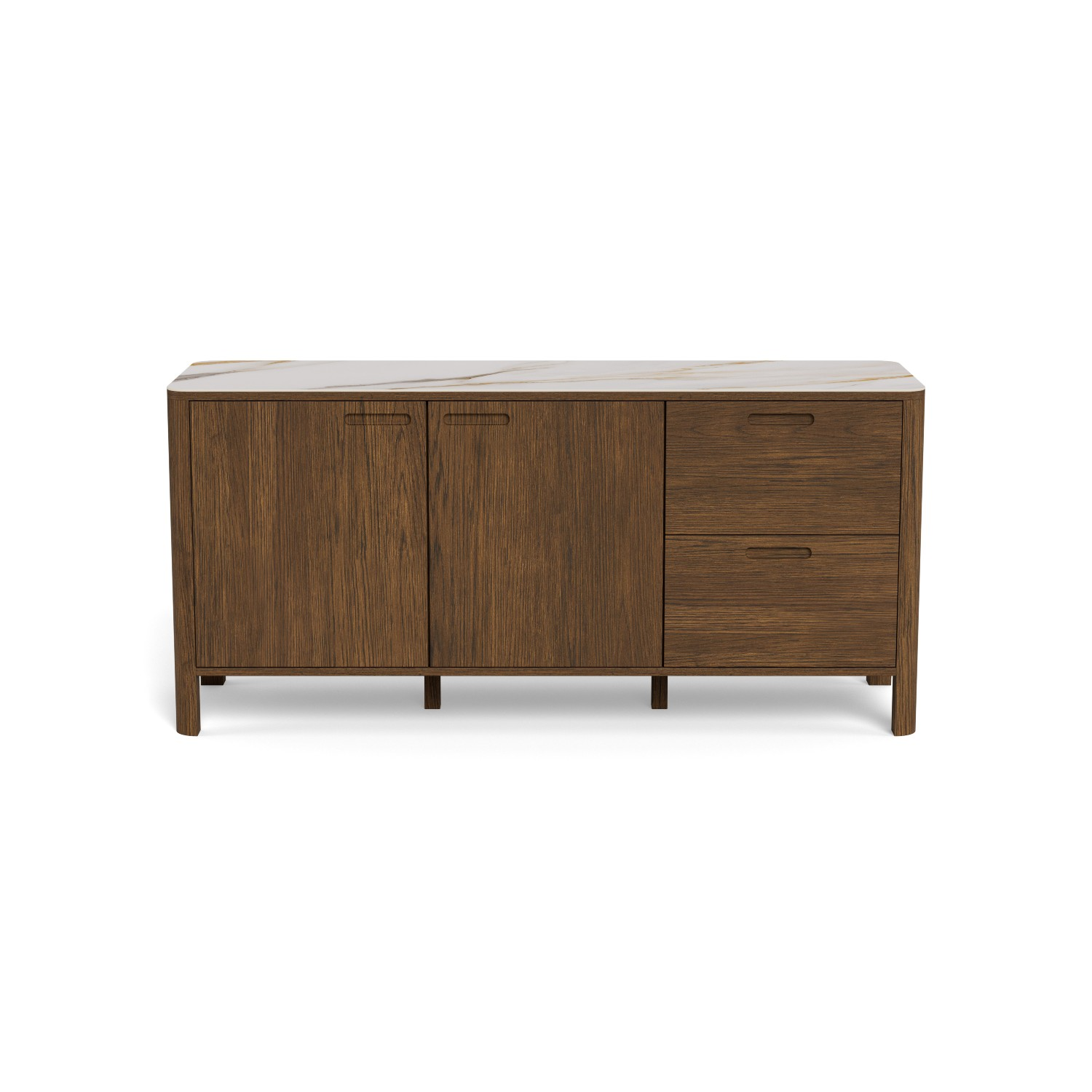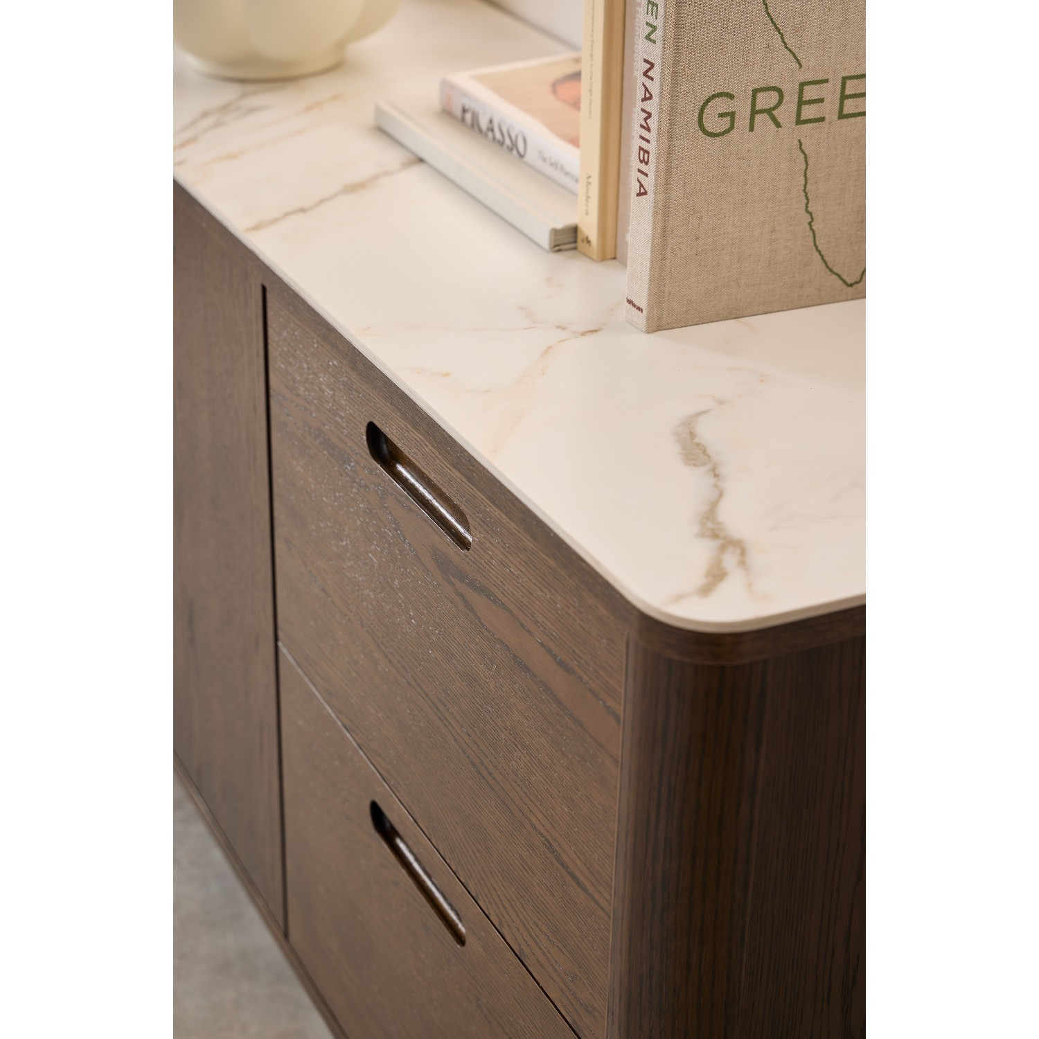 Adaugă un plus de eleganță și funcționalitate locuinței tale cu bufetul cu 2 uși și 2 sertare crem/stejar afumat Southampton realizat pe structură din MDF finisat cu furnir de stejar cu finisaj afumat de culoarea tabacului. Acest bufet îmbină armonios noblețea furnirului de stejar afumat cu finețea ceramicii crem lustruite, creând un corp de mobilier ce emană eleganță atemporală. Nuanțele bogate ale lemnului în contrast cu textura delicată a blatului ceramic, decorat subtil, oferă o experiență vizuală ce trezește simțurile și adaugă profunzime oricărui spațiu. Structura solidă a bufetului cu 2 uși și 2 sertare crem/stejar afumat Southampton garantează durabilitate în timp, iar sistemul de închidere silențioasă aduce un plus de confort în utilizarea zilnică. Compartimentarea interioară cu 2 uși și 2 sertare este practică și versatilă și permite păstrarea ordonată a lucrurilor. Cele 2 polițe sunt perfecte pentru depozitarea pe rafturi a unor obiecte mici, lenjerii sau accesorii sezoniere. Indiferent că îl amplasezi în dormitor, hol sau dressing, bufetul cu 2 uși și 2 sertare crem/stejar afumat Southampton devine o piesă centrală ce adaugă stil și ordine oricărui spațiu.