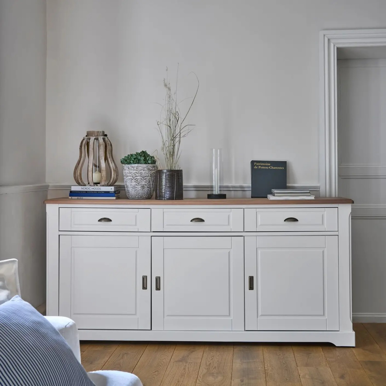Bufetul cu 3 usi si 3 sertare alb/stejar natur Provence face parte din colectia de dining cu acelasi nume, care impresioneaza prin design, culoare, finisaje si materiale de calitate din care este executata. Combinatia dintre alb si finisajul natur al stejarului creeaza luminozitate in incapere si imprima o atmosfera prietenoasa care aminteste de zilele insorite de vacanta. Bufetul cu 3 usi si 3 sertare alb/stejar natur Provence este usor de integrat in orice tip de decor interior.