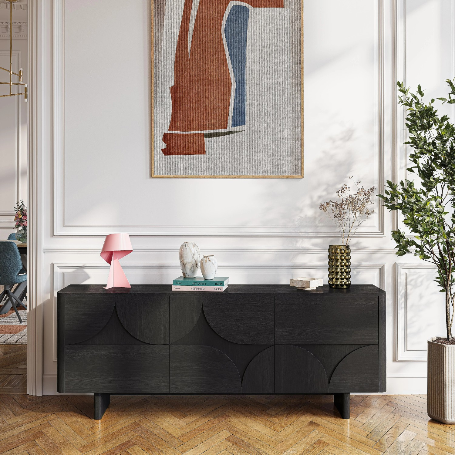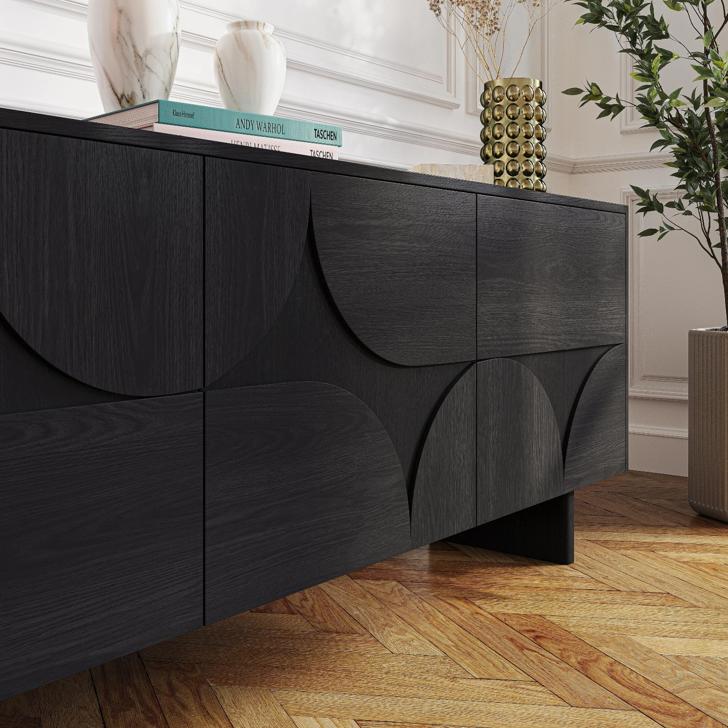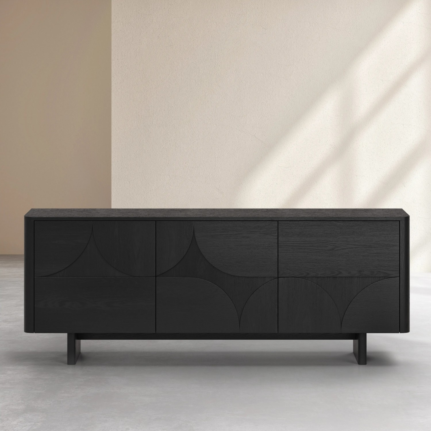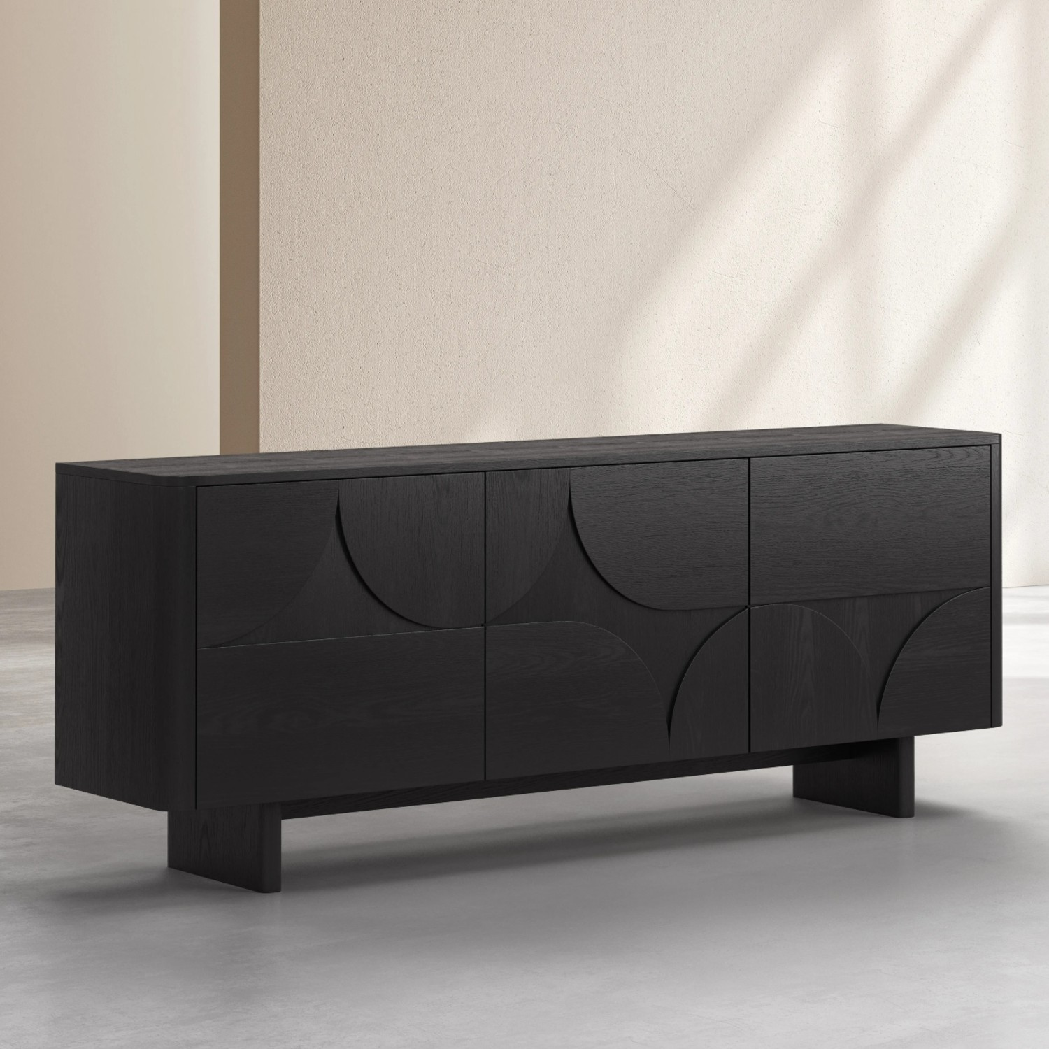 Adaugă eleganță și funcționalitate spațiului tău cu bufetul cu 3 usi lemn, negru, Amore un corp de mobilier premium, proiectat și fabricat în Europa. Realizat din PAL cu furnir natural de lemn de frasin cu finisaj negru lăcuit, acest bufet se remarcă prin designul său contemporan inspirat din arhitectura mediteraneană, unde arcadele sculptate și colțurile rotunjite creează o armonie între estetică și funcționalitate.