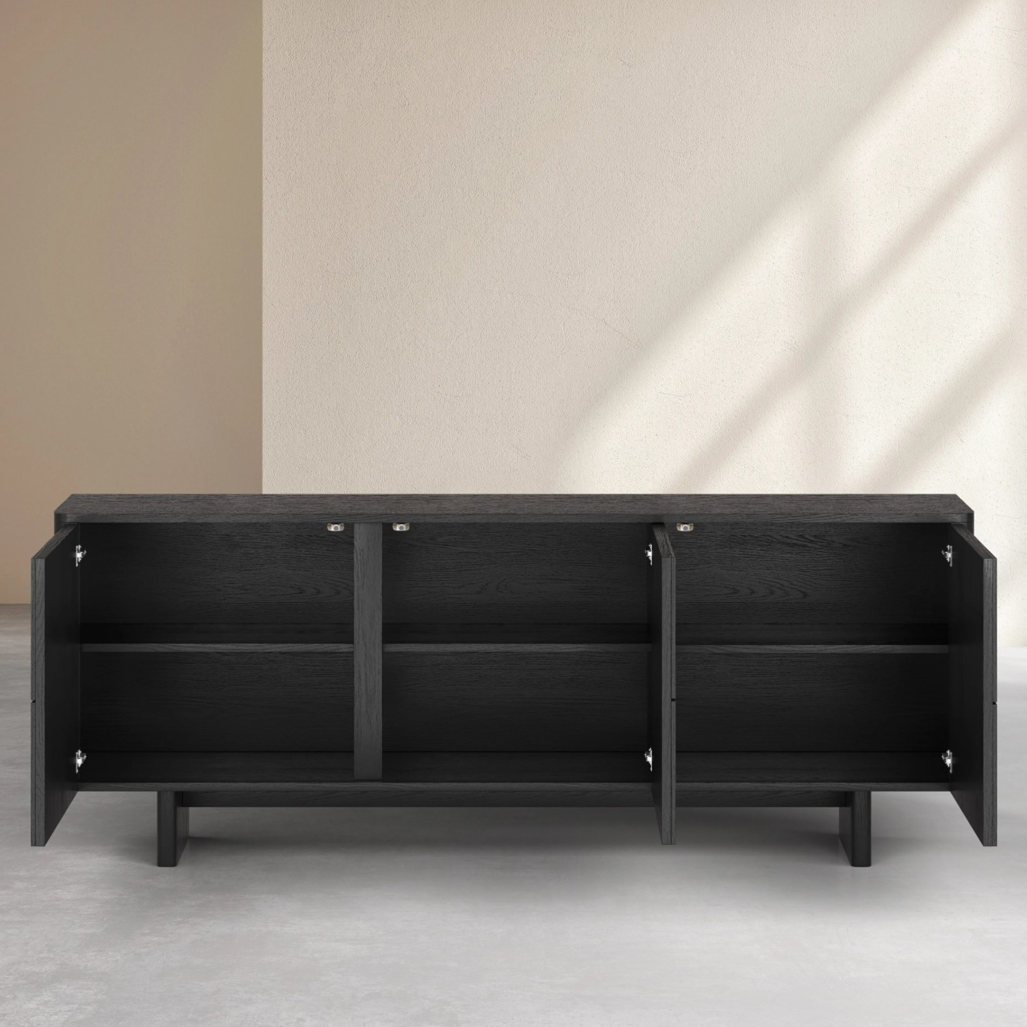 Interiorul este conceput pentru o organizare eficientă: cele 2 polițe integrate delimitează 4 rafturi spațioase, ideale pentru depozitarea veselei, a obiectelor decorative sau a lucrurilor de zi cu zi. Astfel, bufetul cu 3 usi lemn, negru, Amore nu este doar o piesă de design, ci și un aliat practic în orice locuință. Ușile cu sistem de deschidere prin apăsare, push-to-open, oferă un aspect minimalist, fără mânere vizibile, păstrând un stil curat și modern.