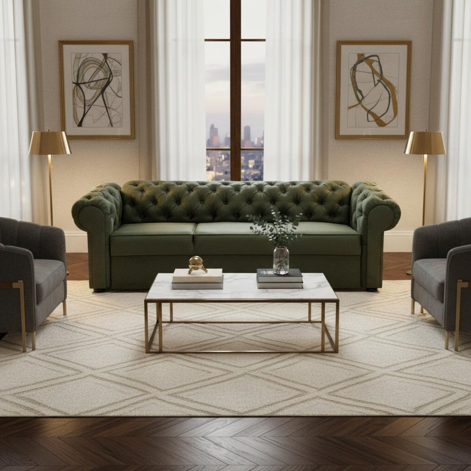 Canapea extensibila 3 locuri kaki Valentino - o canapea realizata in stilul Chesterfield, devenit deja clasic in designul interior. Eleganta si impunatoare, amintind de atmosfera saloanelor din casele nobiliare, aceasta canapea imprima personalitate incaperii in care se afla. Tapiteria din catifea (Manila 34) si sezutul cu arcuri wave asigura eleganta si confort, mai ales ca aceasta canapea extensibila 3 locuri kaki Valentino se poate transforma fara dificultate intr-un pat cu dimensiunea de 127 x 185 cm. Partea din spate a spatarului este si ea tapitata, astfel ca permite pozitionarea canapelei oriunde in incapere. Picioarele din lemn masiv cu finisaj wenge permit integrarea usoara intr-o ambianta contemporana.