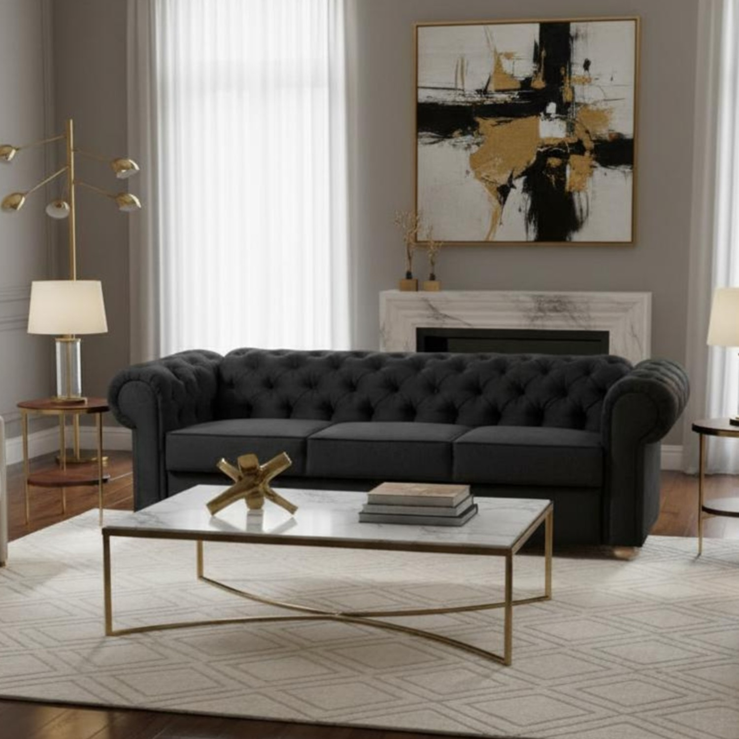 Canapeaua extensibila 3 locuri negru Valentino este realizata in stilul Chesterfield, devenit deja clasic in designul interior. Eleganta si impunatoare, amintind de atmosfera saloanelor din casele nobiliare, aceasta canapea imprima personalitate incaperii in care se afla.Partea din spate a spatarului este si ea tapitata, astfel ca permite pozitionarea canapelei extensibile 3 locuri negru Valentino oriunde in incapere. Tapiteria din catifea adauga eleganta, dar si confortul necesar, mai ales ca aceasta canapea extensibila 3 locuri negru Valentino se poate transforma fara dificultate intr-un pat cu dimensiunea de 127 x 185 cm.Picioarele din lemn masiv de culoare stejar natur permit integrarea usoara intr-o ambianta contemporana. Impreuna cu fotoliul Valentino si canapeaua de 2 locuri Valentino formeaza un set de living realizat in stil Chesterfield care devine atractia intregii incaperi.