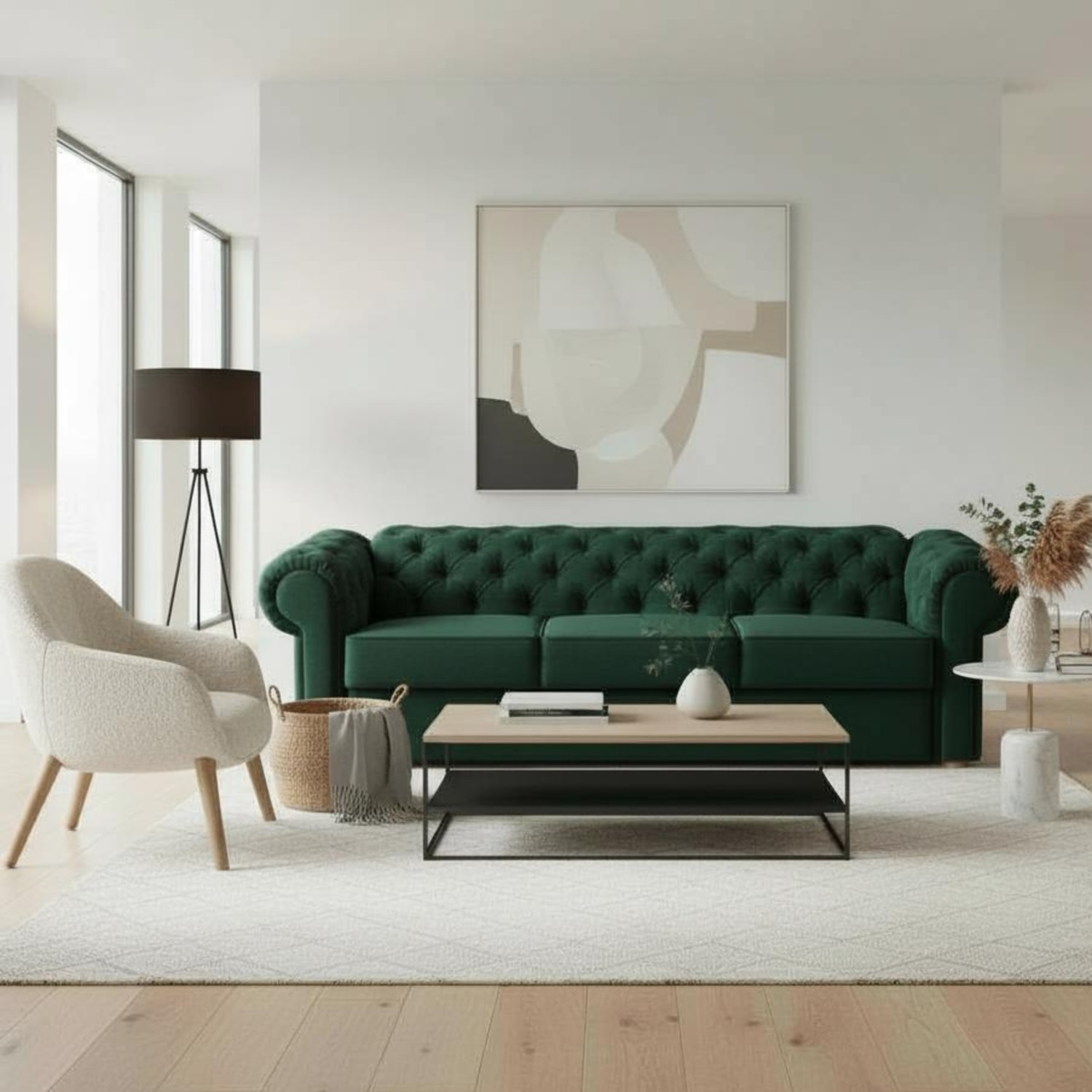 Canapeaua extensibila 3 locuri verde/natur Valentino este realizata in stilul Chesterfield, devenit deja clasic in designul interior. Eleganta si impunatoare, amintind de atmosfera saloanelor din casele nobiliare, aceasta canapea imprima personalitate incaperii in care se afla. Tapiteria din catifea si sezutul cu arcuri wave asigura eleganta si conform, mai ales ca aceasta canapea extensibila 3 locuri verde/natur Valentino se poate transforma fara dificultate intr-un pat cu dimensiunea de 127 x 185 cm. Partea din spate a spatarului este si ea tapitata, astfel ca permite pozitionarea canapelei extensibile 3 locuri verde/natur Valentino oriunde in incapere. Picioarele din lemn masiv natur permit integrarea usoara intr-o ambianta contemporana.