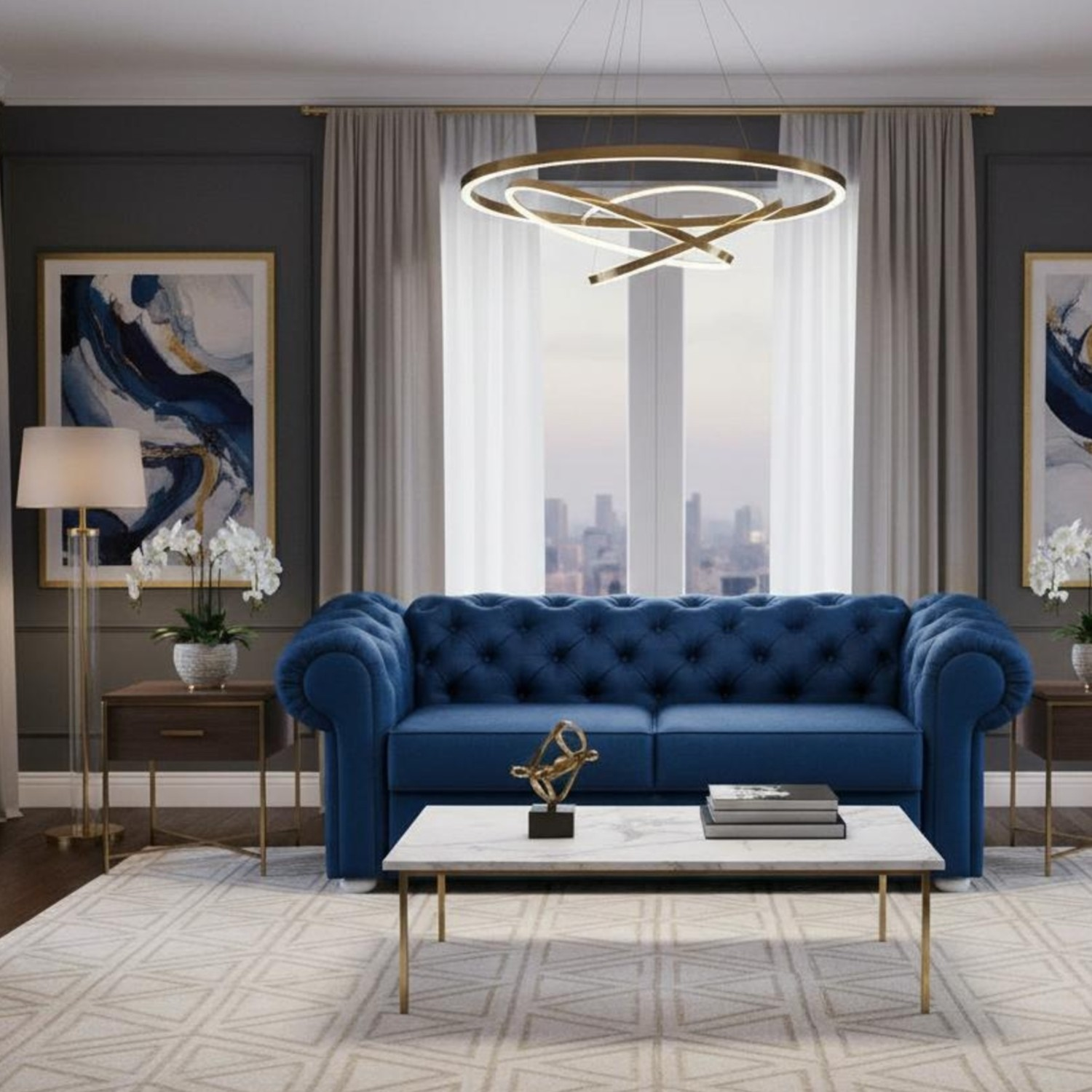Canapeaua fixa 2 locuri albastru/alb Valentino impreuna cu fotoliul Valentino si canapeaua de 3 locuri Valentino de aceeasi culoare formeaza un set de living stil Chesterfield care devine atractia intregii incaperi.