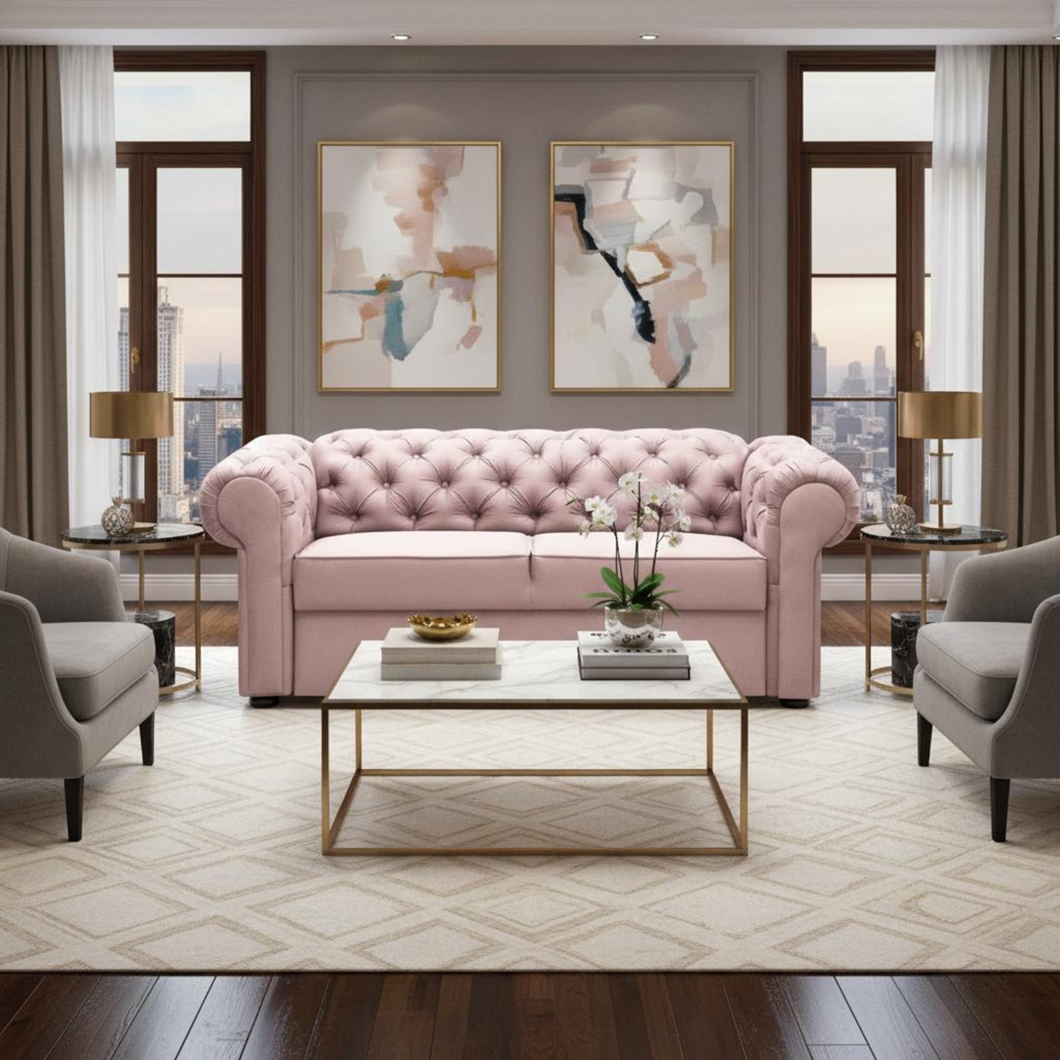 Canapeaua fixa 2 locuri roz Valentino impreuna cu fotoliul Valentino si canapeaua extensibila de 3 locuri Valentino de aceeasi culoare formeaza un set de living stil Chesterfield care devine atractia intregii incaperi.