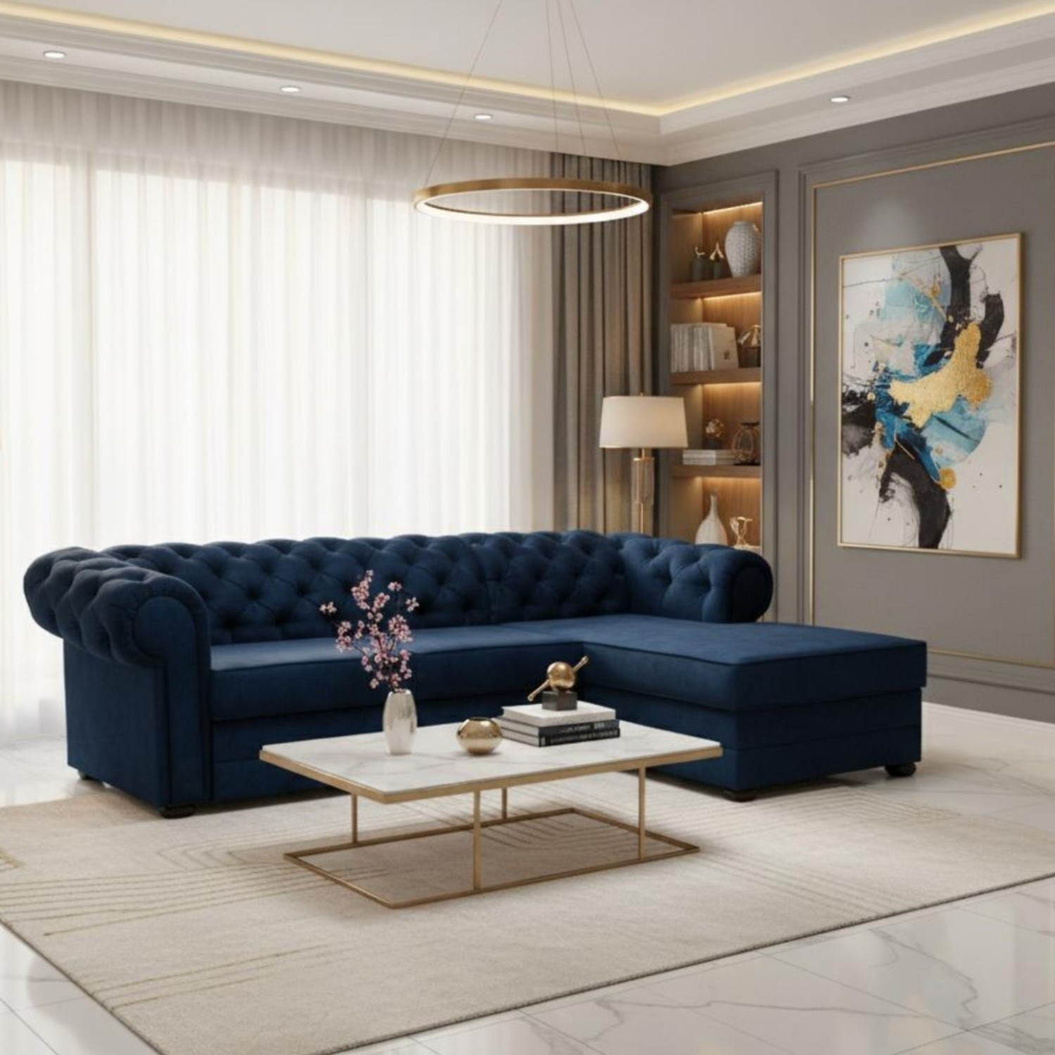Coltarul extensibil dreapta albastru inchis Valentino este o aparitie eleganta in orice living cu personalitate. Stilul Chesterfield in care este realizat este unul distinct, elegant, care aduce in designul contemporan nota saloanelor nobiliare din casele englezesti. Structura de lemn a coltarului extensibil dreapta albastru inchis Valentino ii asigura rezistenta, iar tapiteria cu butoni ii da eleganta specifica. Confortul este asigurat de spatarul tapitat, dar si de sezutul cu suspensie cu arcuri ondulate si umplutura cu spuma HR foarte elastica. Coltarul extensibil dreapta albastru inchis Valentino poate fi transformat cu usurinta intr-un pat cu dimensiunea de 210 x 125 cm, datorita unui mecanism de pliere foarte practic. Lada de depozitare a lenjeriei de pat este un plus pentru acest coltar. Picioarele din lemn masiv pot fi realizate cu finisaj wenge, alb si natur.