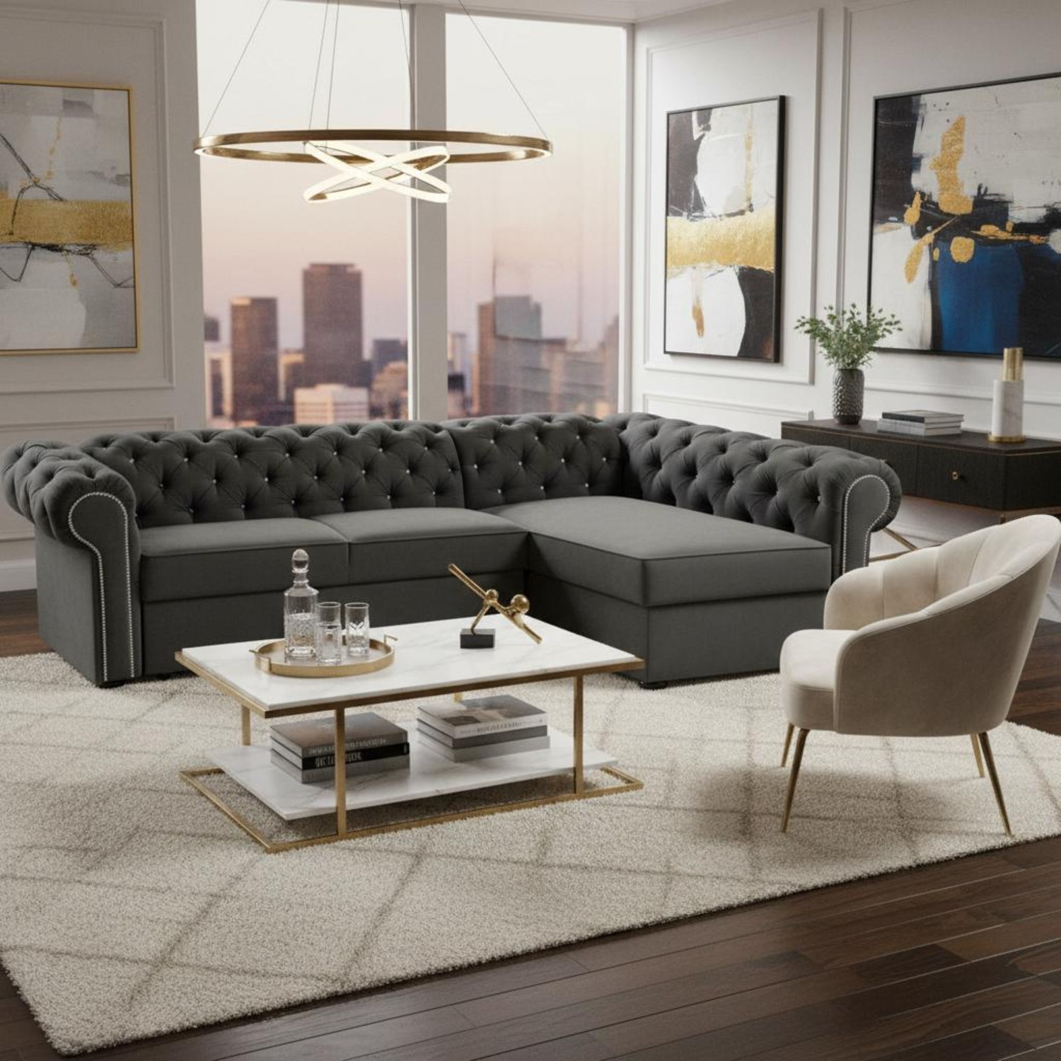 Structura de lemn a coltarului extensibil dreapta gri Versace ii asigura rezistenta, iar tapiteria ii confera eleganta specifica. Butonii decorativi scot in evidenta stilul Chesterfield care ii este caracteristic. Confortul este asigurat de spatarul tapitat, dar si de sezutul cu suspensie cu arcuri ondulate si umplutura cu spuma HR foarte elastica. Coltarul extensibil dreapta gri Versace poate fi transformat cu usurinta intr-un pat cu dimensiunea de 124 x 209 cm, datorita unui mecanism de pliere foarte practic si usor de actionat. Lada de depozitare a lenjeriei de pat este un plus pentru acest coltar. Puteti vedea toate culorile disponibile de coltar Versace in partea de jos a acestei pagini.