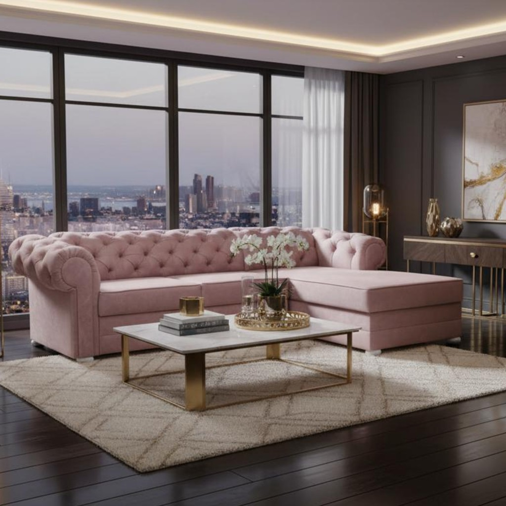 Coltarul extensibil dreapta roz deschis Valentino este o aparitie eleganta in orice living cu personalitate. Stilul Chesterfield in care este realizat este unul distinct, elegant, care aduce in designul contemporan nota saloanelor nobiliare din casele englezesti. Structura de lemn a coltarului extensibil dreapta roz deschis Valentino ii asigura rezistenta, iar tapiteria cu butoni ii confera eleganta specifica. Confortul este asigurat de spatarul tapitat, dar si de sezutul cu suspensie cu arcuri ondulate si umplutura cu spuma HR foarte elastica. Coltarul extensibil dreapta roz deschis Valentino poate fi transformat cu usurinta intr-un pat cu dimensiunea de 210 x 125 cm, datorita unui mecanism de pliere foarte practic. Lada de depozitare a lenjeriei de pat este un plus pentru acest coltar. Picioarele din lemn masiv pot avea finisaj natur, alb sau wenge.