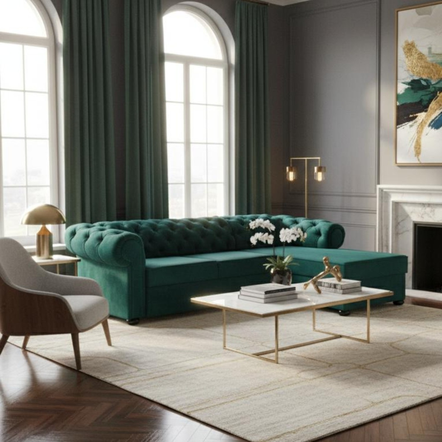 Coltarul extensibil dreapta verde Valentino este o aparitie eleganta in orice living cu personalitate. Stilul Chesterfield in care este realizat este unul distinct, elegant, care aduce in designul contemporan nota saloanelor nobiliare din casele englezesti. Structura de lemn a coltarului extensibil dreapta verde Valentino ii asigura rezistenta, iar tapiteria cu butoni ii confera eleganta specifica. Confortul este asigurat de spatarul tapitat, dar si de sezutul cu suspensie cu arcuri ondulate si umplutura cu spuma HR foarte elastica. Coltarul extensibil dreapta verde Valentino poate fi transformat cu usurinta intr-un pat cu dimensiunea de 210 x 125 cm, datorita unui mecanism de pliere foarte practic. Lada de depozitare a lenjeriei de pat este un plus pentru acest coltar. Picioarele din lemn masiv pot avea finisaj natur, alb sau wenge.