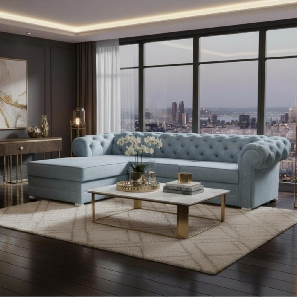 Coltarul extensibil stanga albastru deschis Valentino este o aparitie eleganta in orice living cu personalitate. Stilul Chesterfield in care este realizat este unul distinct, elegant, care aduce in designul contemporan nota saloanelor nobiliare din casele englezesti. Structura de lemn a coltarului extensibil stanga albastru deschis Valentino ii asigura rezistenta, iar tapiteria cu butoni ii confera eleganta specifica. Confortul este asigurat de spatarul tapitat, dar si de sezutul cu suspensie cu arcuri ondulate si umplutura cu spuma HR foarte elastica. Coltarul extensibil stanga albastru deschis Valentino poate fi transformat cu usurinta intr-un pat cu dimensiunea de 210 x 125 cm, datorita unui mecanism de pliere foarte practic. Lada de depozitare a lenjeriei de pat este un plus pentru acest coltar. Picioarele pot fi comandate cu finisaje natur, alb sau wenge.