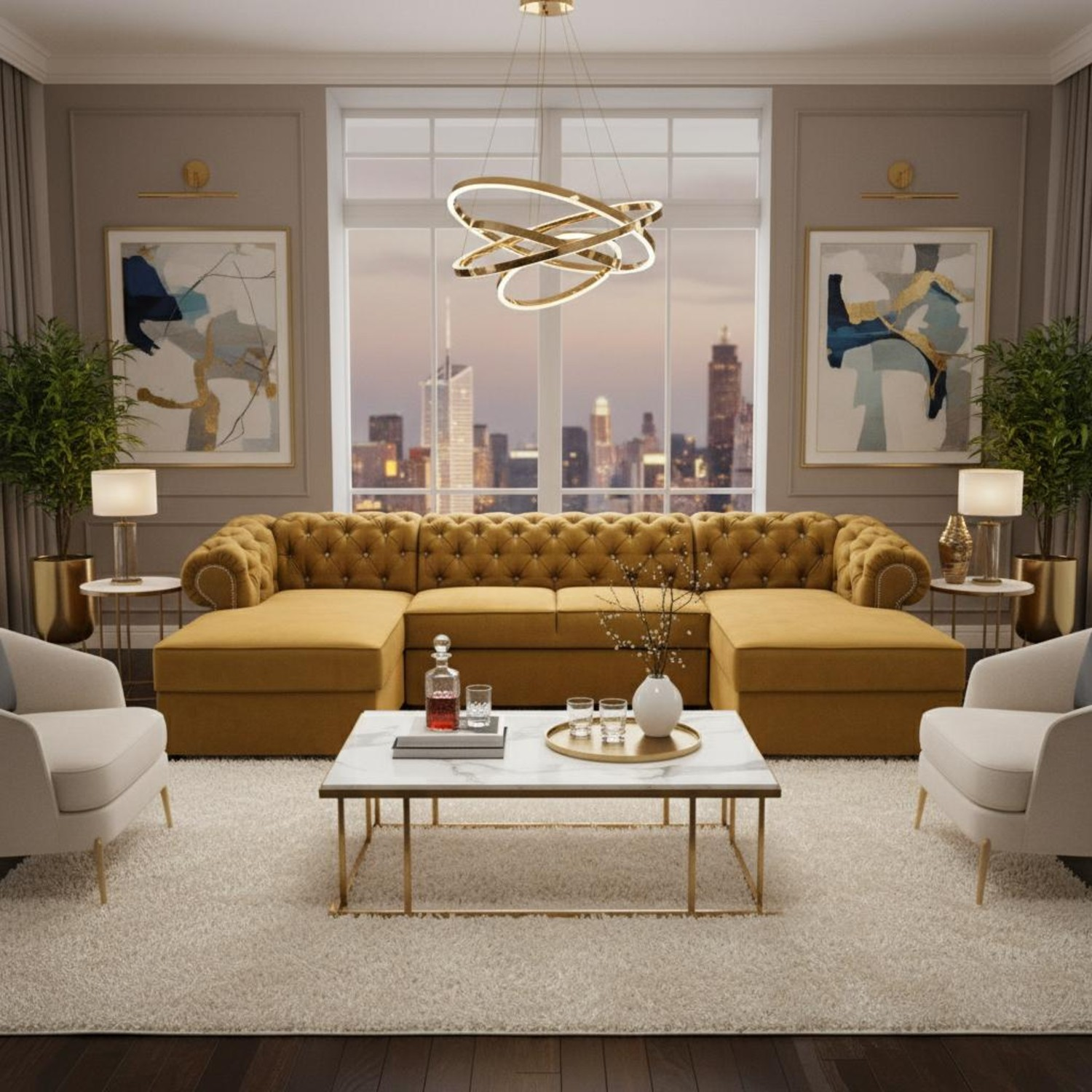 Coltarul extensibil forma U galben mustar Versace este o aparitie eleganta in orice living cu personalitate. Stilul Chesterfield in care este realizat este unul distinct, elegant, care aduce in designul contemporan nota saloanelor nobiliare din casele englezesti. Structura de lemn a coltarului extensibil forma U galben mustar Versace ii asigura rezistenta, iar tapiteria ii confera eleganta specifica. Butonii decorativi scot in evidenta stilul Chesterfield care ii este caracteristic. Confortul este asigurat de spatarul tapitat, dar si de sezutul cu suspensie cu arcuri ondulate si umplutura cu spuma HR foarte elastica. Coltarul extensibil forma U galben mustar Versace poate fi transformat cu usurinta intr-un pat cu dimensiunea de 124 x 281 cm, datorita unui mecanism de pliere foarte practic si usor de actionat. Lazile de depozitare a lenjeriei de pat constituie un plus pentru acest coltar. Puteti vedea toate culorile disponibile de coltar forma U Versace in partea de jos a acestei pagini.