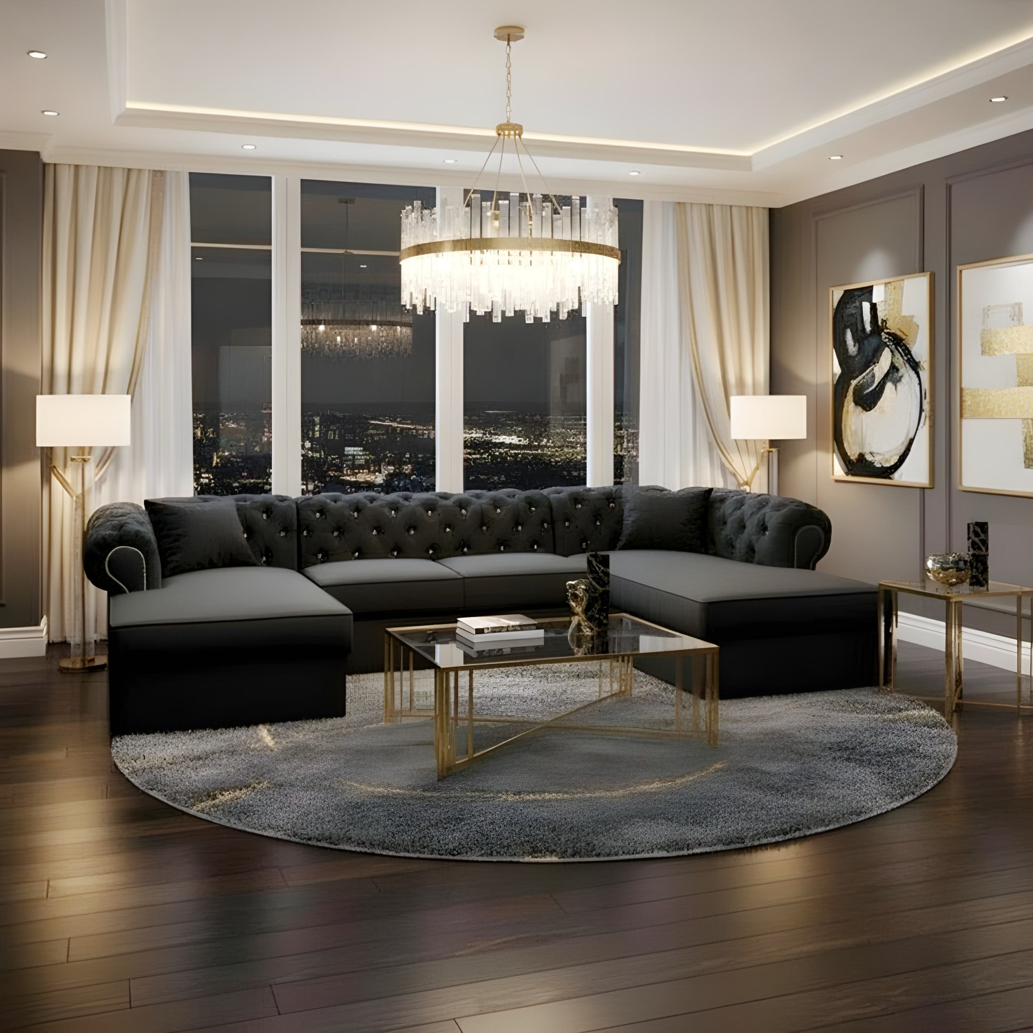 Coltarul extensibil forma U negru Versace este o aparitie eleganta in orice living cu personalitate. Stilul Chesterfield in care este realizat este unul distinct, elegant, care aduce in designul contemporan nota saloanelor nobiliare din casele englezesti. Structura de lemn a coltarului extensibil forma U negru Versace ii asigura rezistenta, iar tapiteria ii confera eleganta specifica. Butonii decorativi scot in evidenta stilul Chesterfield care ii este caracteristic. Confortul este asigurat de spatarul tapitat, dar si de sezutul cu suspensie cu arcuri ondulate si umplutura cu spuma HR foarte elastica. Coltarul extensibil forma U negru Versace poate fi transformat cu usurinta intr-un pat cu dimensiunea de 124 x 281 cm, datorita unui mecanism de pliere foarte practic si usor de actionat. Lazile de depozitare a lenjeriei de pat constituie un plus pentru acest coltar. Puteti vedea toate culorile disponibile de coltar forma U Versace in partea de jos a acestei pagini.