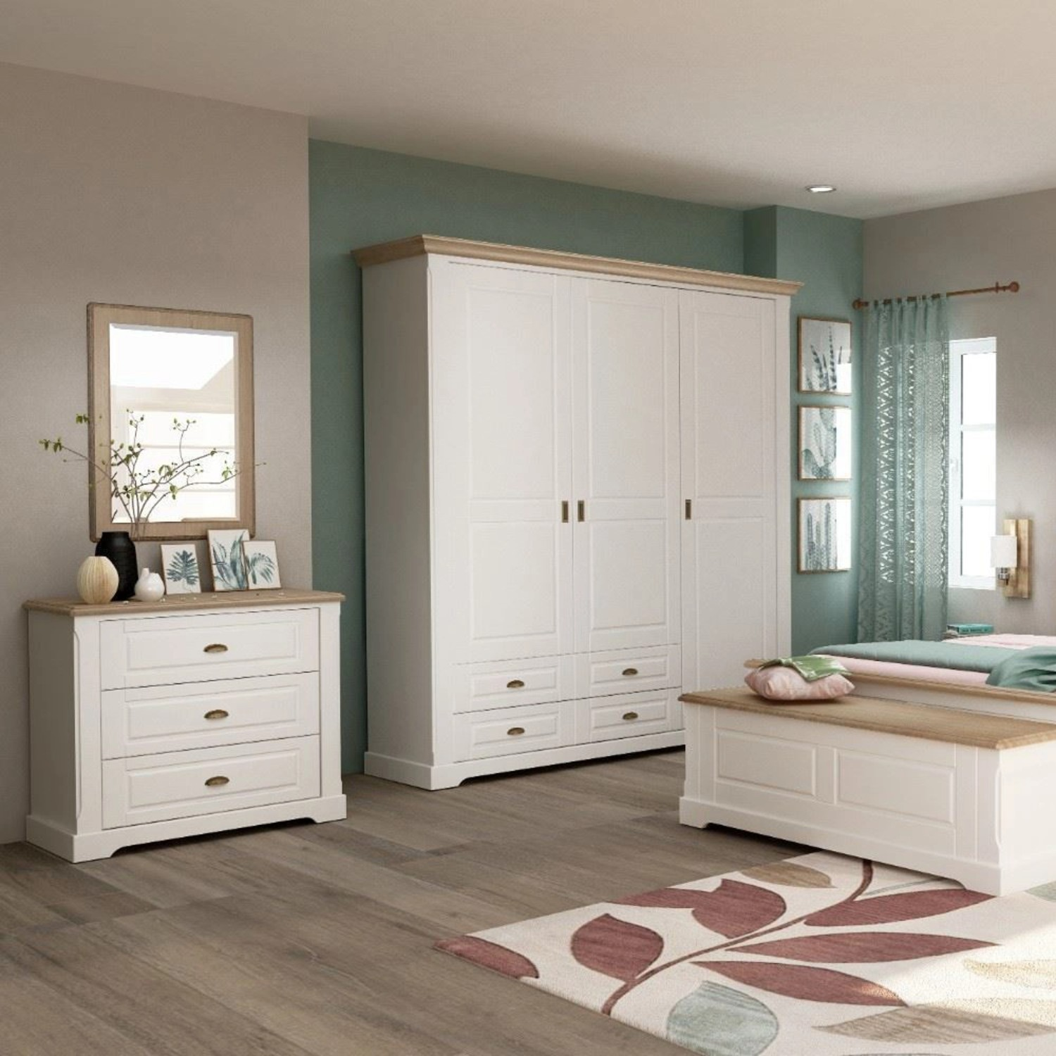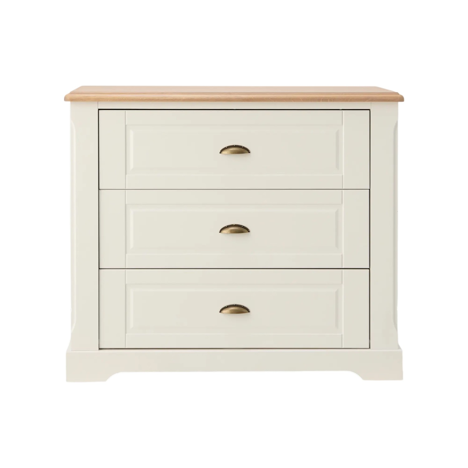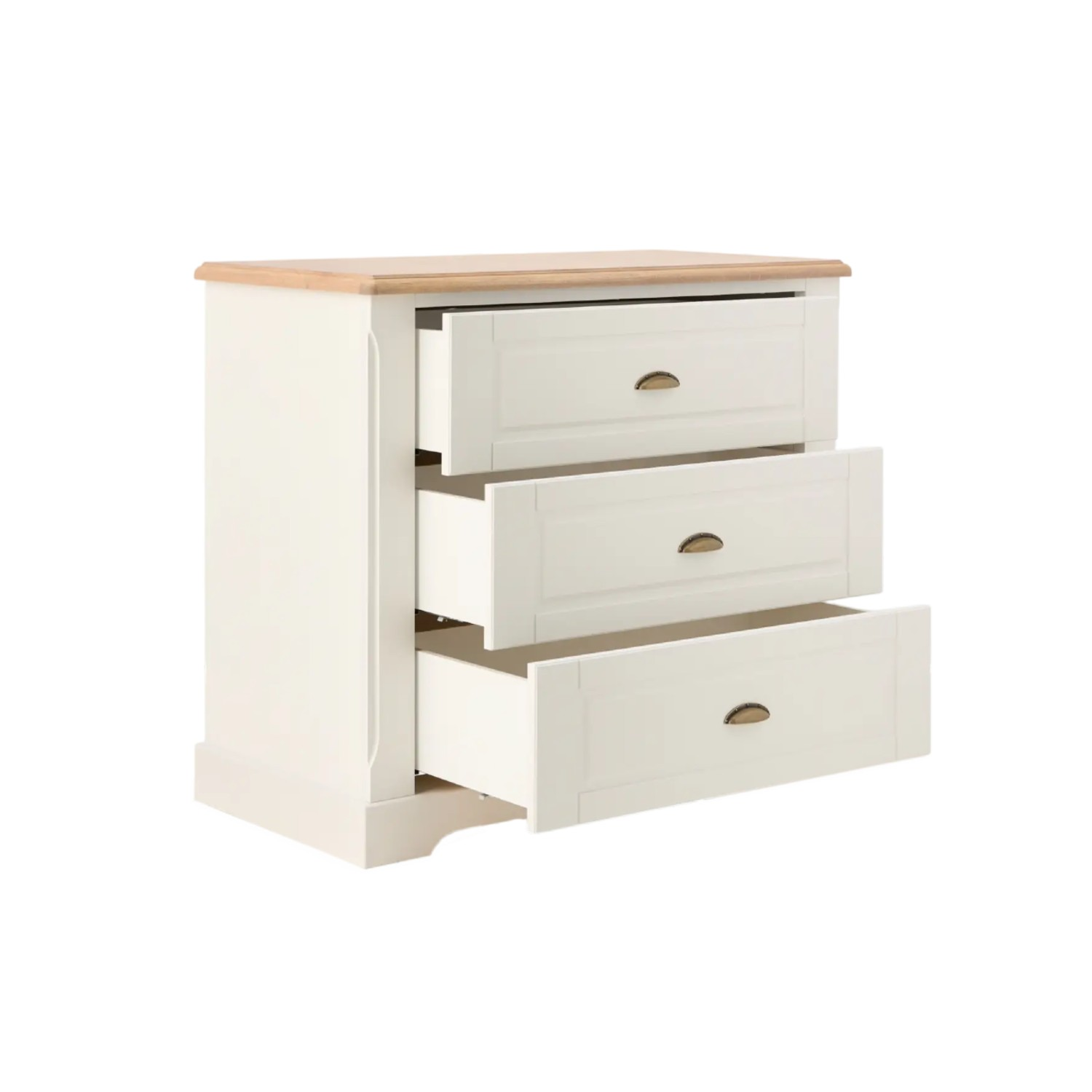 Comoda cu 3 sertare alb/stejar natur Provence completeaza mobilierul de dormitor cu acelasi nume. Comoda cu 3 sertare alb/stejar natur Provence este o piesa de mobilier clasica, eleganta, cu linii minimaliste. Albul comodei asigura luminozitate incaperii si aminteste de atmosfera relaxanta la verii si de parfumul vacantei.Lemnul de stejar care completeaza in mod fericit piesele albe accentueaza trainicia comodei cu 3 sertare alb/stejar natur Provence, gandit sa dureze pe o perioada lunga de timp.