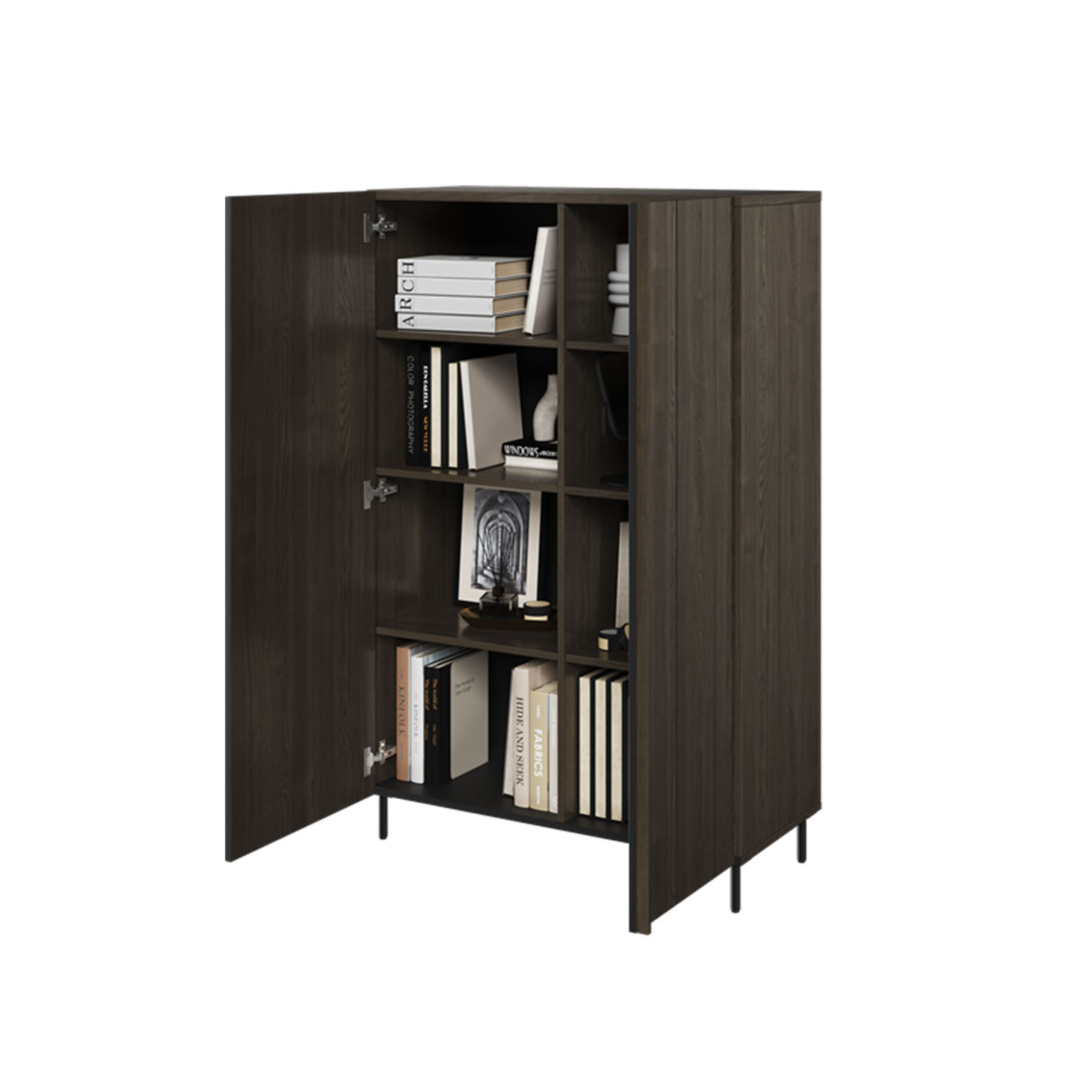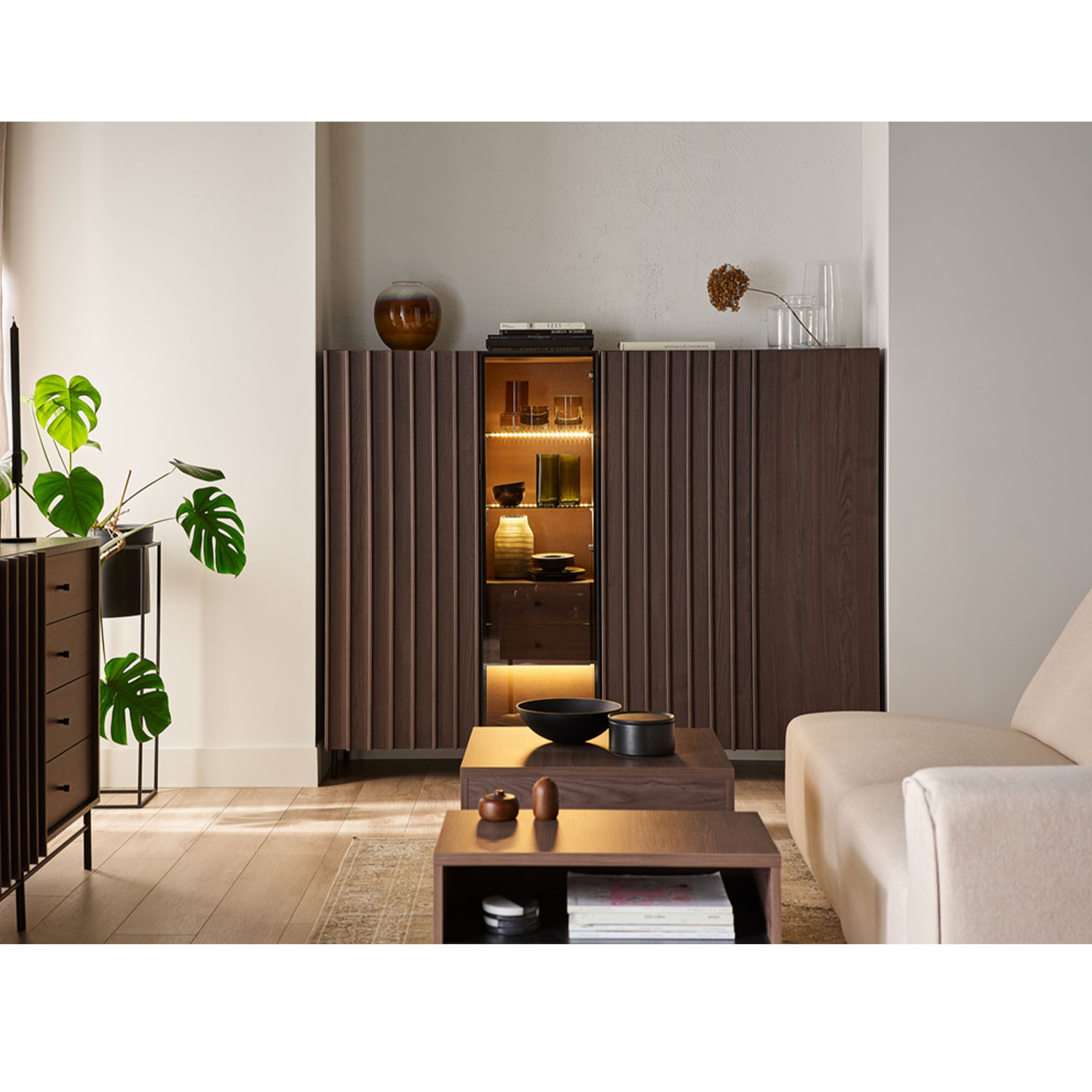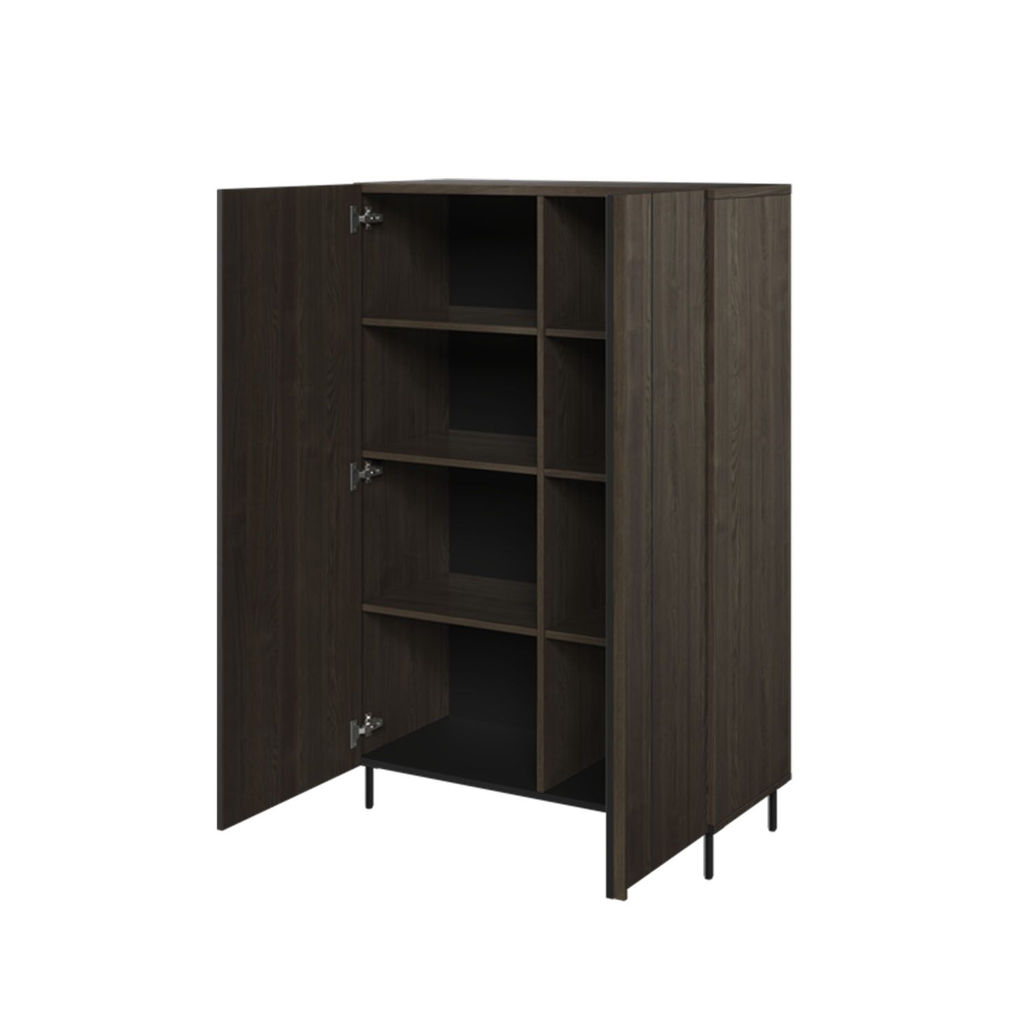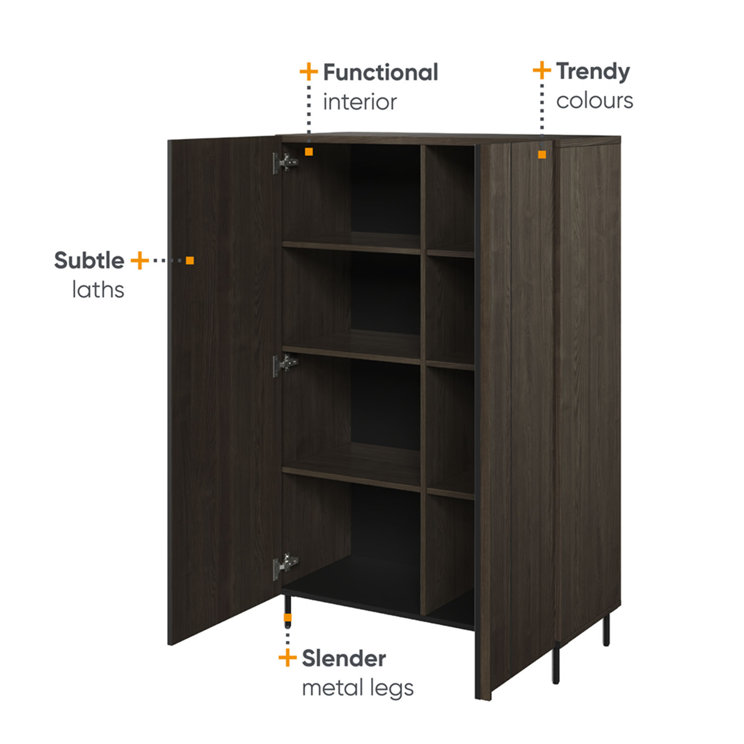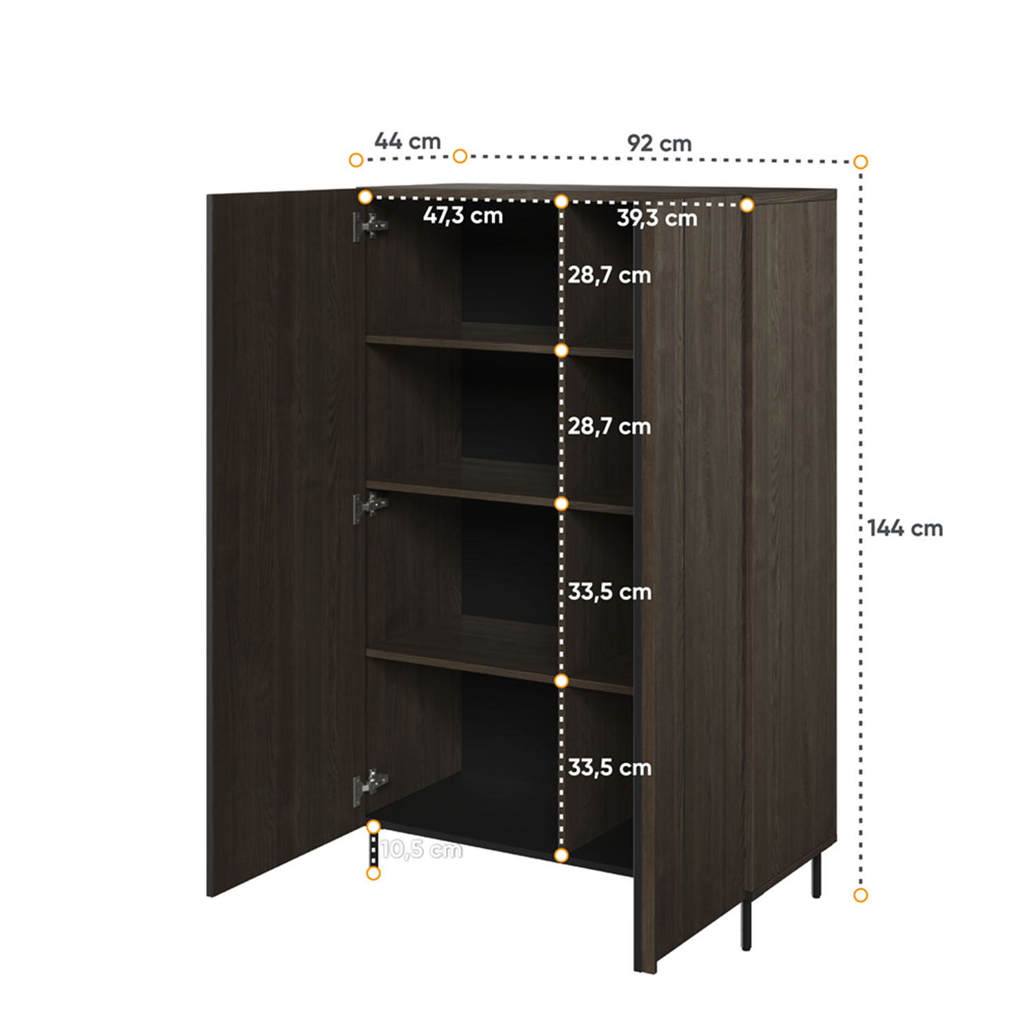 Dacă sunteți în căutarea unei piese de mobilier pentru livingul dumneavoastră care să fie atât funcțională, cât și elegantă, atunci comoda înaltă cu 2 uși, decor stejar afumat închis/negru Piemonte este alegerea potrivită, ea facând parte din colecția cu același nume. Această piesă de mobilier nu numai că își va îndeplini funcția de bază, dar va adăuga caracter și eleganță interiorului dumneavoastră. Realizată într-un stil modern, cu un design minimalist, comoda înaltă cu 2 uși, decor stejar afumat închis/negru Piemonte este inspirată din stilul scandinav. Este compusă din PAL melaminat cu decor stejar afumat închis și două uși decorate cu caneluri care îi conferă un aspect elegant și texturat. Picioarele metalice cu finisaj negru mat îi adaugă comodei înalte cu 2 uși, decor stejar afumat închis/negru Piemonte un detaliu inspirat din designul industrial. Practică și usor de integrat, comoda înaltă cu 2 uși, decor stejar afumat închis/negru Piemonte se potrivește perfect în interioare contemporane datorită aspectului său echilibrat și minimalist.