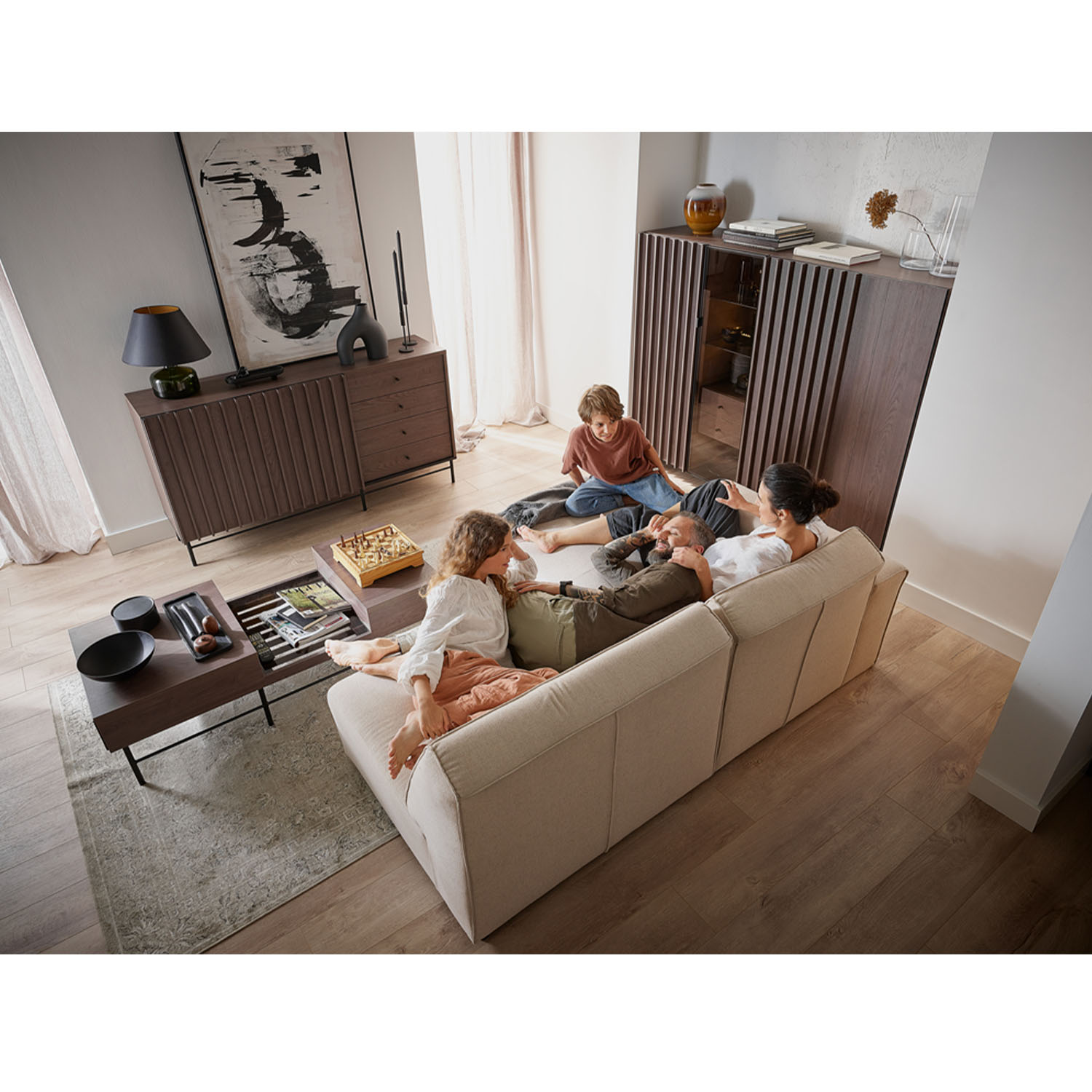✔️ Comodă în stil modern, realizată din PAL melaminat de 16 mm si 22 mm cu decor stejar afumat închis, picioare rezistente