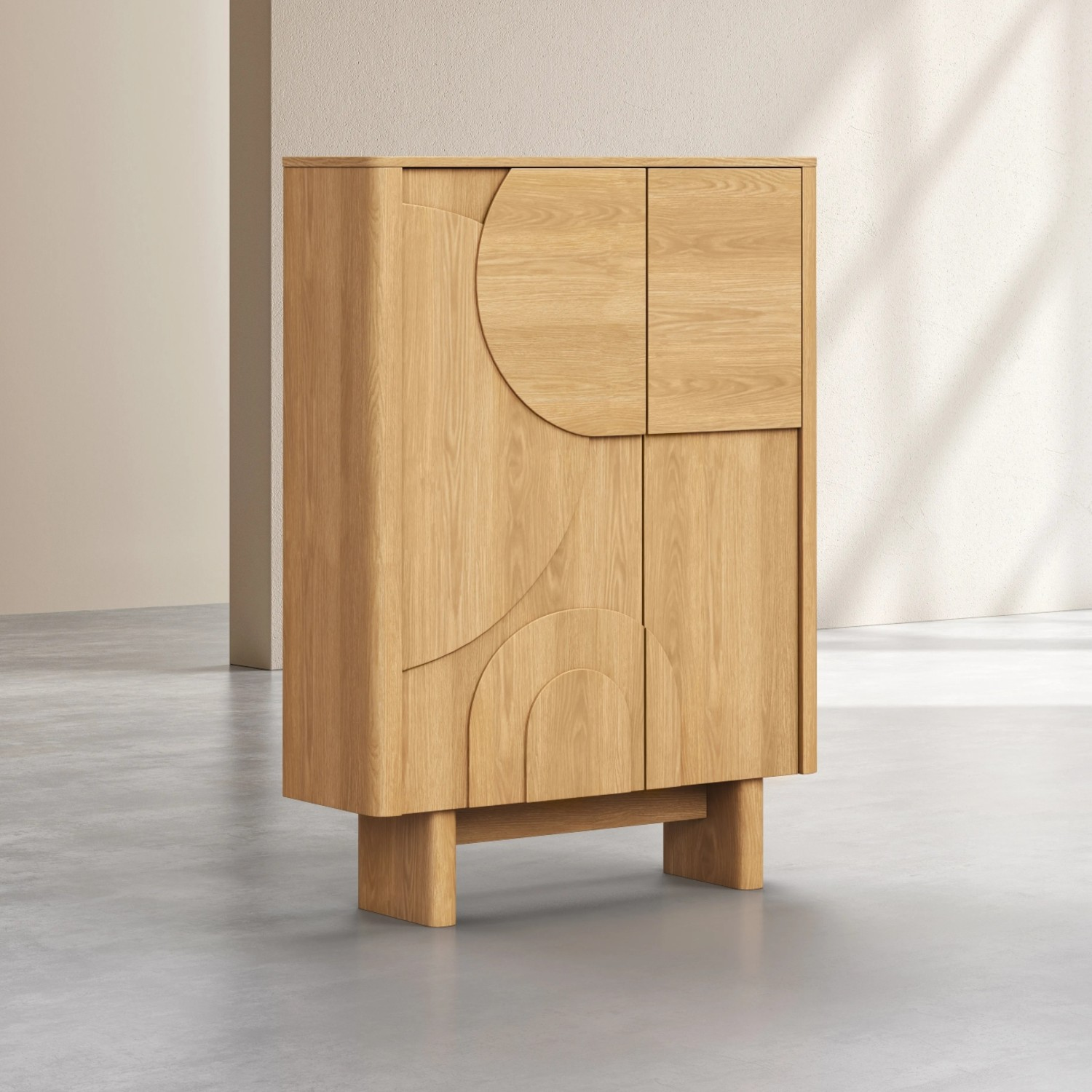 Completează-ți mobila de living sau dining cu eleganță și funcționalitate prin comodă înaltă cu 2 uși stejar natur Amore, un corp de mobilier premium, proiectat și fabricat în Europa. Realizată din PAL cu furnir de stejar natural, această comodă înaltă se remarcă prin designul contemporan inspirat din arhitectura mediteraneană, unde arcadele sculptate și colțurile rotunjite aduc un echilibru perfect între estetică și utilitate.