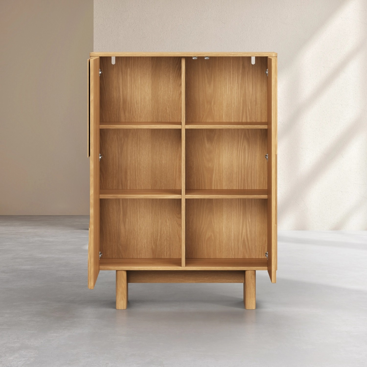 Interiorul este inteligent compartimentat: cele 4 polițe creează spații de depozitare practice, ideale pentru organizarea obiectelor personale, textilelor sau accesoriilor din living sau dining. În plus, ușile cu sistem de deschidere push-to-open oferă un aspect minimalist și modern, eliminând nevoia de mânere vizibile și păstrând o linie curată a designului.