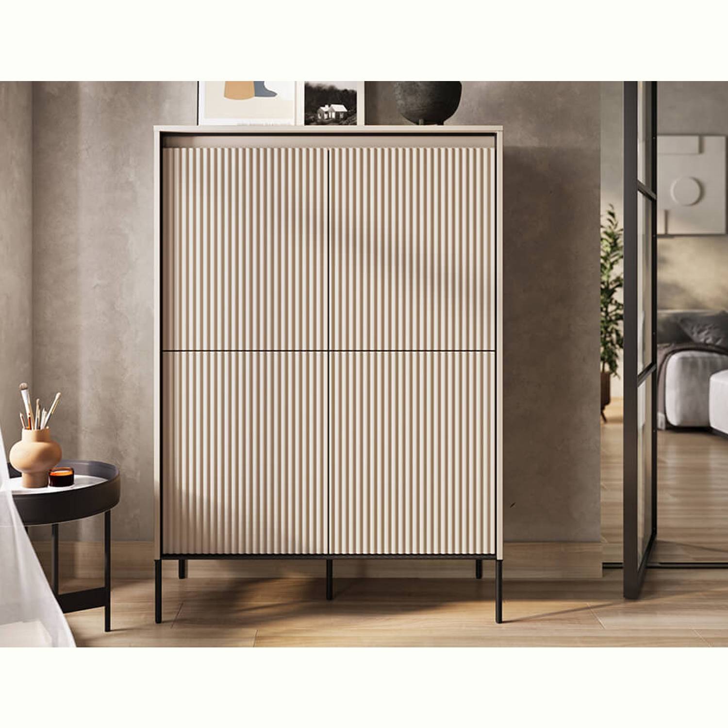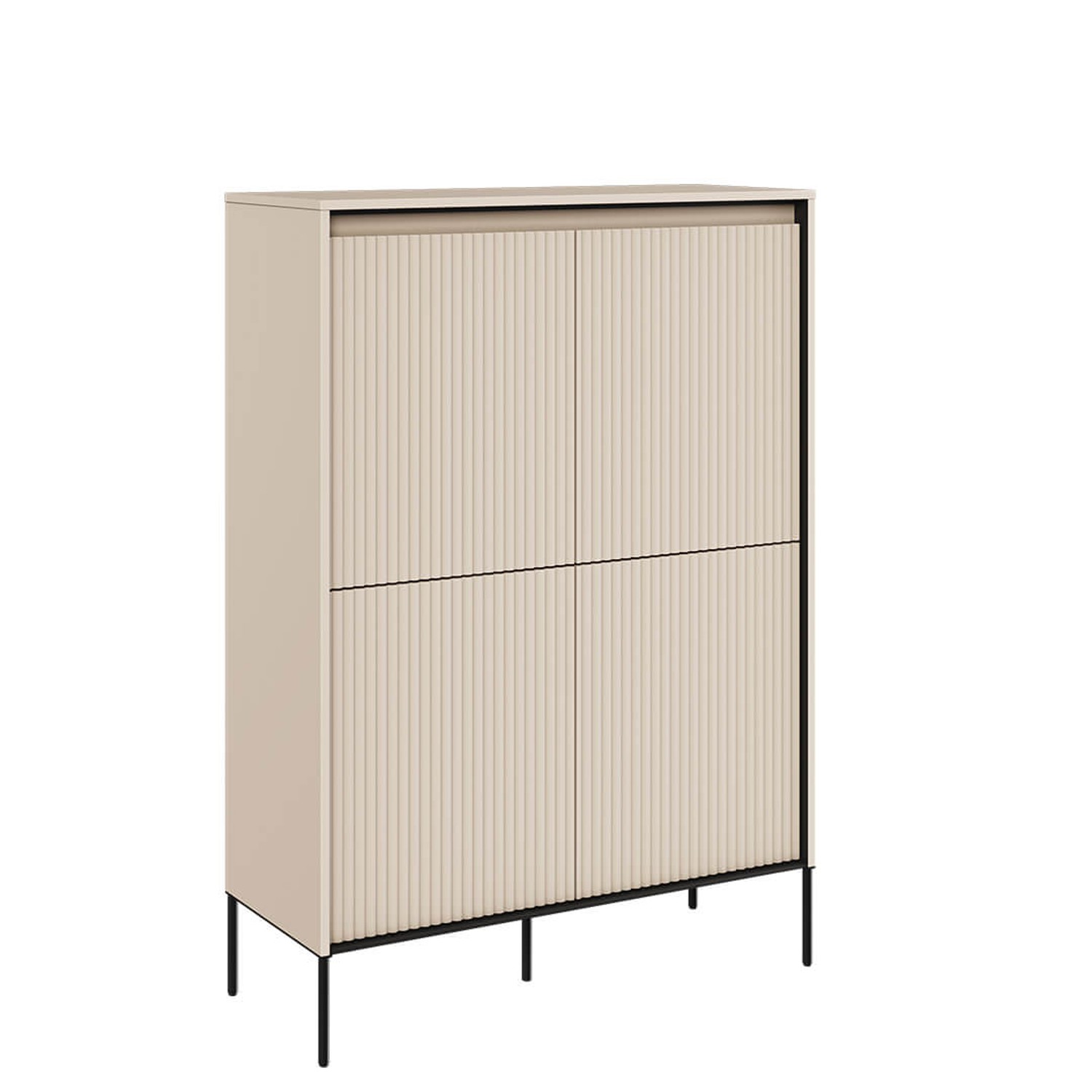 Comoda inalta cu 4 usi, LED, bej Moody face parte din colectia cu acelasi nume, o colectie moderna pe mai multe culori proiectata cu mare atentie la detalii si realizata din materiale de inalta calitate puse foarte bine in valoare. Unul dintre elementele care atrage atentia este frezarea eleganta a fronturilor, care este subliniata de iluminarea cu banda LED. Alte caracteristici ale acestei colectii sunt supletea picioarelor metalice si sistemul de deschidere push-to-open.