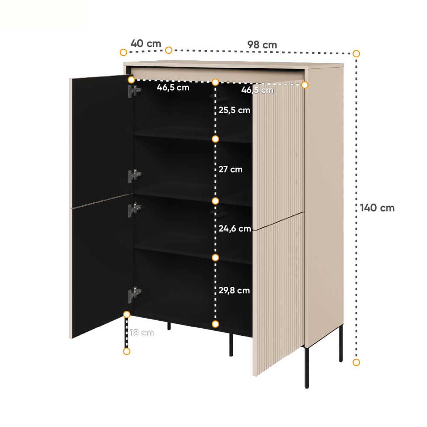 Comoda inalta cu 4 usi, LED, bej Moody este o combinatie de functionalitate si estetica. Inaltimea sa impresionanta ofera mult spatiu pentru a depozita o varietate de articole. Fie ca aveti nevoie de un loc pentru carti, documente, haine sau decoratiuni, comoda inalta cu 4 usi, LED, bej Moody ofera spatiul necesar pentru a pastra totul ordonat si usor accesibil. Nu numai ca va oferi spatiu suplimentar de depozitare, dar va fi si un element decorativ unic. Culoarea bej este clasica si atemporala si se potriveste in diverse stiluri de amenajari interioare.