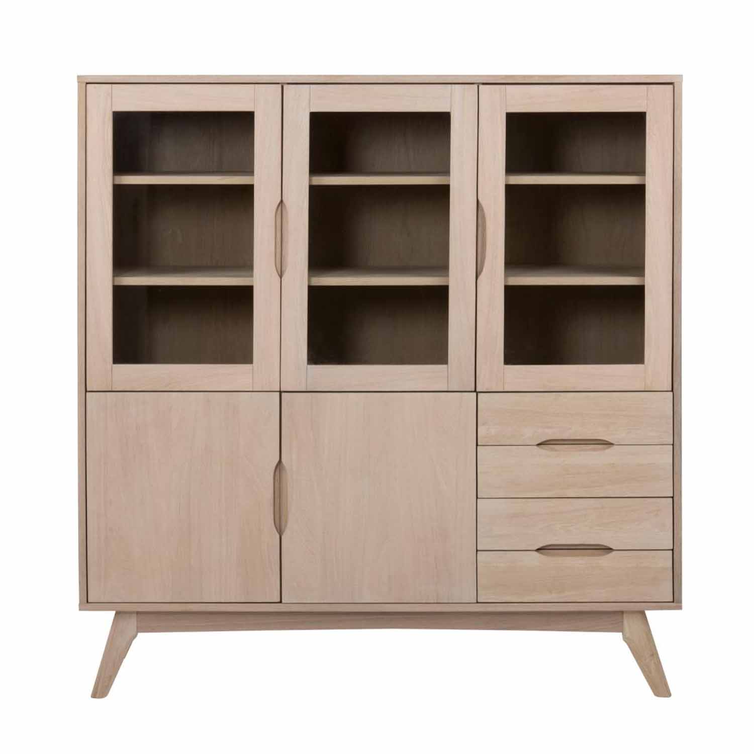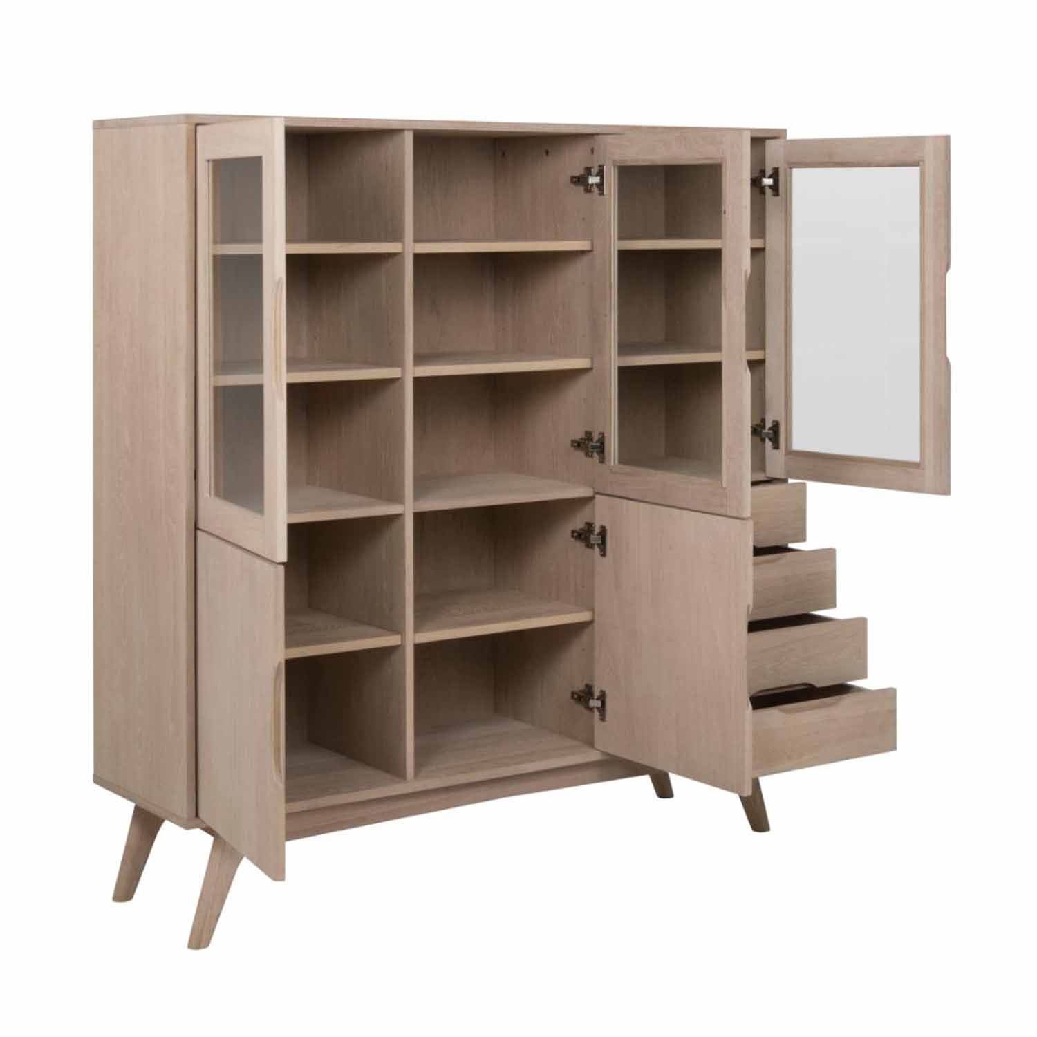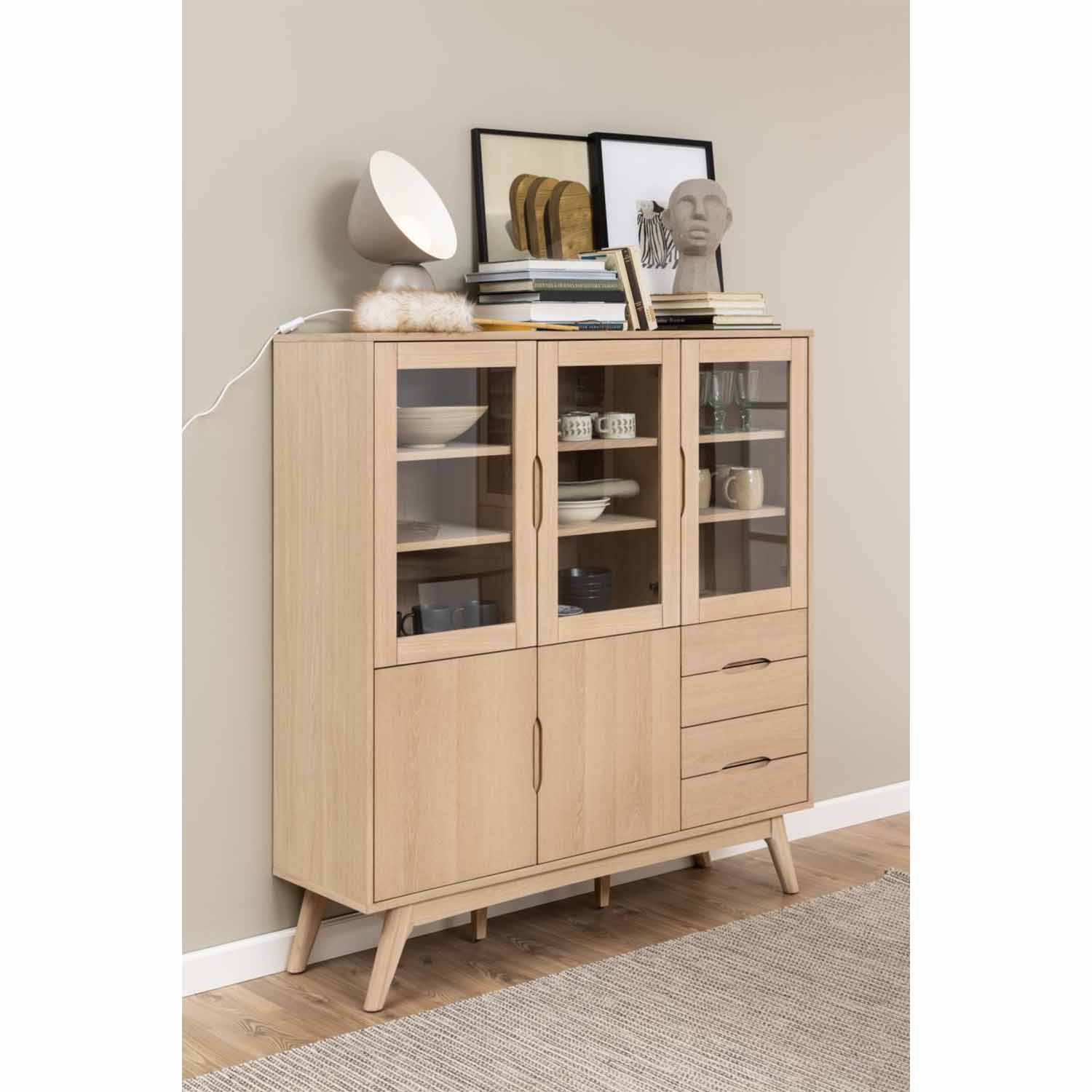 Cauti o solutie de depozitare practica si eleganta pentru livingul sau sufrageria ta? Comoda inalta cu 5 usi si 4 sertare stejar Marte este ideala pentru incaperi moderne si se potriveste in living, sufragerie sau birou. Combinatia de sertare si rafturi cu usi din lemn si din sticla va permite sa o folositi atat pentru depozitare, cat si pentru etalarea unor obiecte de valoare cum ar fi mosteniri de familie sau vesela valoroasa, carti sau bibliorafturi etc. Comoda inalta cu 5 usi si 4 sertare stejar Marte contine nu mai putin de 13 compartimente incapatoare. Usile de sticla ale panoului superior va ofera o oportunitate excelenta de afisare a unor obiecte, oferind decorului o expresie moderna. Manerele integrate accentueaza designul modern al mobilierului, la fel si picioarele dispuse oblic, caracteristice designului scandinav. Comoda inalta cu 5 usi si 4 sertare stejar Marte detine baza realizata din lemn de stejar cu finisaj uleiat cu pigment alb, carcasa si rame usi realizate din MDF, iar fronturile usilor si sertarelor sunt realizate din PAL cu furnir de stejar natur cu finisaj cu ulei pigmentat alb. Politele au acelasi finisaj ca restul vitrinei.Spatiul de depozitare generos va permite sa pastrati ordinea mai usor in locuinta. Comoda inalta cu 5 usi si 4 sertare stejar Marte se intretine usor prin stergere cu o laveta moale.