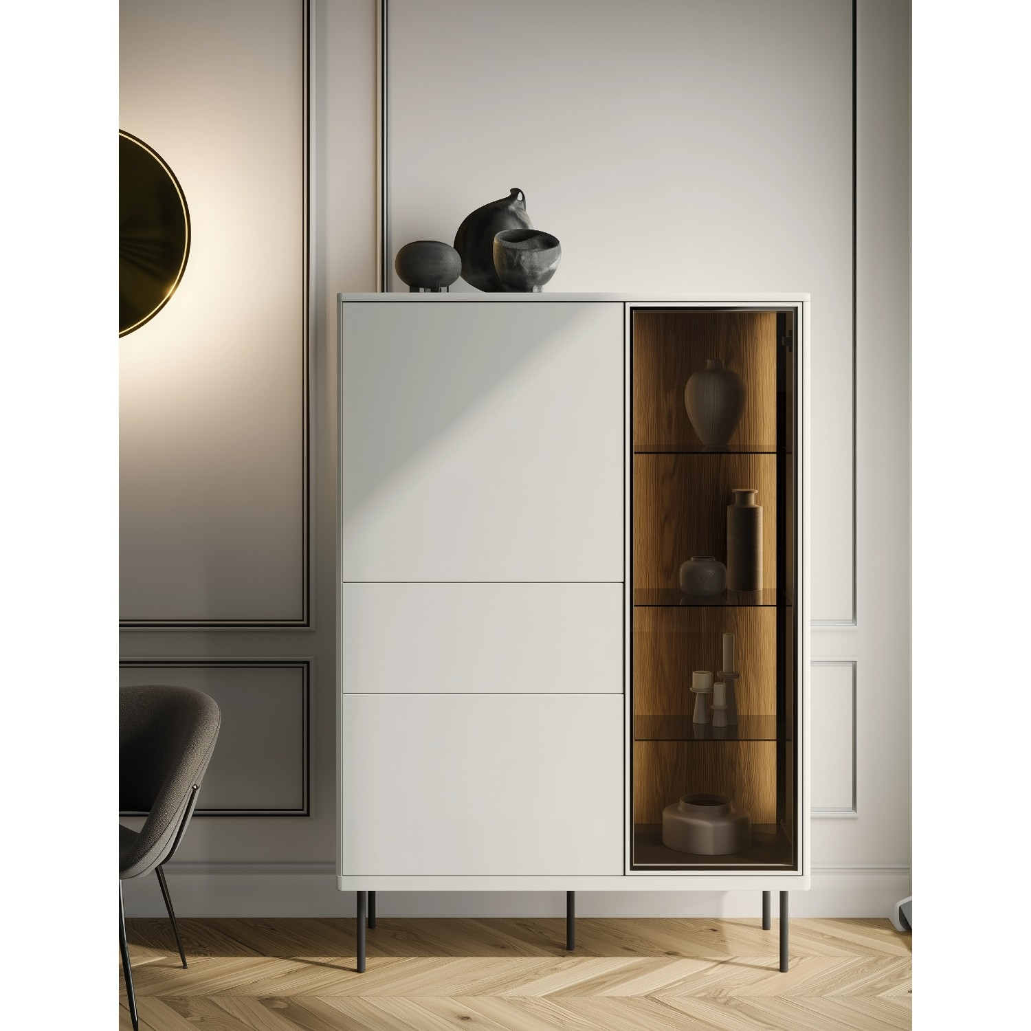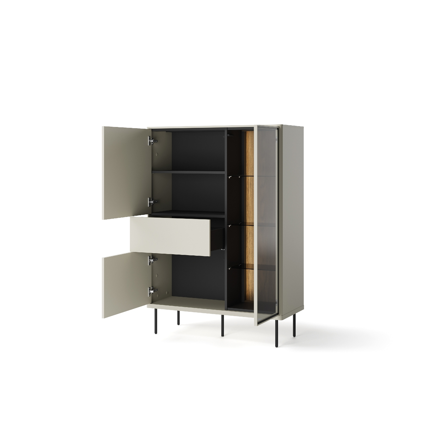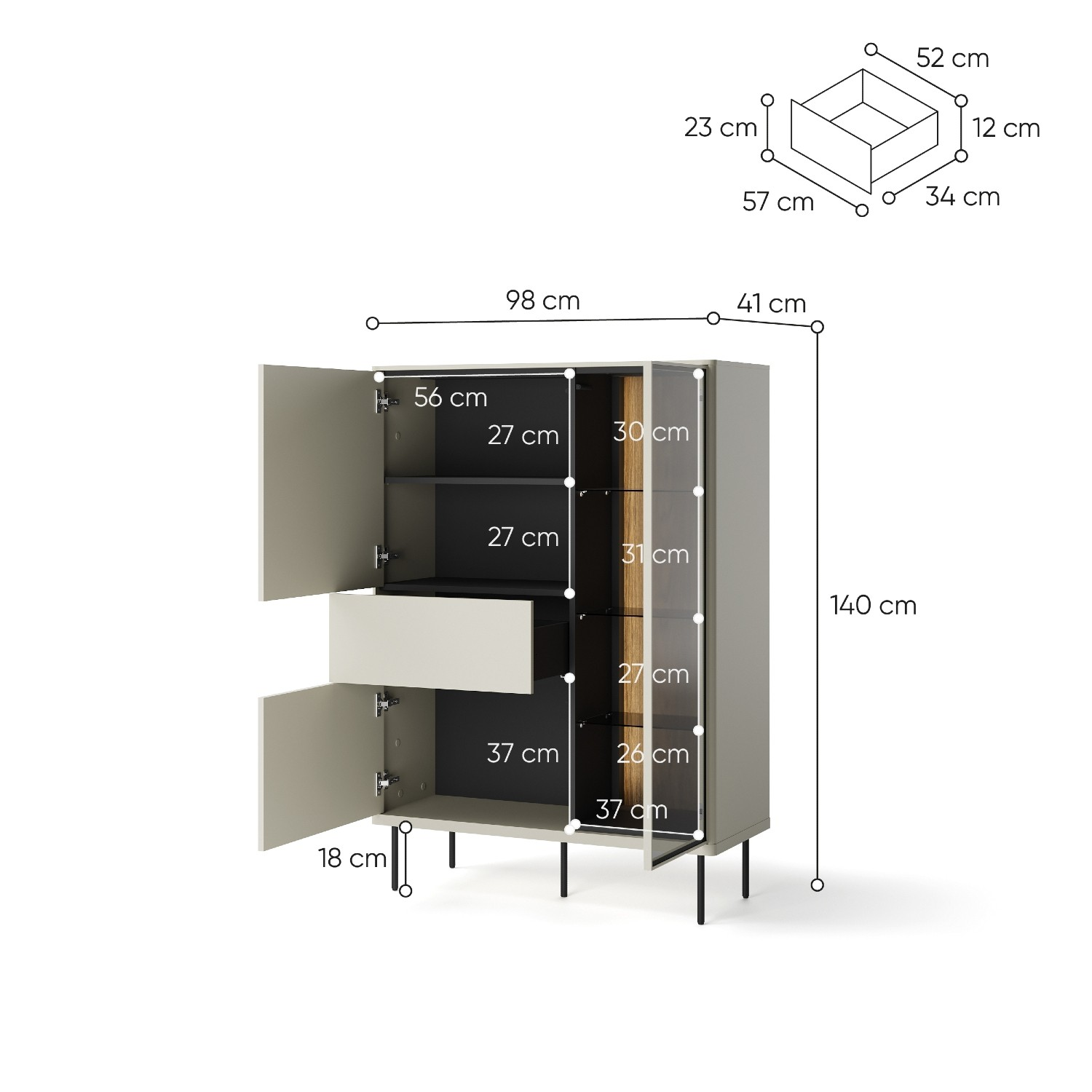 O comodă înaltă modernă cu sistem de iluminare pentru living este o combinație între estetică și funcționalitate. Datorită liniilor simple, designului minimalist și materialelor atent selectate, comoda înaltă cu iluminare cașmir/stejar Epiro se integrează perfect în interioarele moderne, oferindu-le un aspect elegant și stilat. Dacă doriți să creați un spațiu care să încânte oaspeții și să aducă armonie interiorului dvs., o comodă înaltă luminată modern este o soluție care nu vă va dezamăgi. Funcționalitate și organizare la cel mai înalt nivel: comodele înalte pentru living nu numai că arată frumos, dar sunt și foarte funcționale. Rafturile din sticlă vă permit să expuneți cele mai importante decorațiuni, cum ar fi porțelanul, suvenirurile de familie sau cărțile. Fiind închisă, comoda înaltă cu iluminare cașmir/stejar Epiro, se asigură că obiectele dvs. de valoare sunt protejate de praf și deteriorare și, în același timp, sunt întotdeauna la vedere. Lumina subtilă accentuează obiectele expuse în partea cu vitrină și conferă interiorului o senzație confortabilă, creând o atmosferă plăcută în timpul întâlnirilor de seară.
