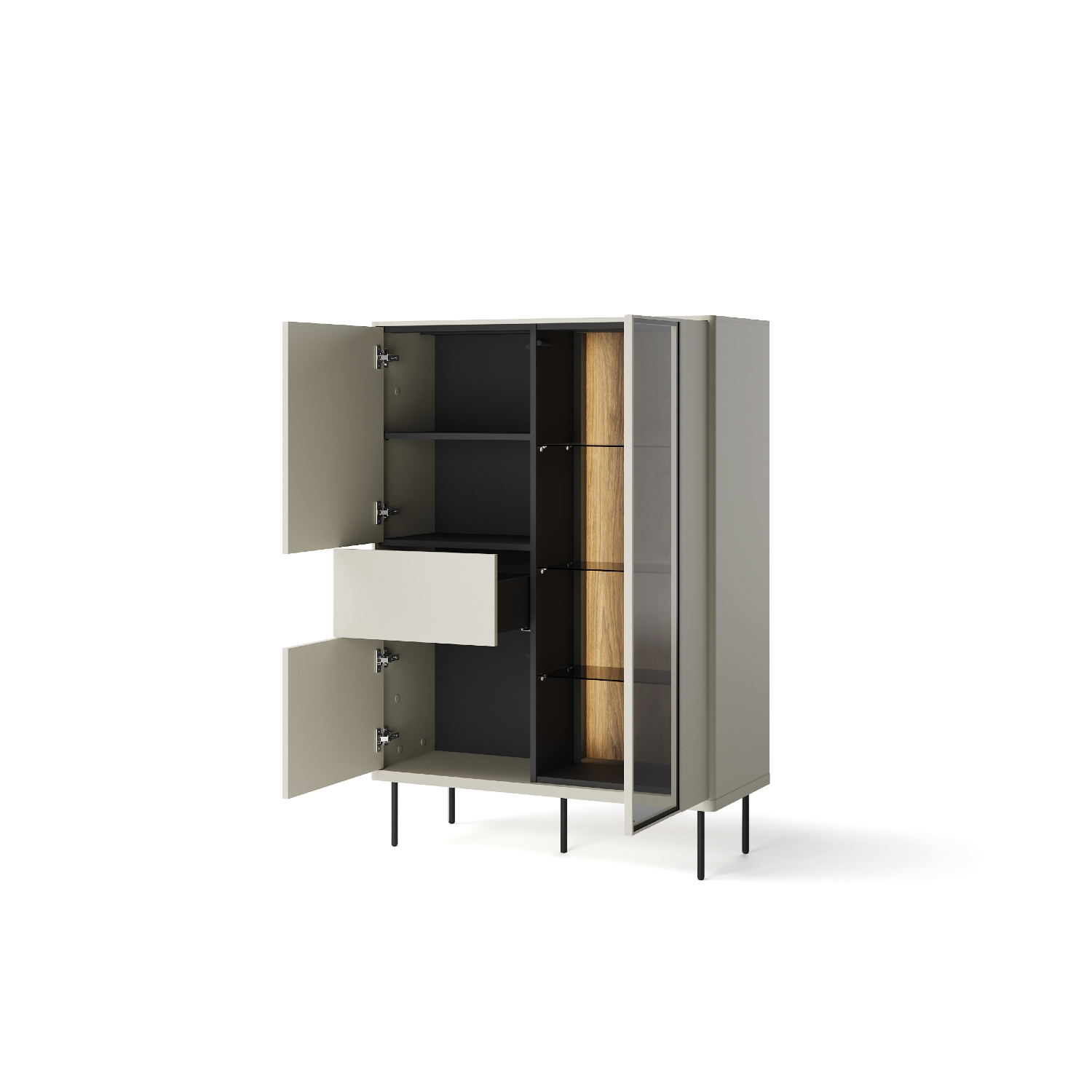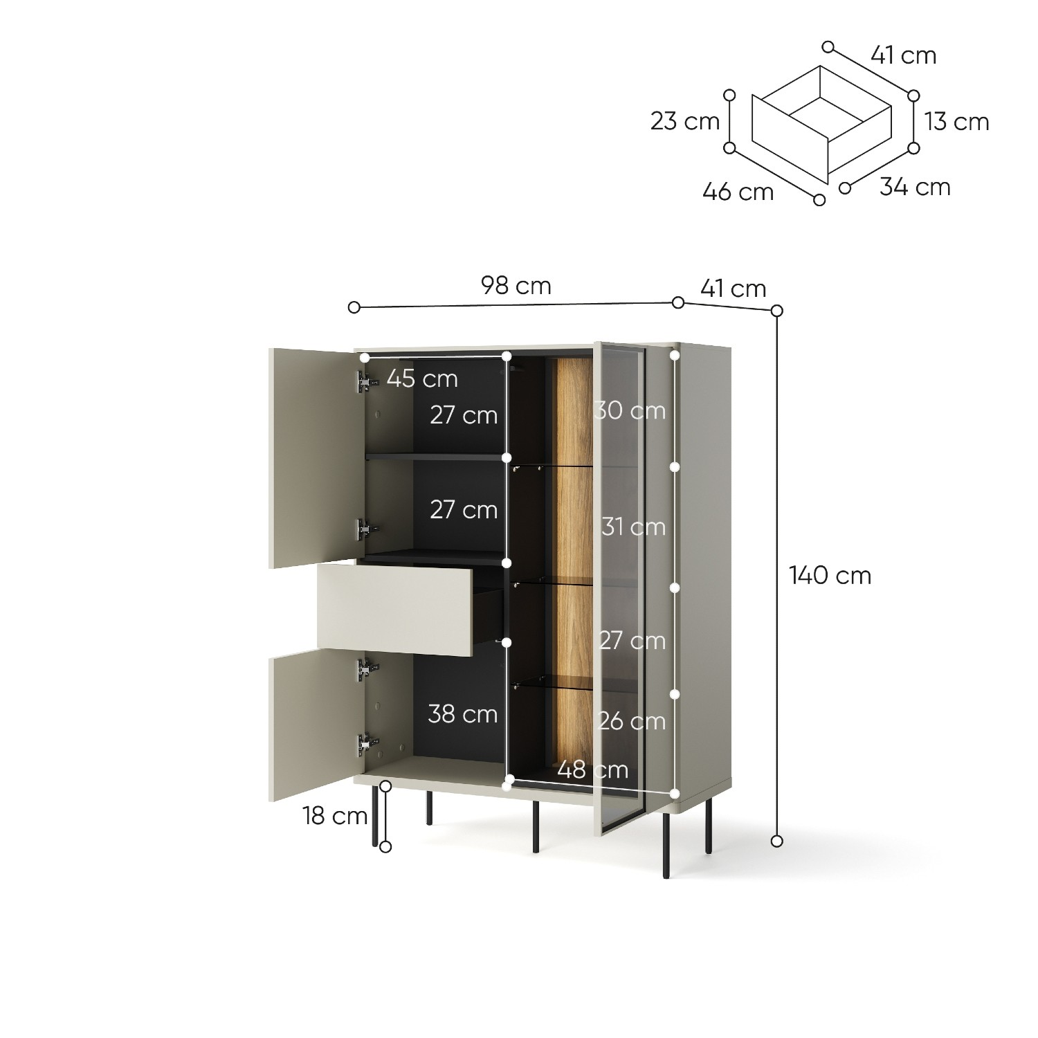 O comodă înaltă modernă cu sistem de iluminare pentru living este o combinație între estetică și funcționalitate. Datorită liniilor simple, designului minimalist și materialelor atent selectate, comoda înaltă cu iluminare cașmir/stejar Epiro se integrează perfect în interioarele moderne, oferindu-le un aspect elegant și stilat. Dacă doriți să creați un spațiu care să încânte oaspeții și să aducă armonie interiorului dvs., o comodă înaltă luminată modern este o soluție care nu vă va dezamăgi. Funcționalitate și organizare la cel mai înalt nivel: comodele înalte pentru living nu numai că arată frumos, dar sunt și foarte funcționale. Rafturile din sticlă vă permit să expuneți cele mai importante decorațiuni, cum ar fi porțelanul, suvenirurile de familie sau cărțile. Fiind închisă, comoda înaltă cu iluminare cașmir/stejar Epiro, se asigură că obiectele dvs. de valoare sunt protejate de praf și deteriorare și, în același timp, sunt întotdeauna la vedere. Lumina subtilă accentuează obiectele expuse în partea cu vitrină și conferă interiorului o senzație confortabilă, creând o atmosferă plăcută în timpul întâlnirilor de seară.