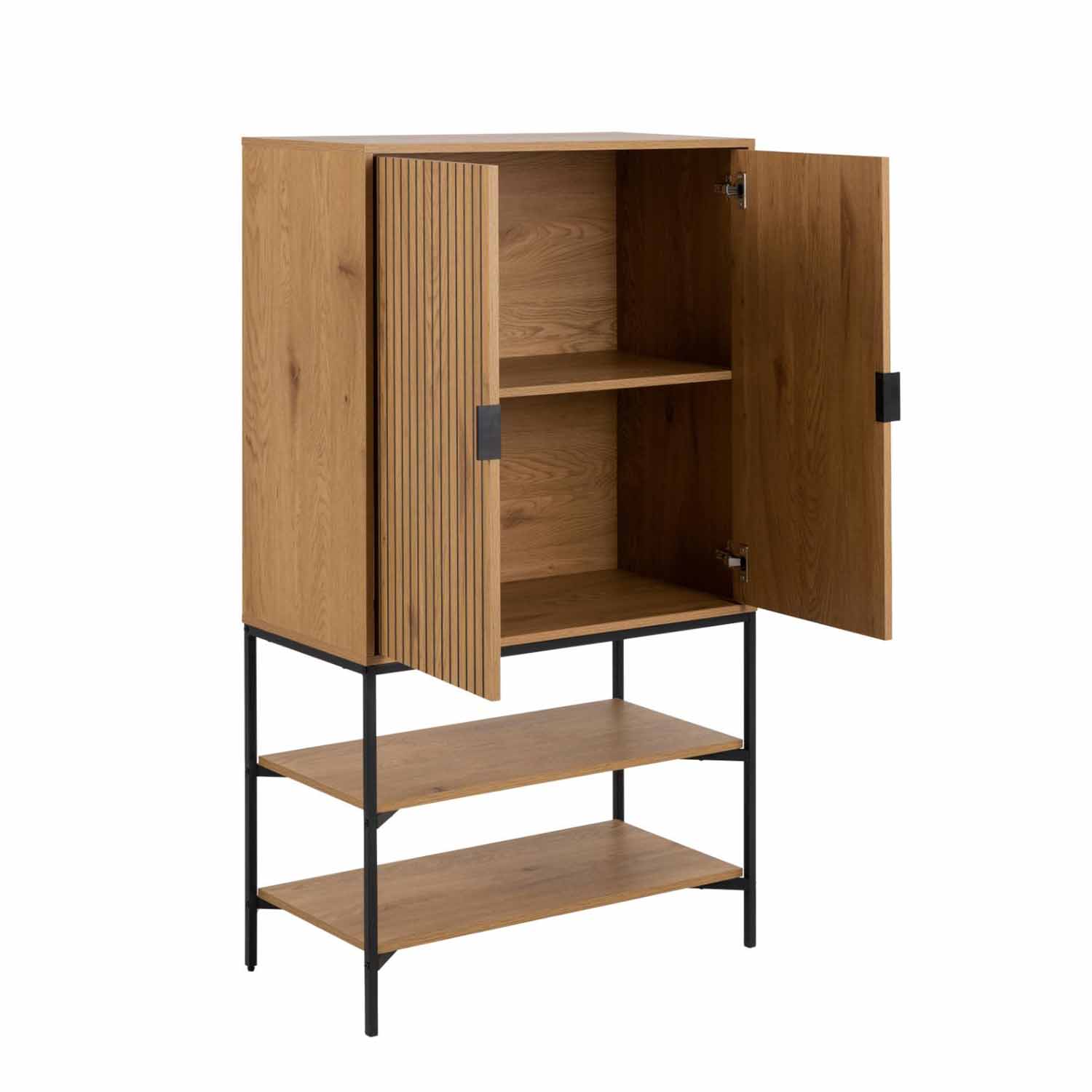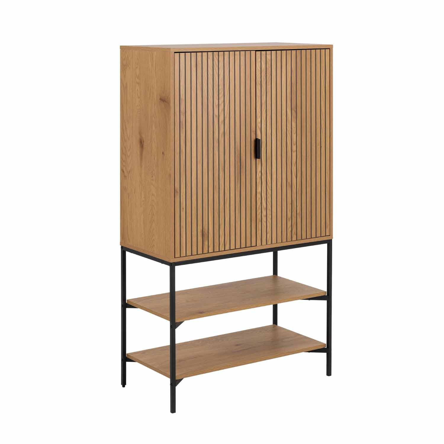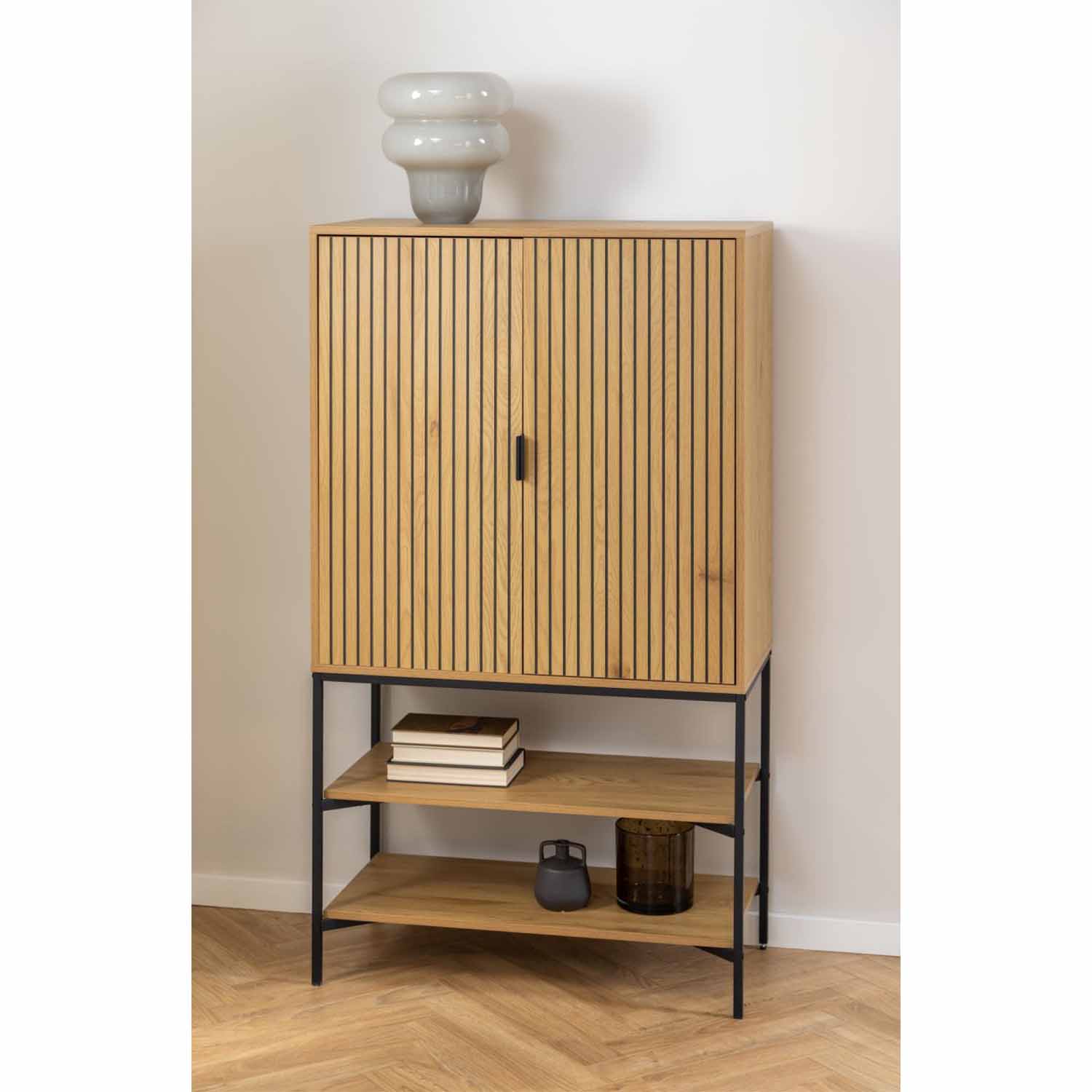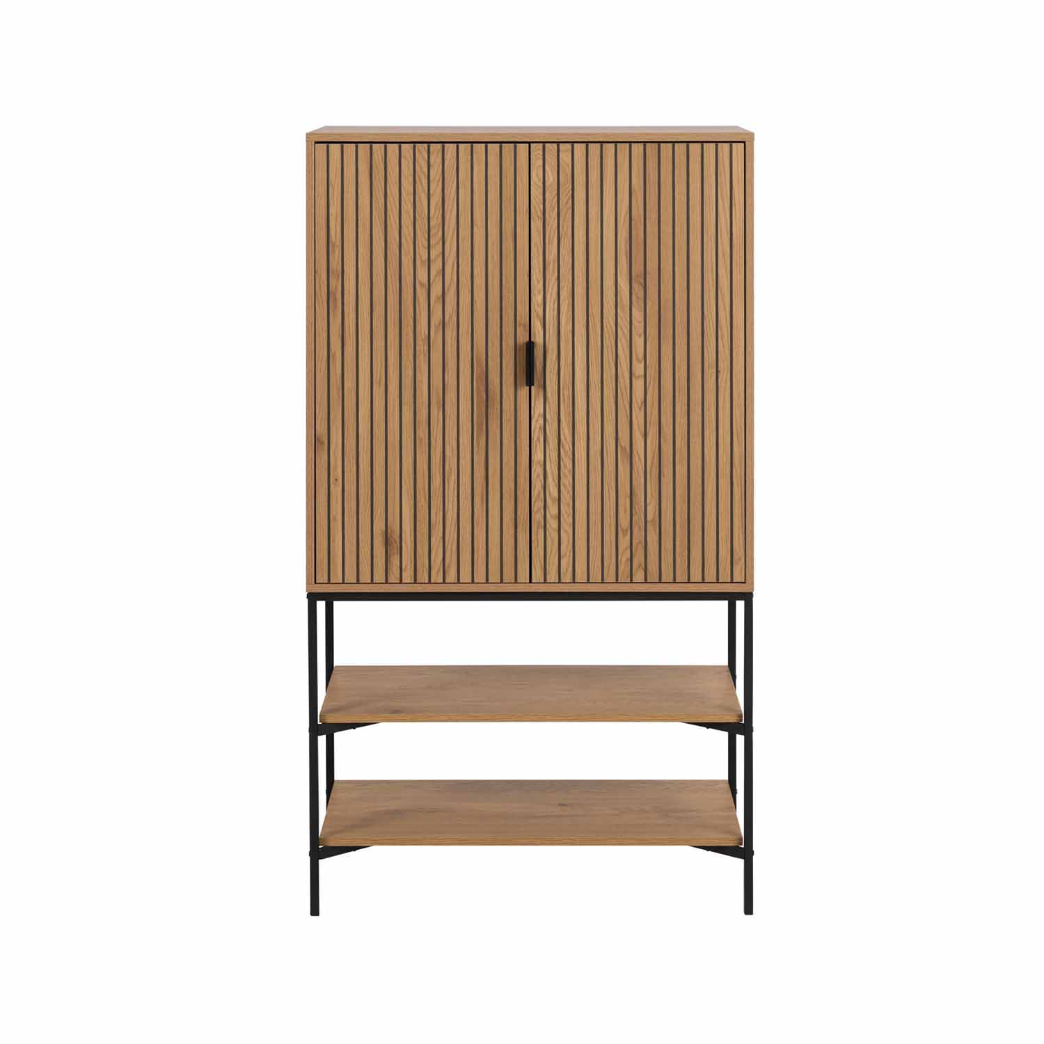 Dimensiuni: Lungime: 80 cmAdancime: 40 cmInaltime: 140 cmInaltime picioare: 58 cmSarcina maxim suportata: 21 kgGreutate produs: 34,8 kgNumar colete: 2 ( 1. 93,5 x 51,5 x 14,5 cm - 19,6 kg 2. 92 x 48,5 x 9,5 - 18,6 kg )Compartimentare: comoda inalta cu 2 usi si 2 polite exterioareMaterial: carcasa si top realizate din MDF melaminat cu decor de stejar salbatic; fronturi usi realizate din MDF melaminat cu decor de stejar salbatic cu lamele decorative dispuse vertical; polite realizate din MDF melaminat cu decor de stejar salbatic; baza si picioare realizate din otel vopsit negru Culoare: stejar salbatic