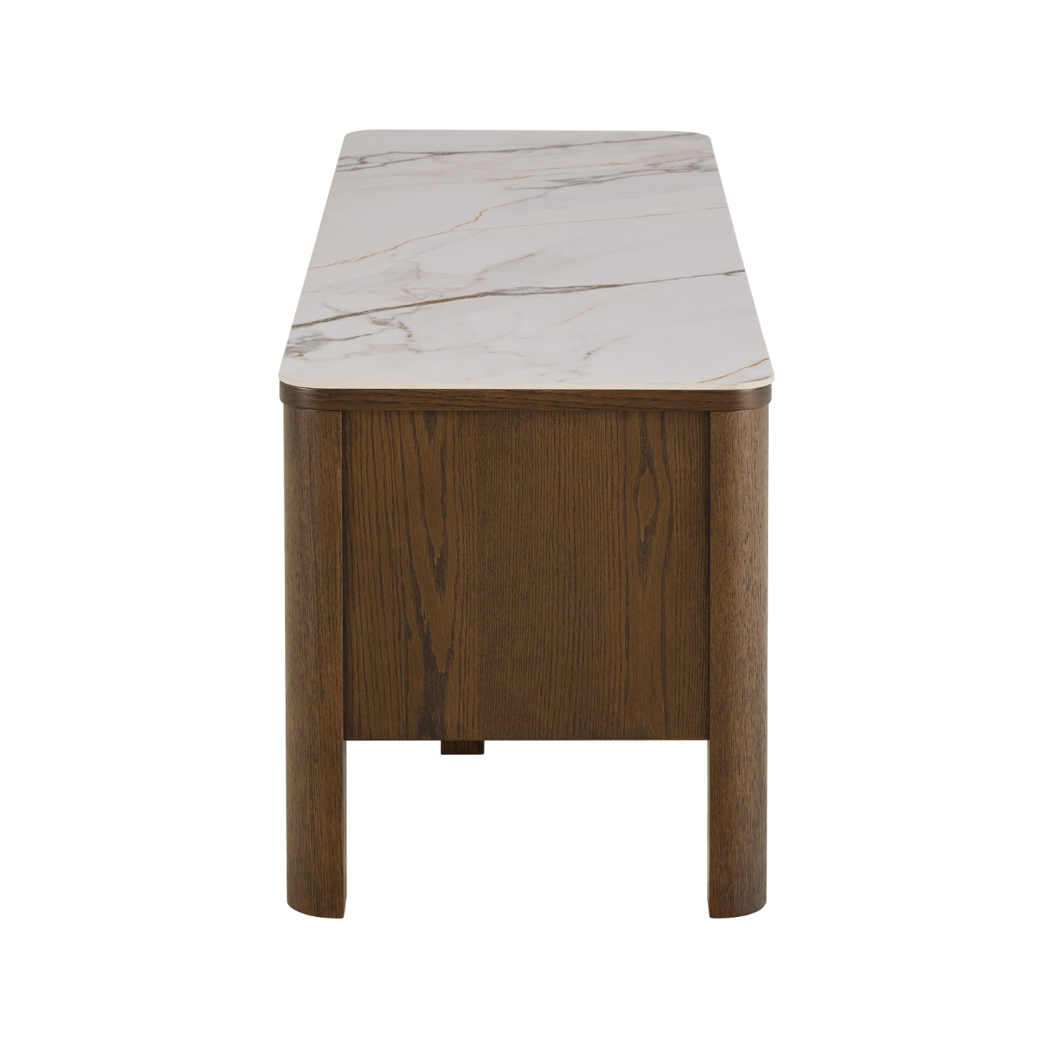 Adaugă un plus de eleganță și funcționalitate locuinței tale cu comoda TV cu 2 uși crem/stejar afumat Southampton realizată cu structură din MDF finisat cu furnir de stejar cu finisaj afumat de culoarea tabacului. Această comodă TV îmbină armonios noblețea furnirului de stejar afumat cu finețea ceramicii crem lustruite, creând un corp de mobilier ce emană eleganță atemporală. Nuanțele bogate ale lemnului în contrast cu textura delicată a blatului ceramic, decorat subtil, oferă o experiență vizuală ce trezește simțurile și adaugă profunzime oricărui spațiu. Structura solidă a comodei TV cu 2 uși crem/stejar afumat Southampton garantează durabilitate în timp, iar sistemul de închidere silențioasă aduce un plus de confort în utilizarea zilnică. Compartimentarea interioară cu 2 uși și 2 nișe este practică și versatilă și permite păstrarea ordonată a lucrurilor. Cele 2 polițe sunt perfecte pentru depozitarea pe rafturi a unor obiecte mici, lenjerii sau accesorii sezoniere. Cu aspectul său modern, comoda TV cu 2 uși crem/stejar afumat Southampton devine o piesă centrală ce adaugă stil și ordine oricărui spațiu.