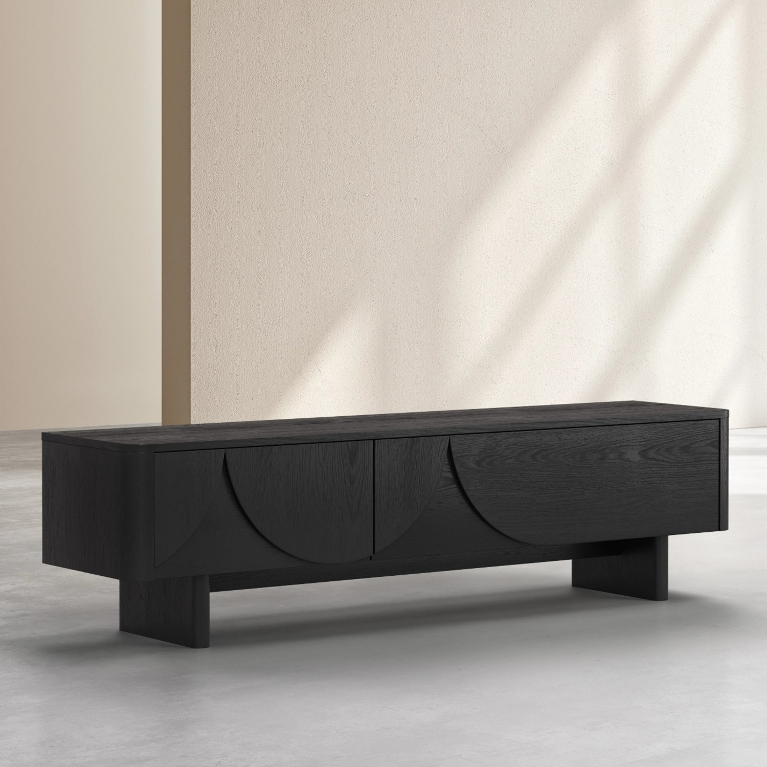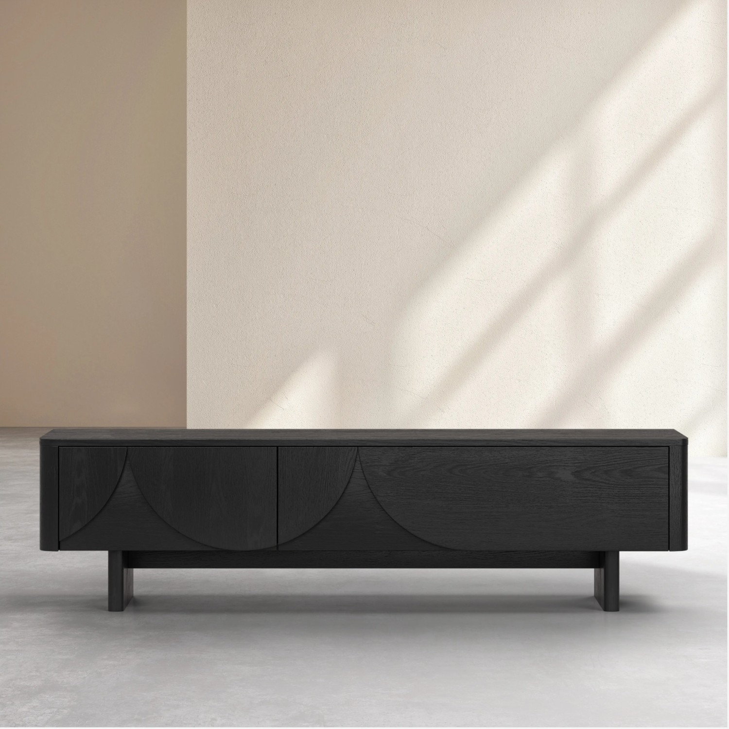 Adaugă eleganță și funcționalitate spațiului tău cu comoda TV cu 2 uși, lemn, negru, Amore un corp de mobilier premium, proiectat și fabricat în Europa. Realizată din furnir de stejar natural, această comodă TV se remarcă prin designul său contemporan inspirat din arhitectura mediteraneană, unde arcadele sculptate și colțurile rotunjite creează o armonie între estetică și funcționalitate.