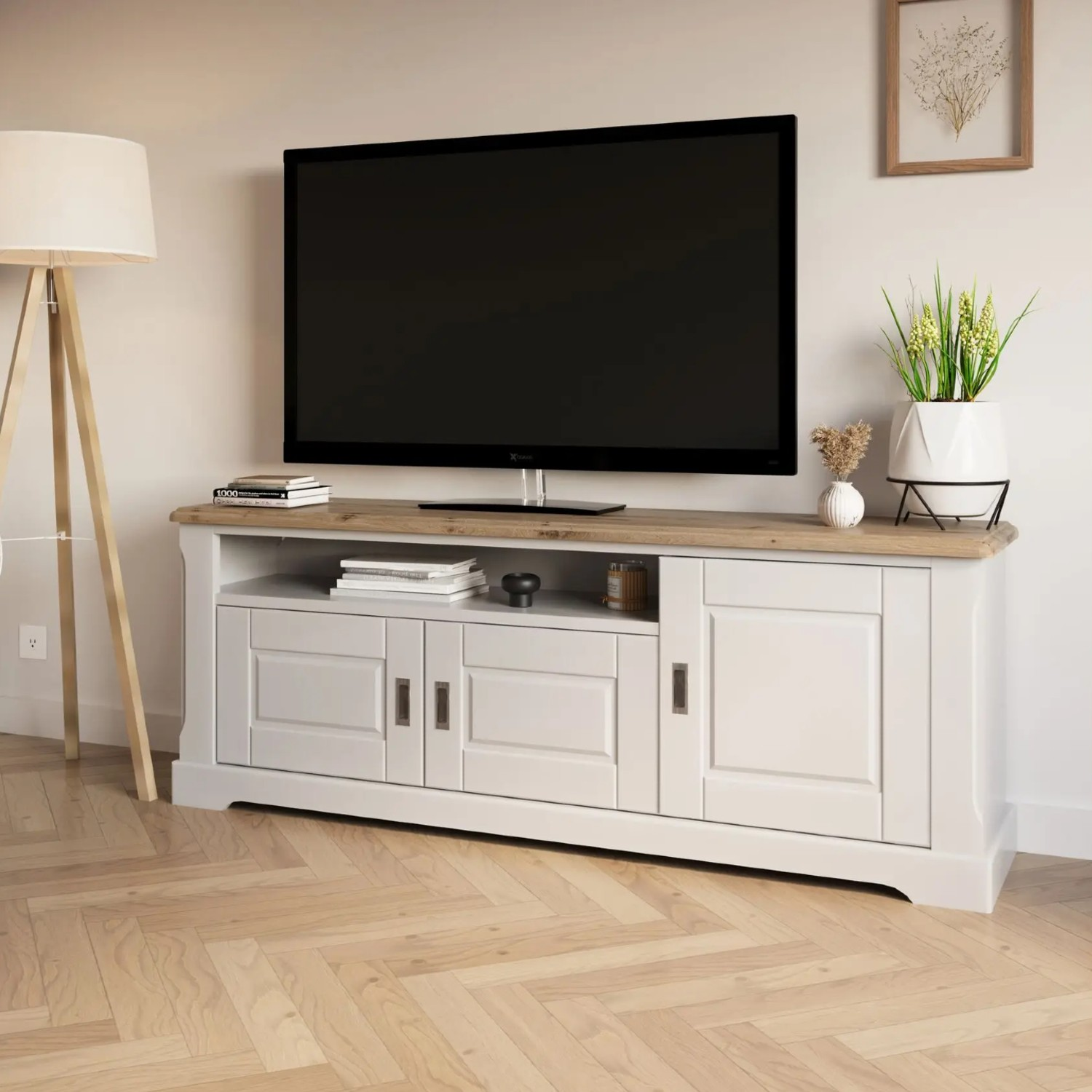 Comoda TV cu 3 usi alb/stejar natur Provence este o alegere perfecta pentru crearea unui interior luminos. Aceasta comoda completeaza colectia cu acelasi nume, o colectie realizata din materiale de inalta calitate, cu o combinatie de culori armonioasa si usor de integrat in diferite stiluri de design. Comoda TV cu 3 usi alb/stejar natur Provence ofera spatii de depozitare in care va puteti depozita cabluri sau incarcatoare ori telecomenzi sau mici aparate electronice.