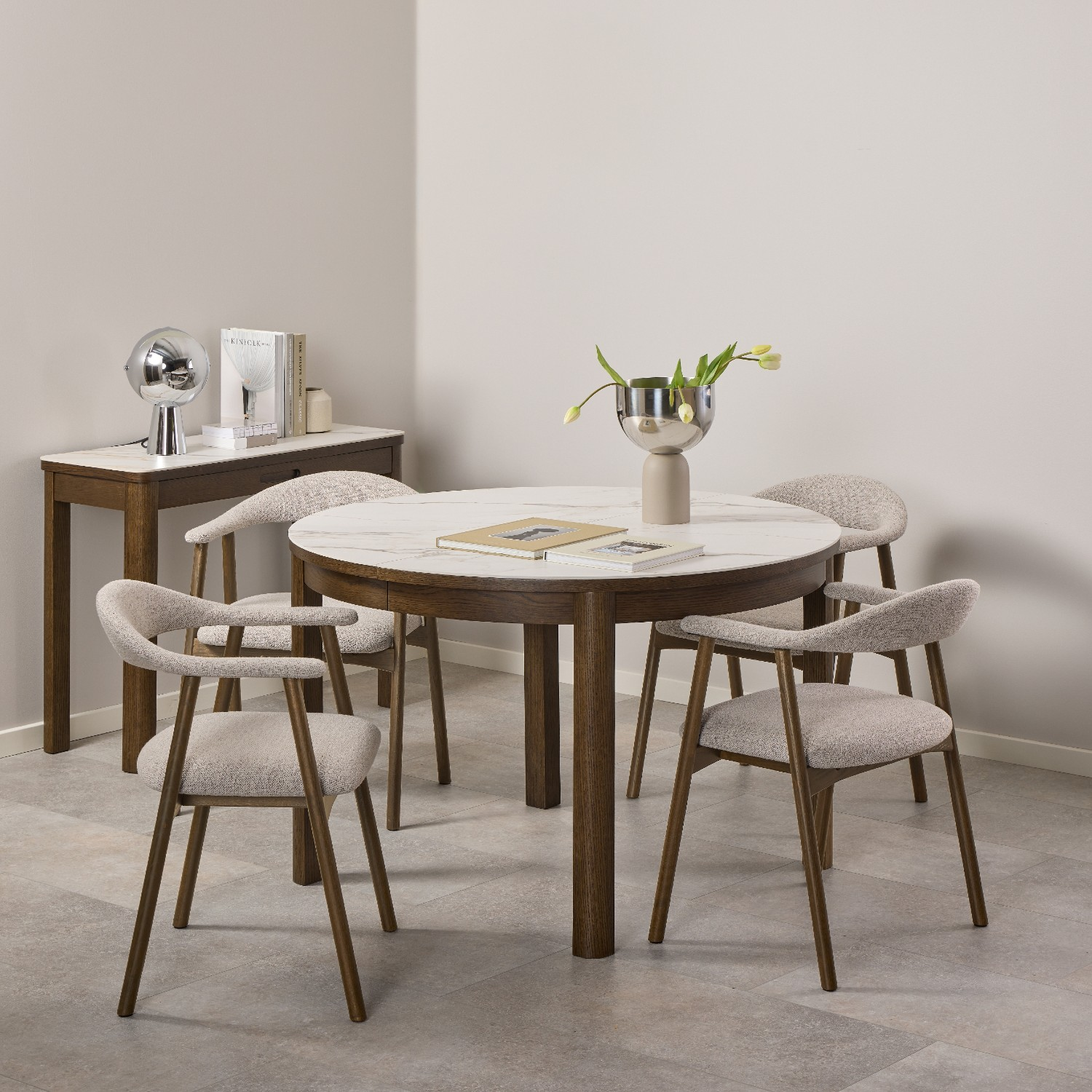 ✔️ Blat din placă ceramică crem lustruită – aspect premium, cu vene delicate care adaugă profunzime vizuală