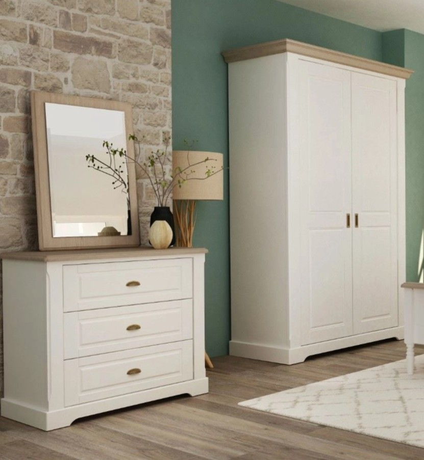 Dulapul cu 2 usi alb/stejar natur Provence completeaza mobilierul de dormitor cu acelasi nume. Dulapul cu 2 usi are carcasa din placi aglomerate melaminate de culoare alba. Fronturile sunt realizate din MDF lacuit alb. Cornisa dulapului cu 2 usi alb/stejar natur Provence este din lemn masiv de stejar, iar manerele metalice.
