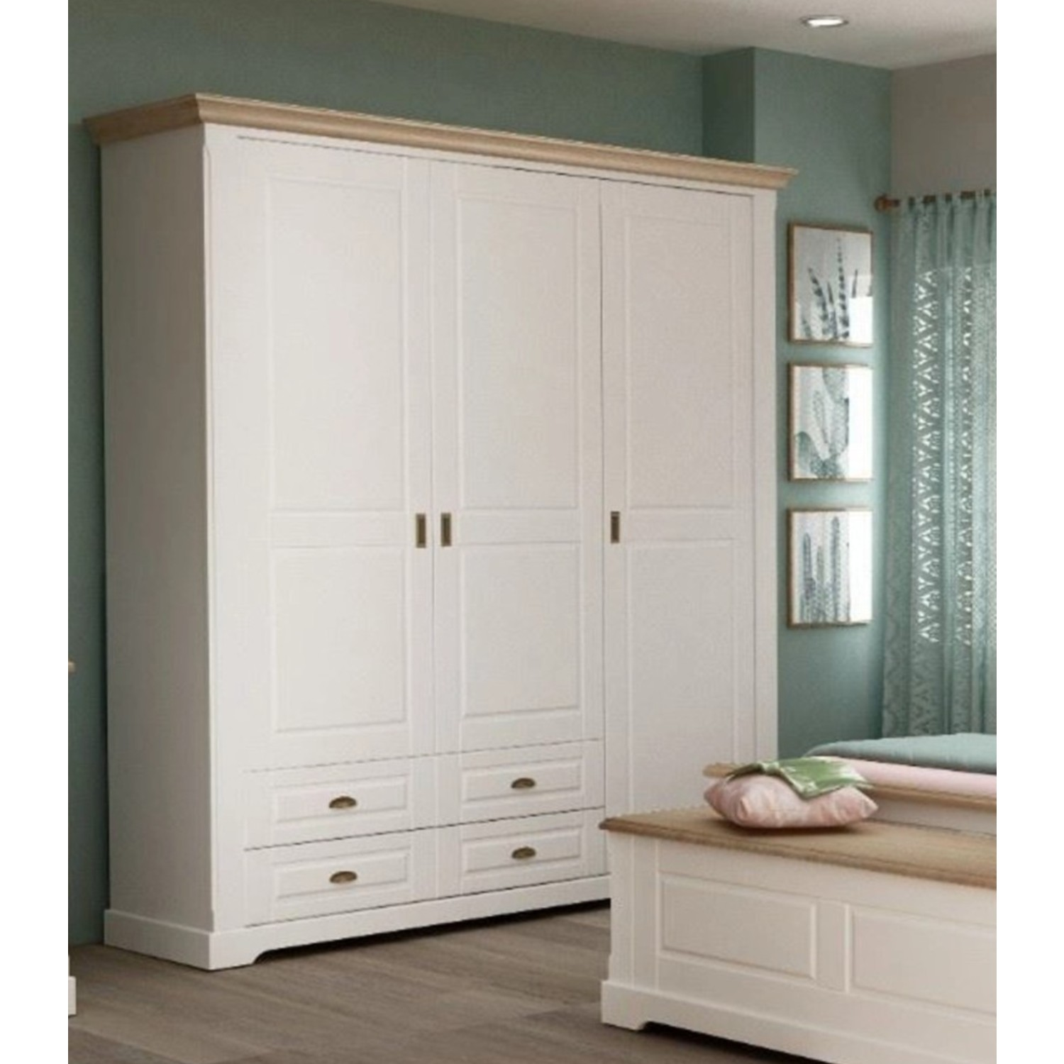 Dulapul cu 3 usi si 2 sertare alb/stejar natur Provence completeaza mobilierul de dormitor cu acelasi nume. Dulapul cu 3 usi si 2 sertare are carcasa din placi aglomerate melaminate de culoare alb. Fronturile sunt realizate din MDF lacuit alb. Cornisa dulapului cu 3 usi si 2 sertare alb/stejar natur Provence este din lemn masiv de stejar, iar manerele metalice. Dulapul cu 3 usi si 2 sertare alb/stejar natur Provence este o piesa de mobilier clasic, elegant, cu linii minimaliste. Albul dulapului asigura luminozitate incaperii si aminteste de atmosfera relaxanta a verii si de parfumul vacantei.