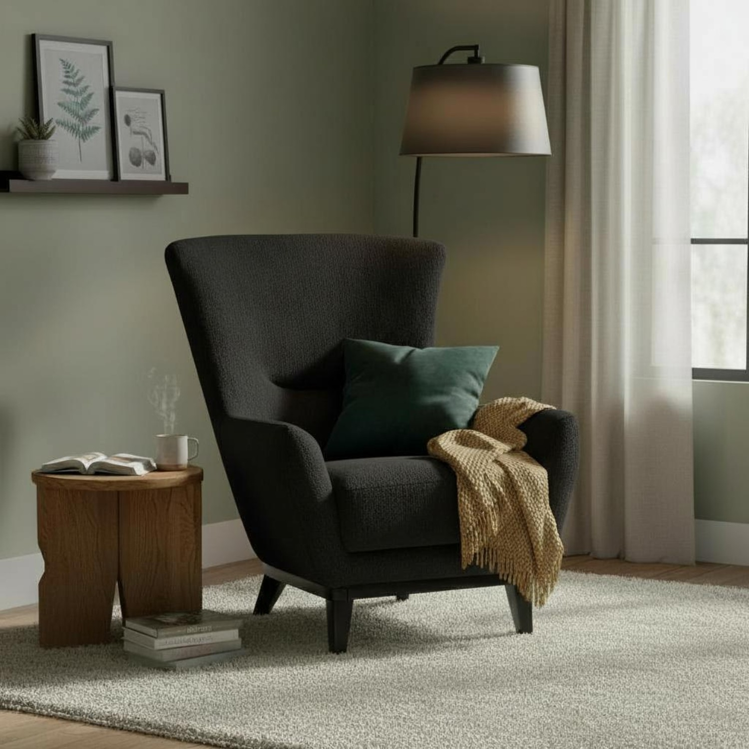 Fotoliul tapitat negru Rosco cu picioare din lemn vopsite negru incanta prin confort si prin forma sa ergonomica cu spatar inalt si laterale care cuprind silueta. Acest fotoliu modern cu linii curbate te invita la relaxare si la odihna dupa o zi obositoare. Sezutul adanc umplut cu spuma elastica asigura confort. Fotoliul tapitat negru Rosco cu picioare din lemn vopsite negru este realizat pe structura de lemn de fag, cu baza sub sezut usor vizibila si cu picioare inalte. Tapiteria din material textil de calitate este moale si placuta la atingere.