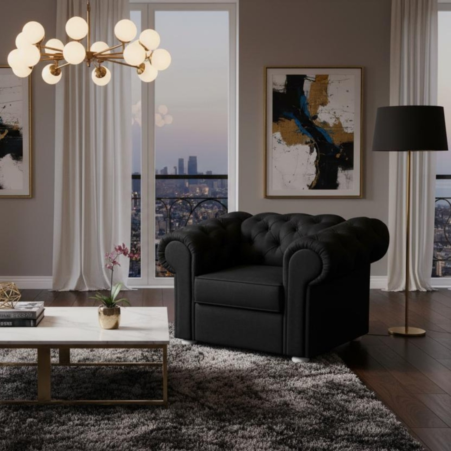 Fotoliu negru Valentino - un fotoliu realizat in stilul Chesterfield, devenit deja clasic in designul interior. Elegant si impunator, amintind de atmosfera saloanelor din casele nobiliare, acest fotoliu imprima personalitate incaperii in care se afla. Tapiteria din catifea si sezutul cu arcuri wave asigura eleganta si confort. Partea din spate a spatarului este si ea tapitata, astfel ca permite pozitionarea fotoliului negru Valentino in orice loc in incapere. Picioarele din lemn masiv vopsite alb permit integrarea usoara intr-o ambianta contemporana. Fotoliul negru Valentino impreuna cu canapelele de 2 si 3 locuri Valentino de aceeasi culoare formeaza un set de living in stil Chesterfield care devine punctul central al camerei.
