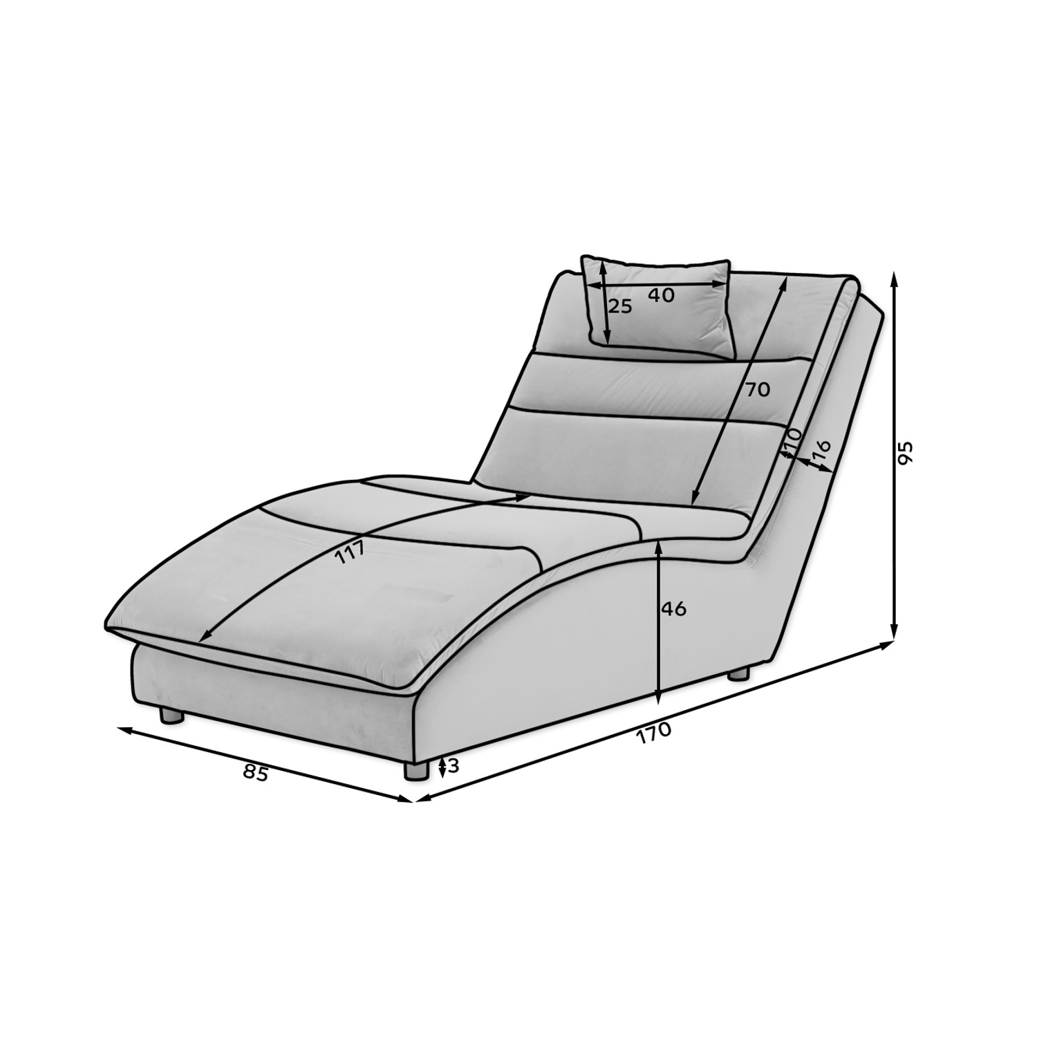 Material: fotoliu sezlong cu structura din lemn masiv, sezut si spatar cu umplutura cu spuma HR flexibila; textil din catifea (Inari 22); picioare din plastic