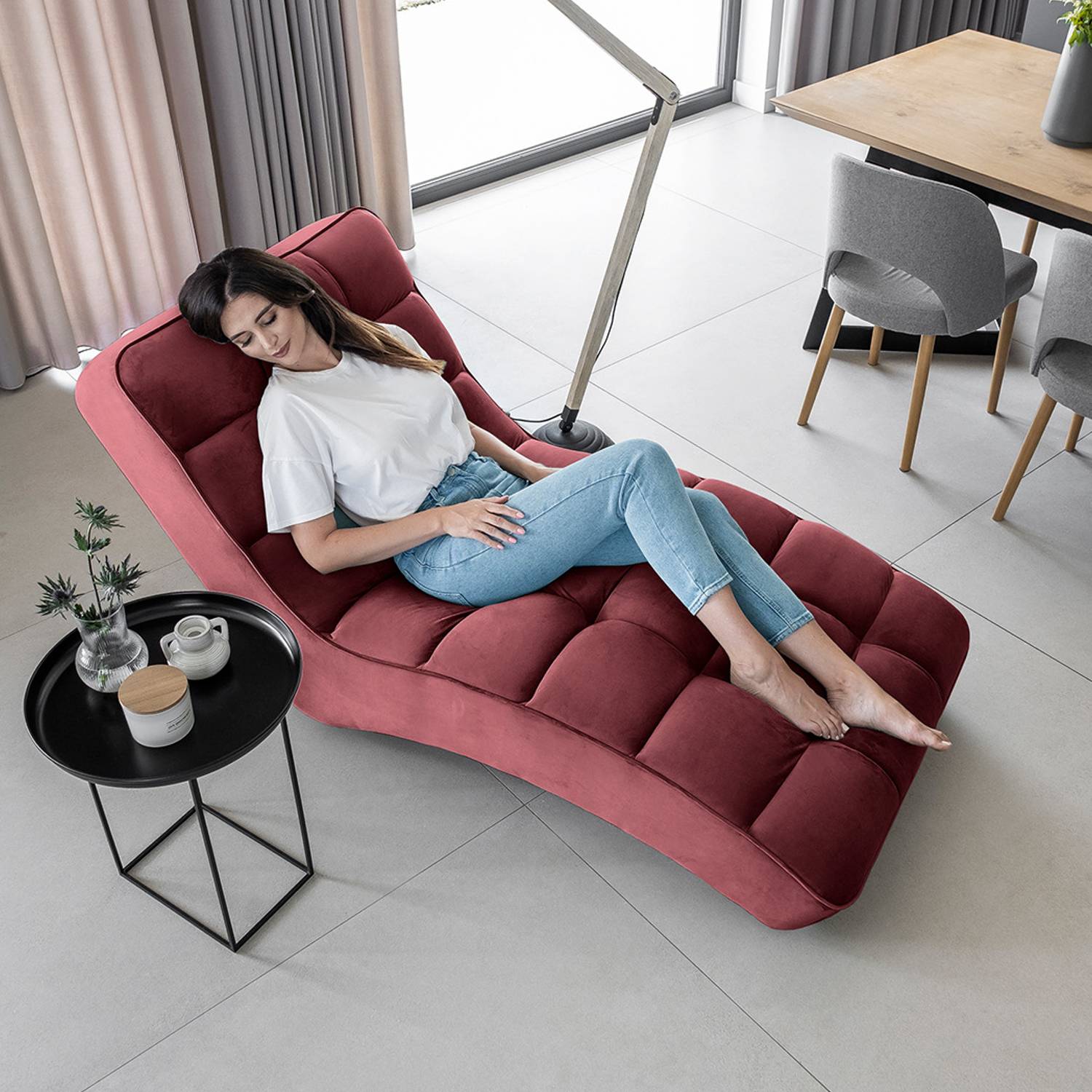 Fotoliul sezlong tapitat cu textil visiniu Loren este combinatia perfecta dintre design, confort si lux. O singura privire este suficienta pentru a atrage atentia, dar si pentru a te indragosti de acest sezlong pentru totdeauna. Bazat pe un cadru robust, sezlongul tapitat cu textil visiniu Loren are o silueta perfecta cu spatar complet, sezut conturat si picioare de 4 cm. Sezutul si spatarul cu umplutura cu spuma HR foarte elastica ofera confort si sustinere, dar cusaturile decorative si formele patrate ii confera un aspect special. Pentru ca relaxarea este un aspect important al vietii, uneori merita sa te retragi in timp ce asculti muzica sau cu o carte sau un ziar intr-un loc creat special pentru tine. Fotoliul sezlong tapitat cu textil visiniu Loren poate fi adaugat la mobilierul lounge din sufragerie, iar dimensiunile sale va permit sa va odihniti atat in pozitia stand, cat si intins. Cu sezlongul pentru living tapitat cu textil visiniu Loren poti petrece comod si relaxat ore intregi.