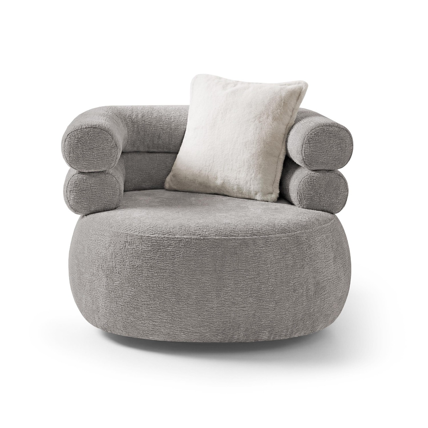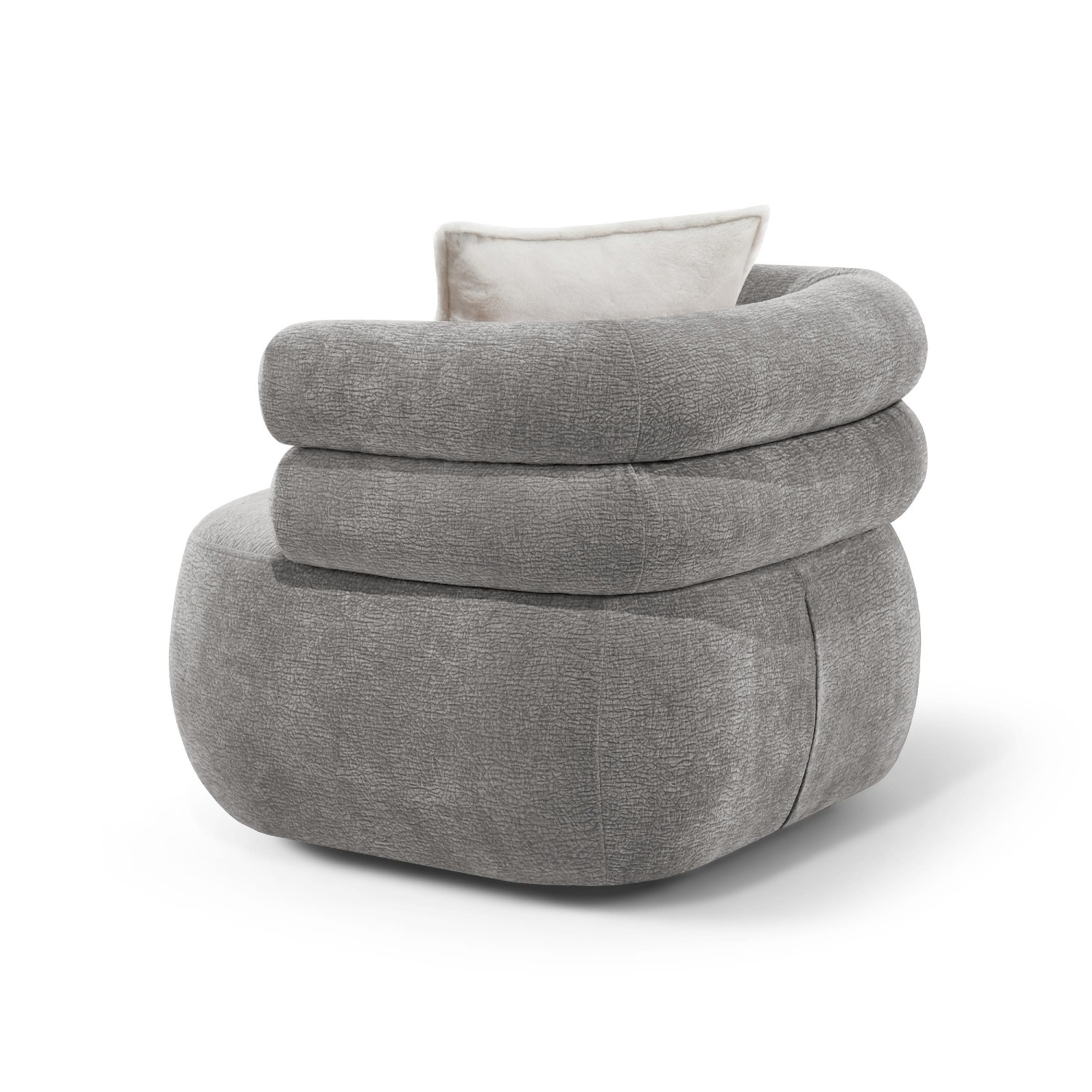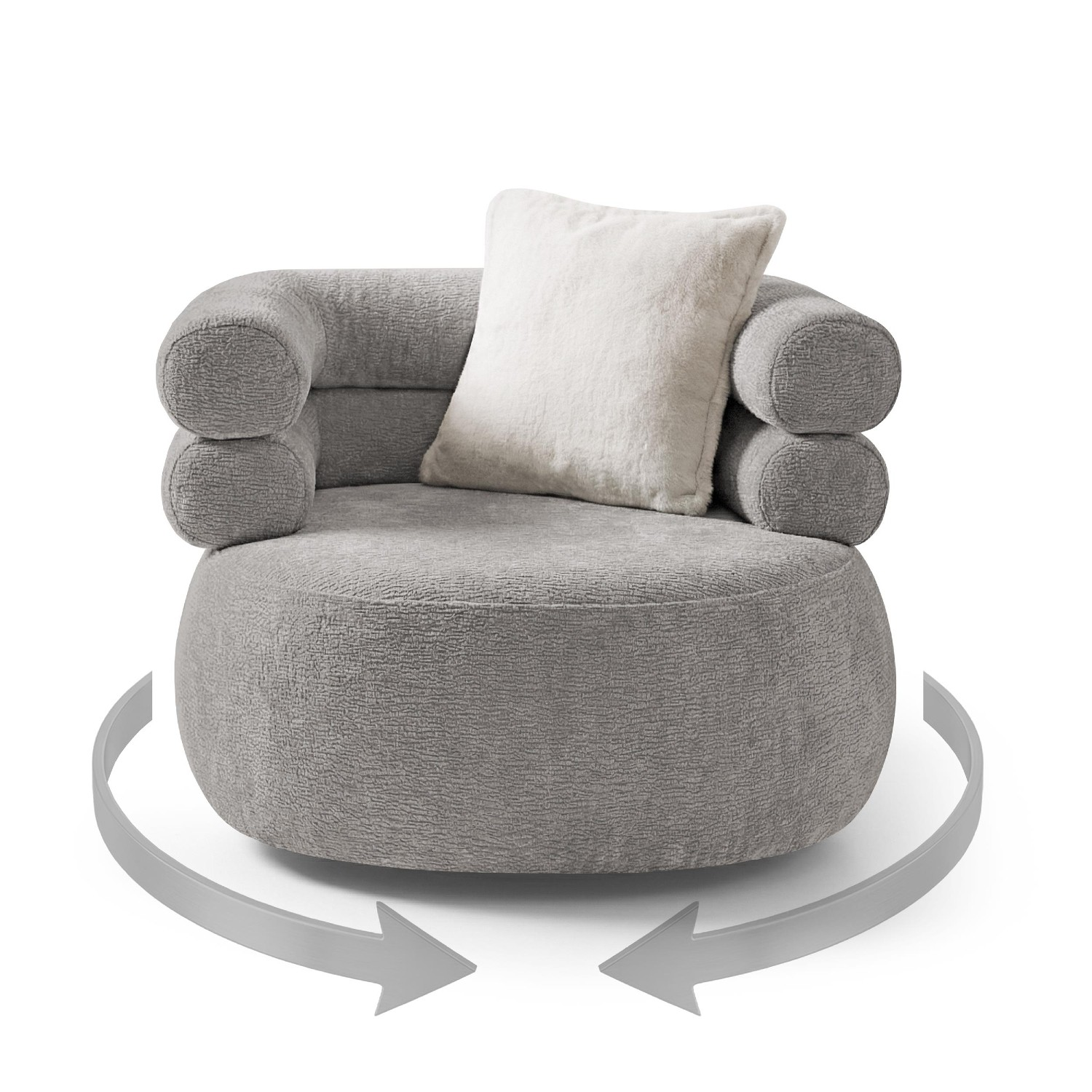 Fotoliul tapițat rotativ gri Nela se livrează însoțit de o pernă decorativă care completează armonios designul și oferă un plus de confort.
