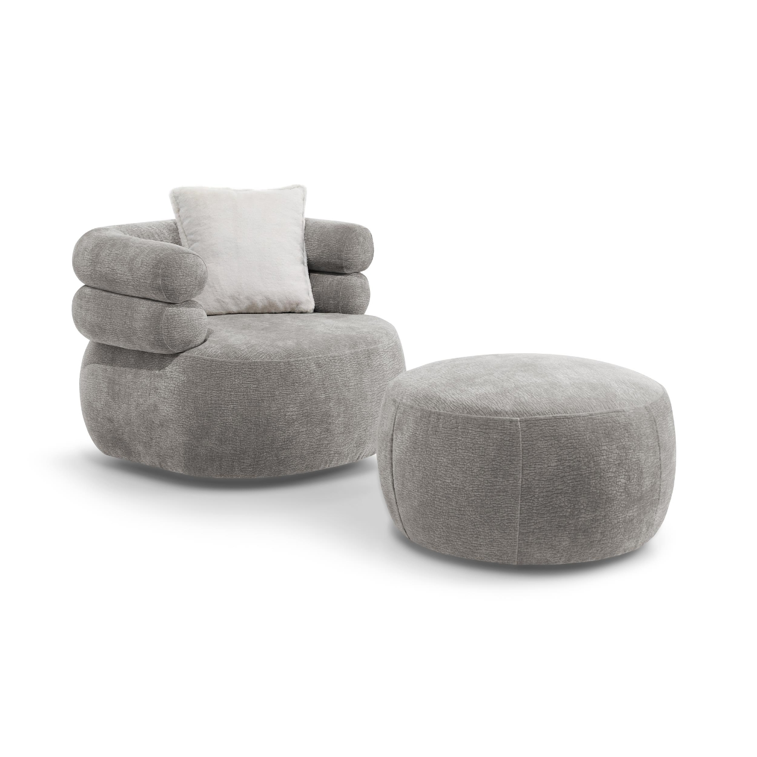 Forma sa rotunjită și elegantă, împreună cu spătarul conturat ergonomic, creează un efect vizual sofisticat și asigură un confort superior pentru momentele de relaxare. Baza rotativă permite o mișcare fluidă la 360°, fiind ideală atât pentru living, dormitor, birou sau spații de tip lounge.
