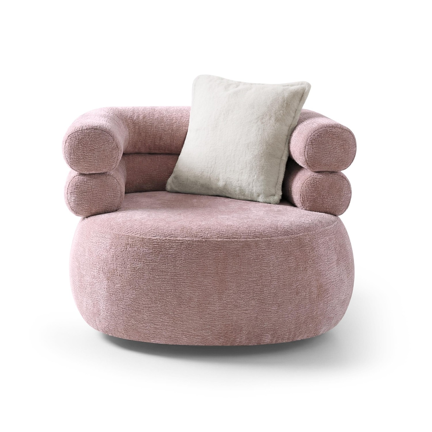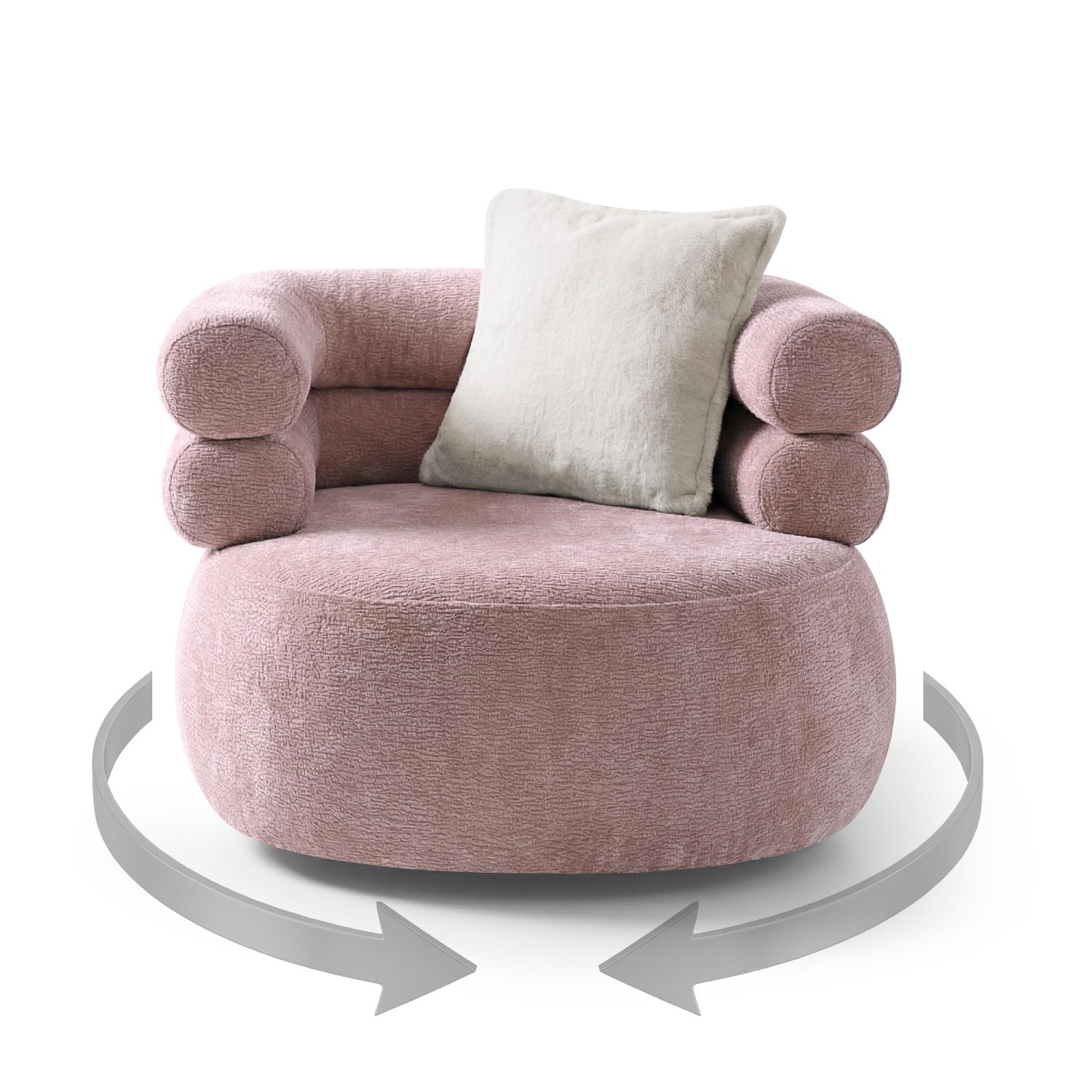 Fotoliul tapițat rotativ roz Nela se livrează însoțit de o pernă decorativă care completează armonios designul și oferă un plus de confort.