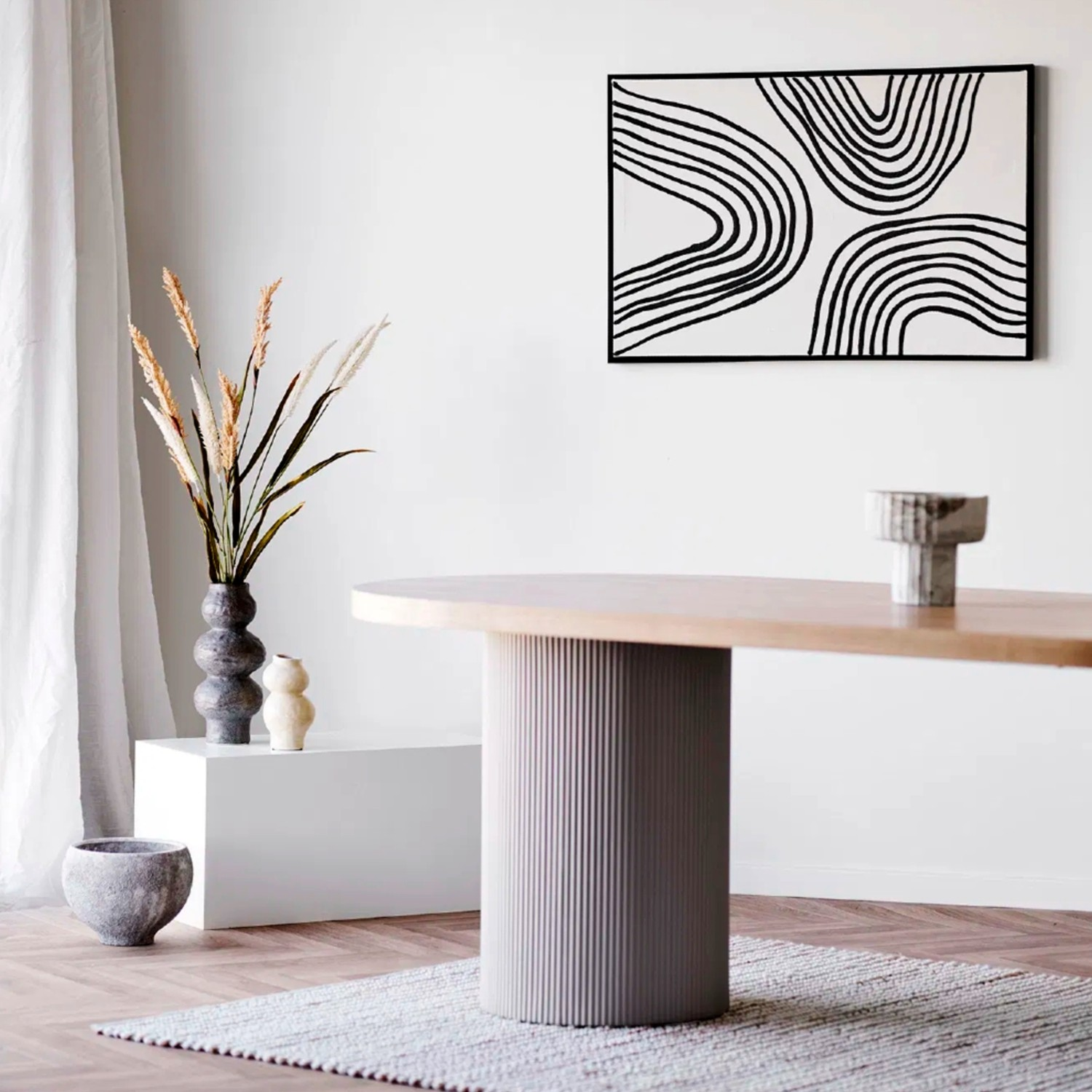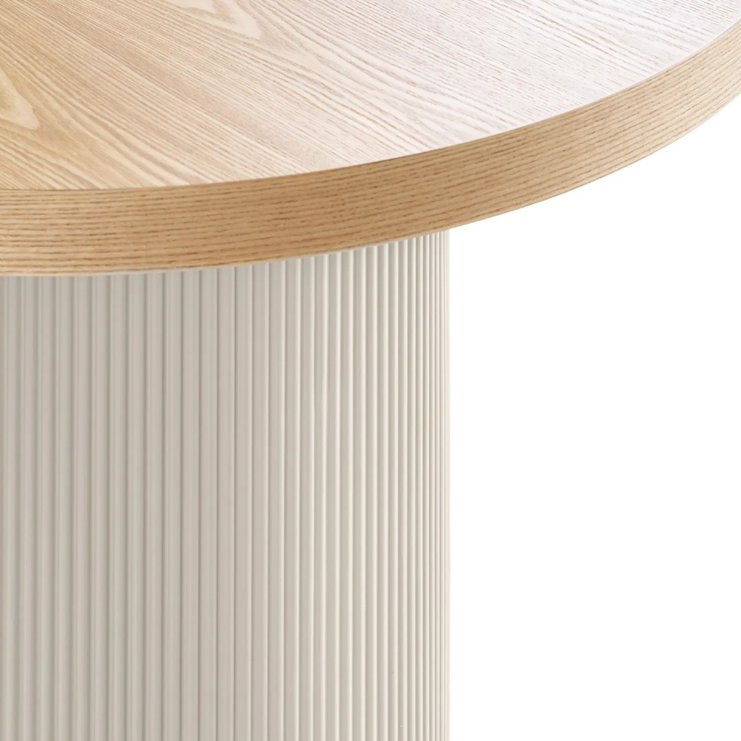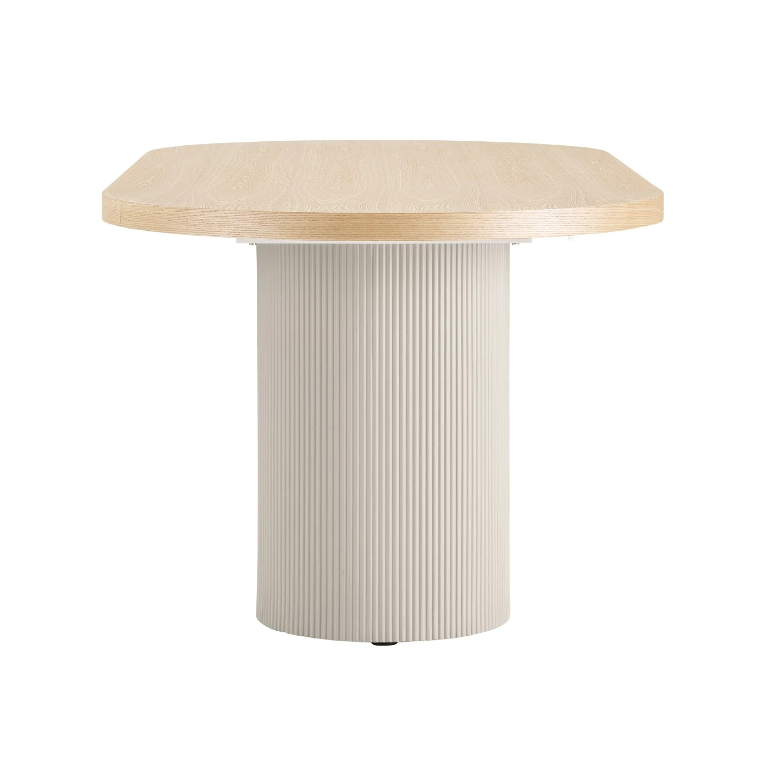Aspect modern; blat din MDF cu furnir de frasin naturPicioare decorative in forma cilindrica din MDF cu finisaj in culoarea bej casmirAsigura asezarea confortabila pentru 8 -10 persoaneMateriale de calitate usor de intretinut