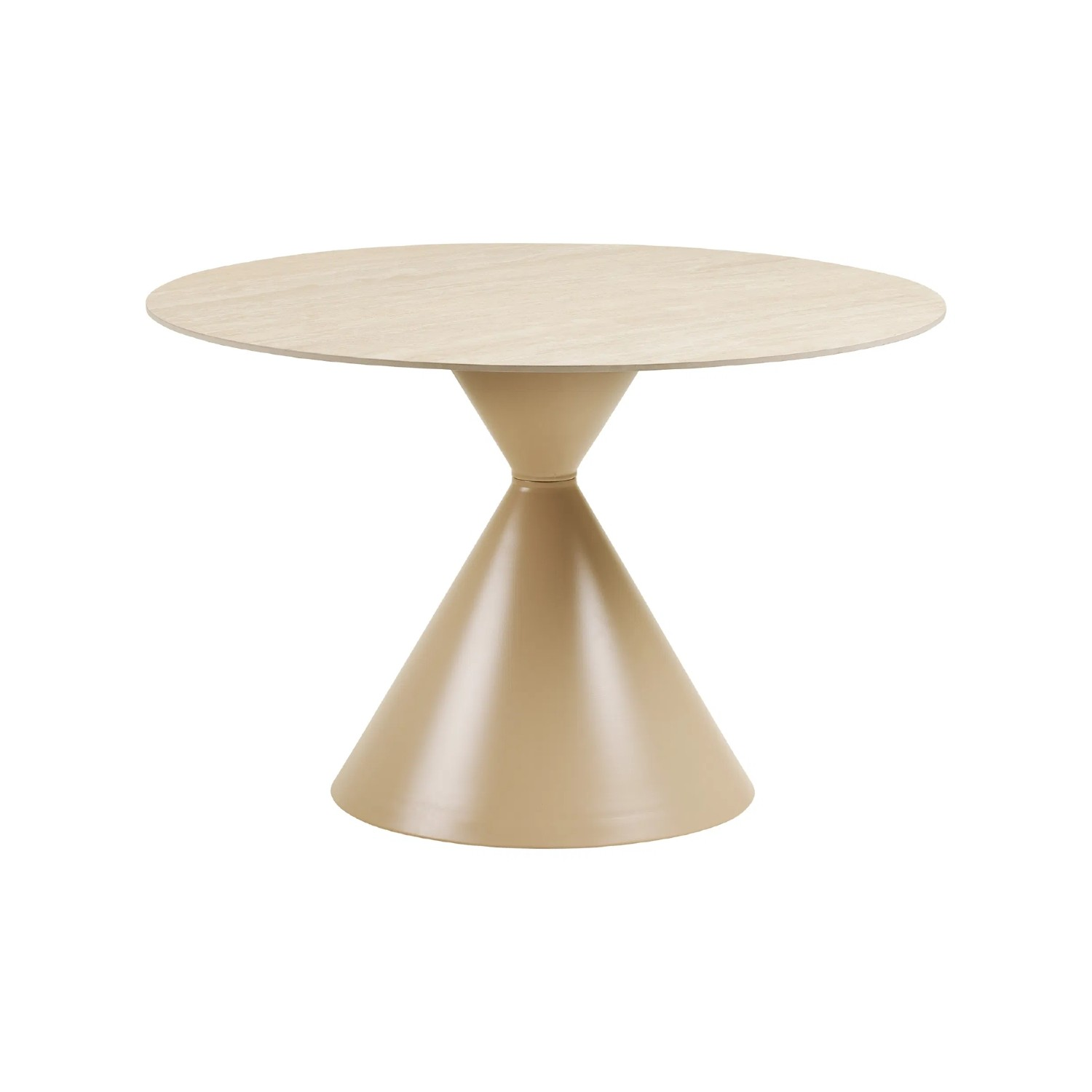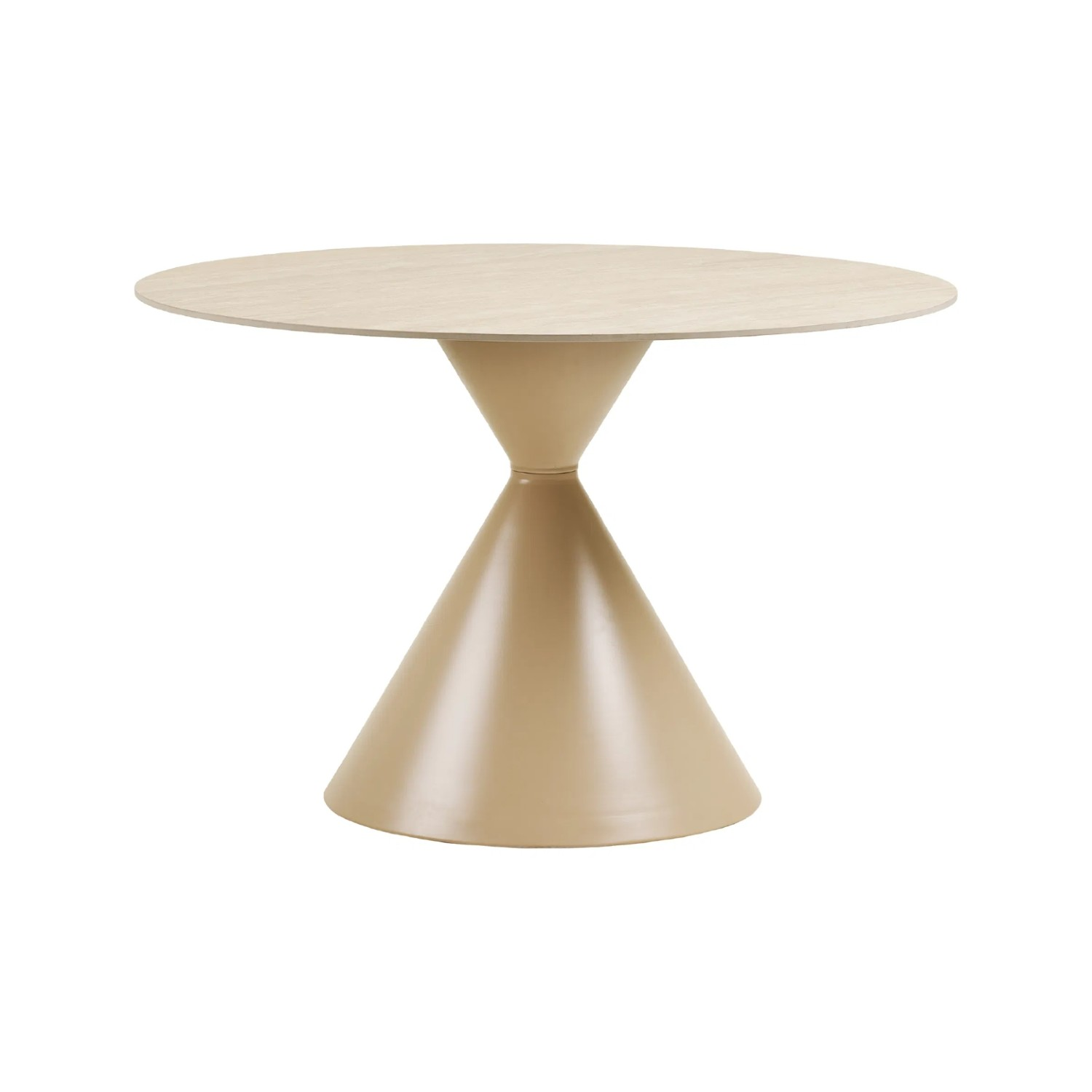 Adaugă un plus de rafinament și stil contemporan sufrageriei tale cu masa de dining rotundă 120 cm sand Annecy, o piesă de mobilier elegantă, concepută pentru interioare moderne. Designul minimalist este pus în valoare de piciorul metalic tip clepsidră, format din două conuri, vopsit într-o nuanță sofisticată sand, ușor de integrat în diverse scheme cromatice.