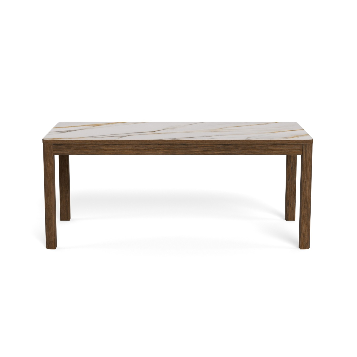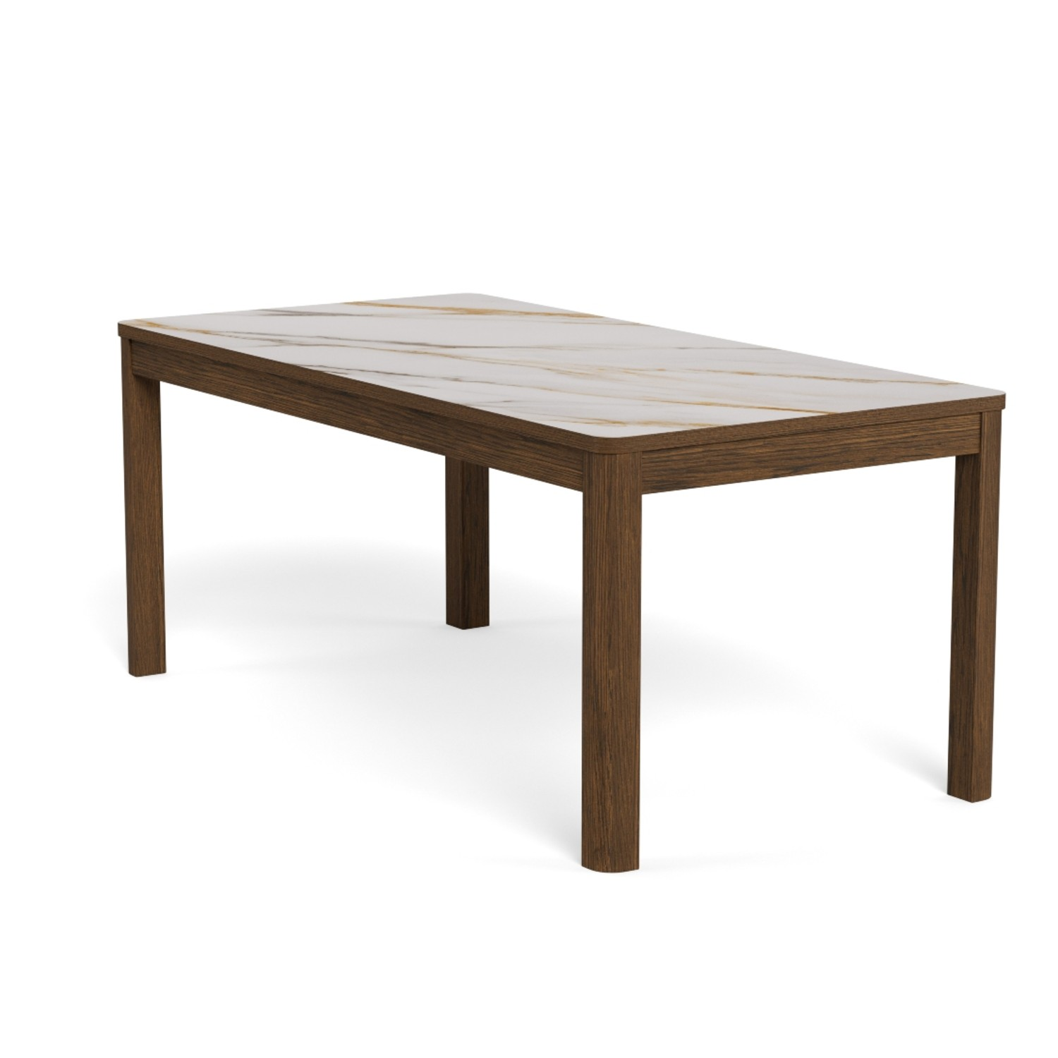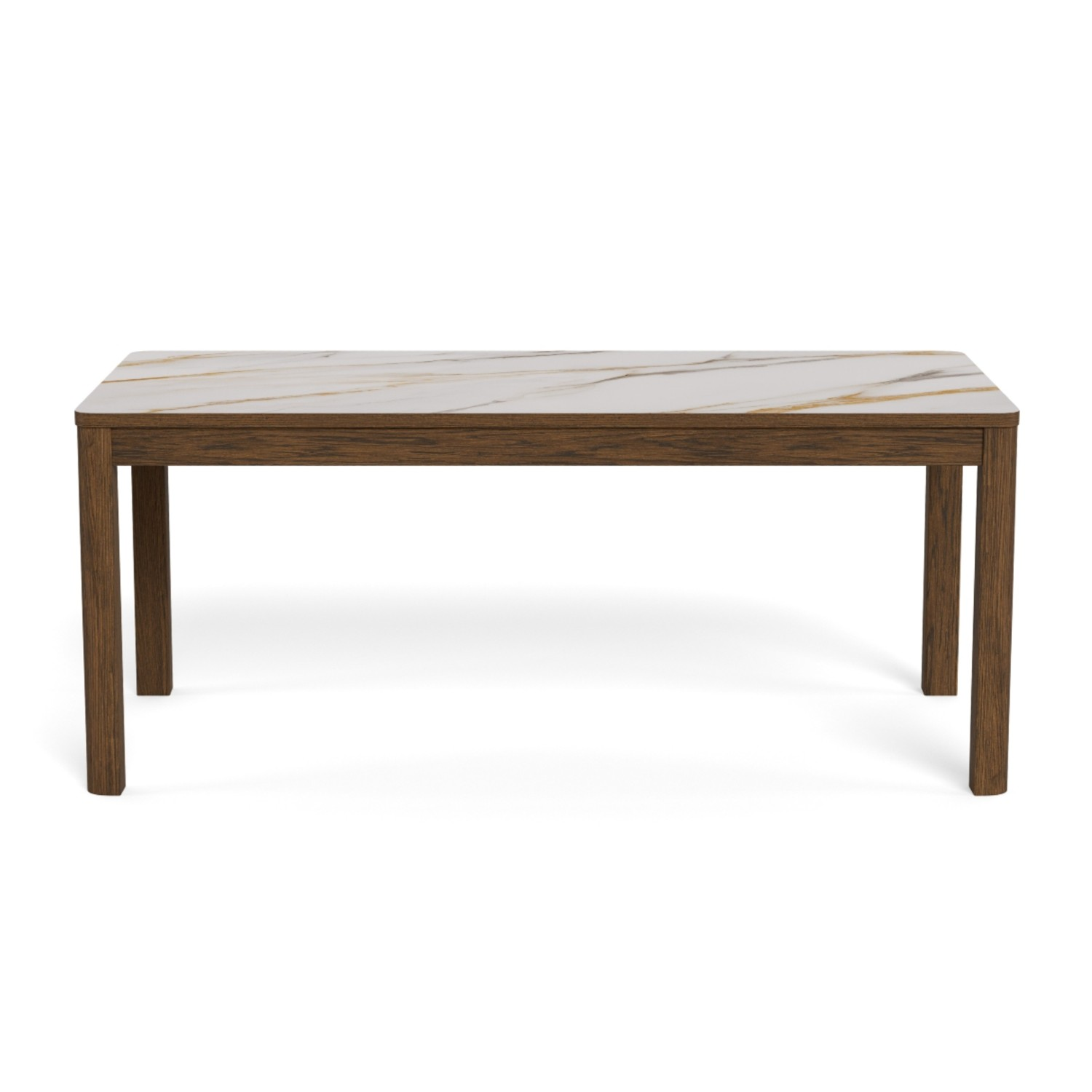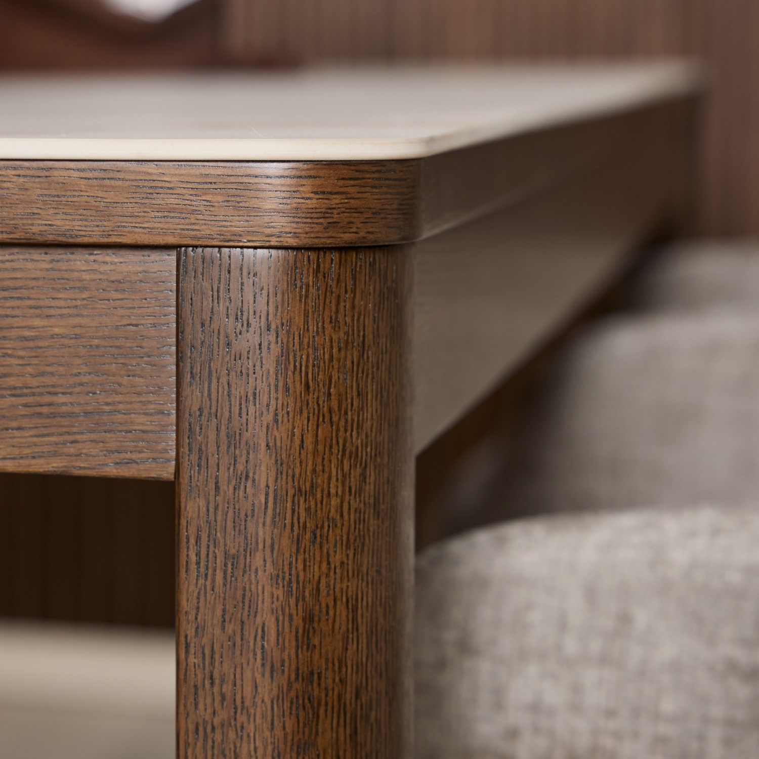 Blatul dreptunghiular, realizat din ceramică rezistentă la căldură, zgârieturi și pete, este ușor de întreținut și își păstrează aspectul impecabil în timp. Picioarele pătrate, robuste, din furnir de stejar afumat lăcuit, oferă stabilitate și un accent natural, echilibrând perfect rafinamentul ceramicii cu căldura lemnului.