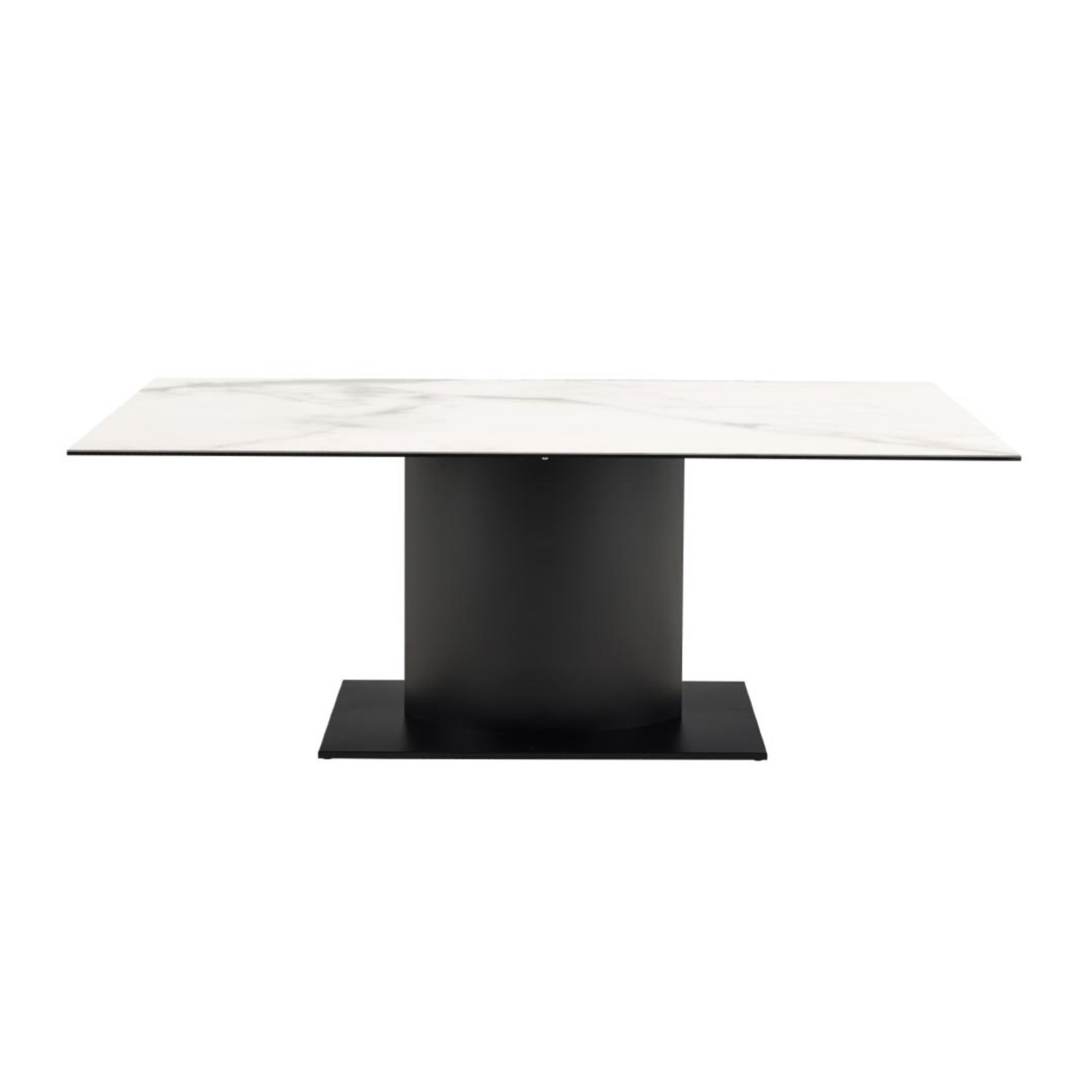 Designul mesei fixe 200 cm cu blat ceramic alb Marbella este completat de un picior central robust și o talpă solidă, ambele realizate din oțel vopsit în negru, un contrast elegant care pune în valoare textura și luminozitatea blatului. Această structură centralizată asigură stabilitate excelentă, dar și libertate de mișcare, oferind loc amplu pentru scaune și o ergonomie superioară.