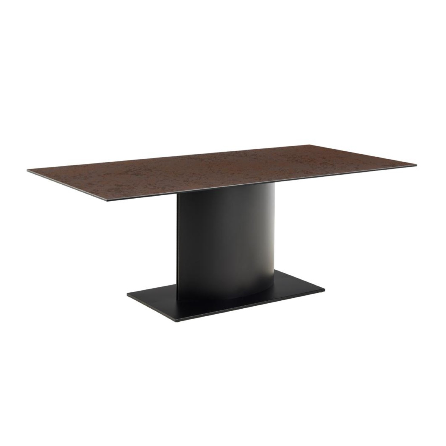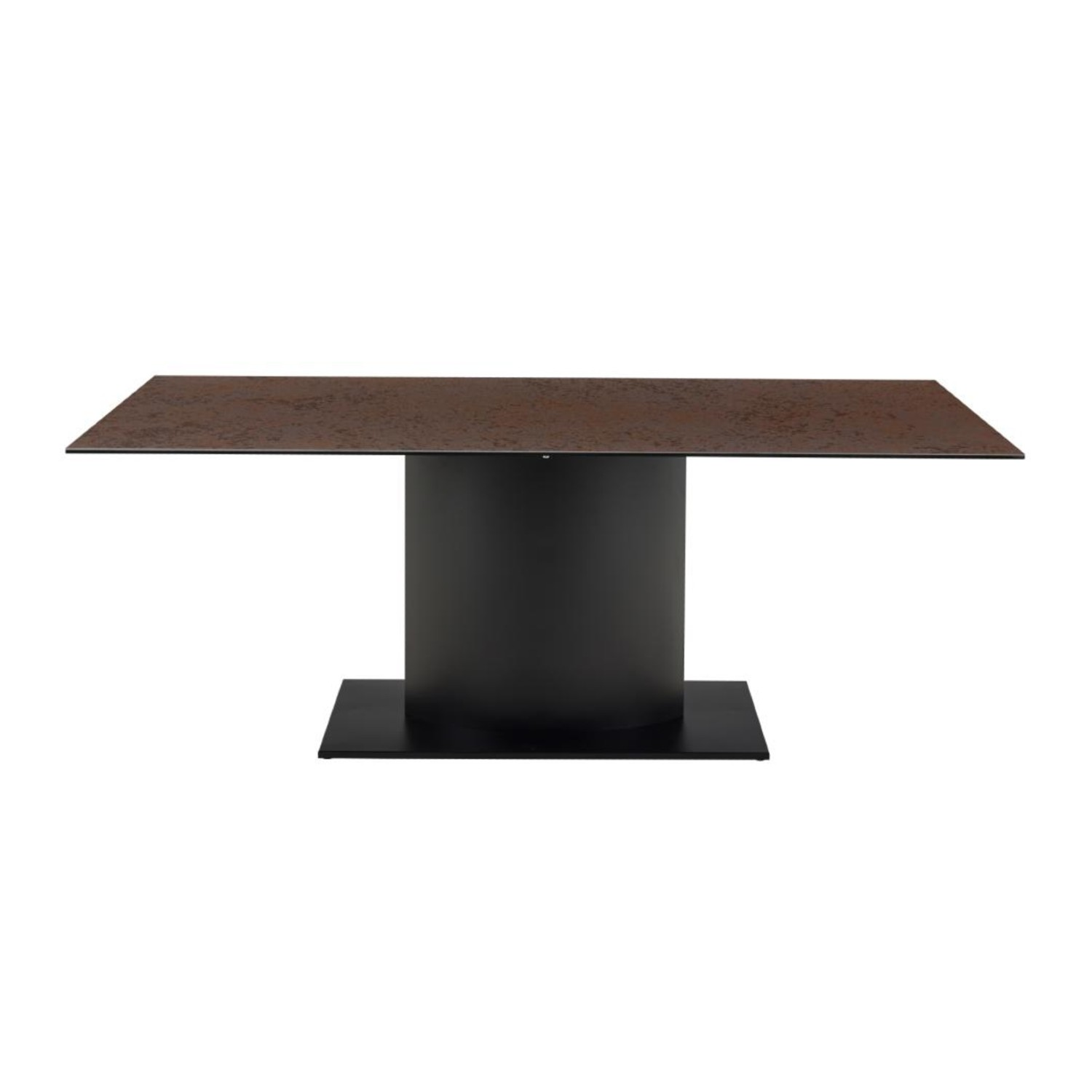 Designul mesei fixe 200 cm cu blat ceramic maro ruginiu Marbella este completat de un picior central robust și o talpă solidă, ambele realizate din oțel vopsit în negru, un contrast elegant care pune în valoare textura și luminozitatea blatului. Această structură centralizată asigură stabilitate excelentă, dar și libertate de mișcare, oferind loc amplu pentru scaune și o ergonomie superioară.