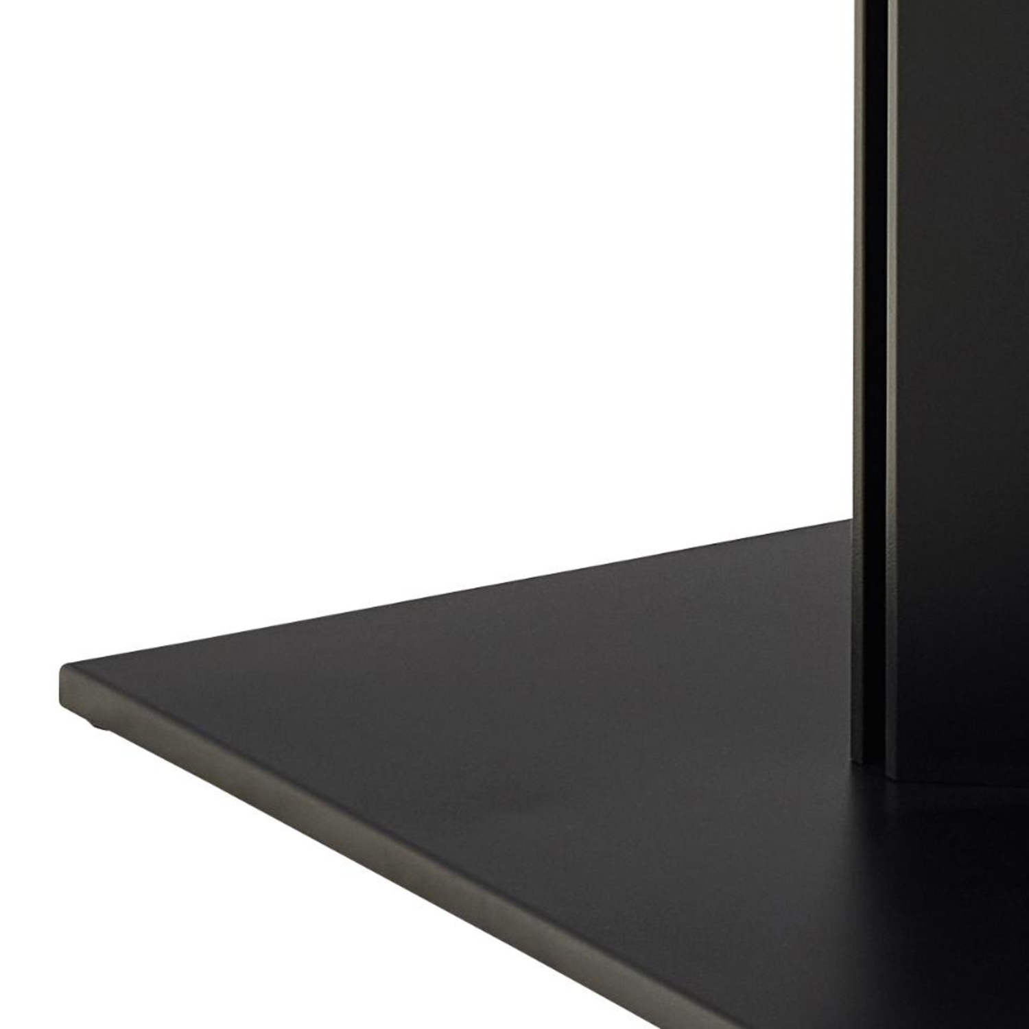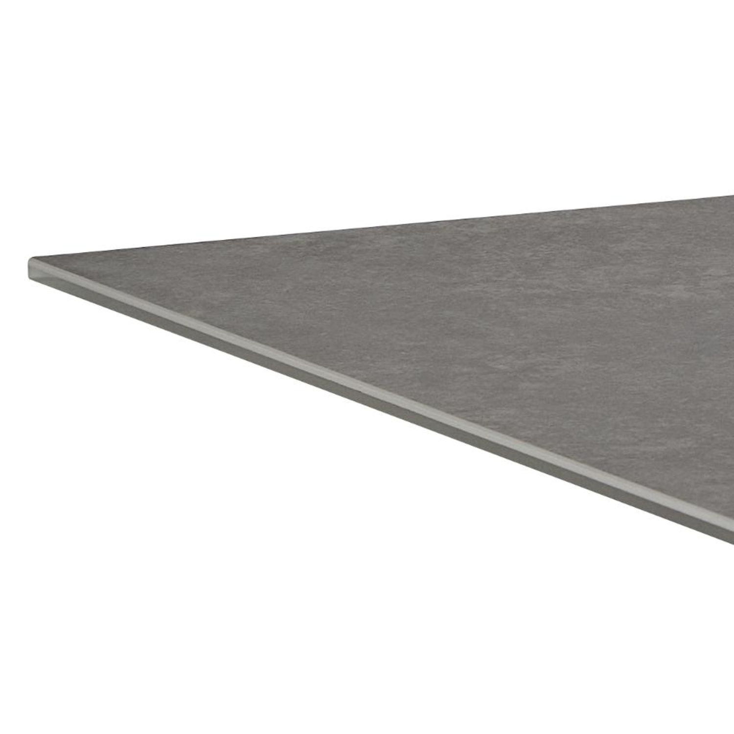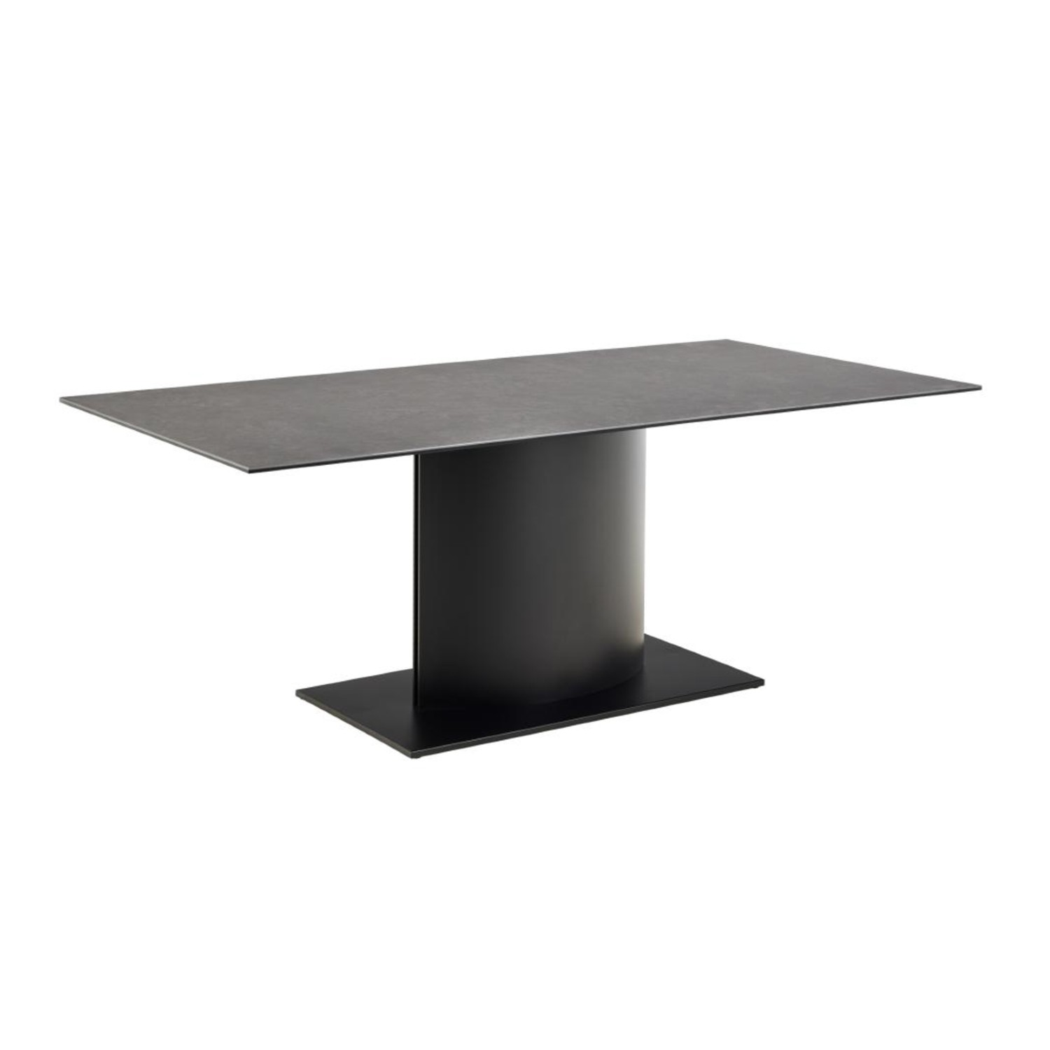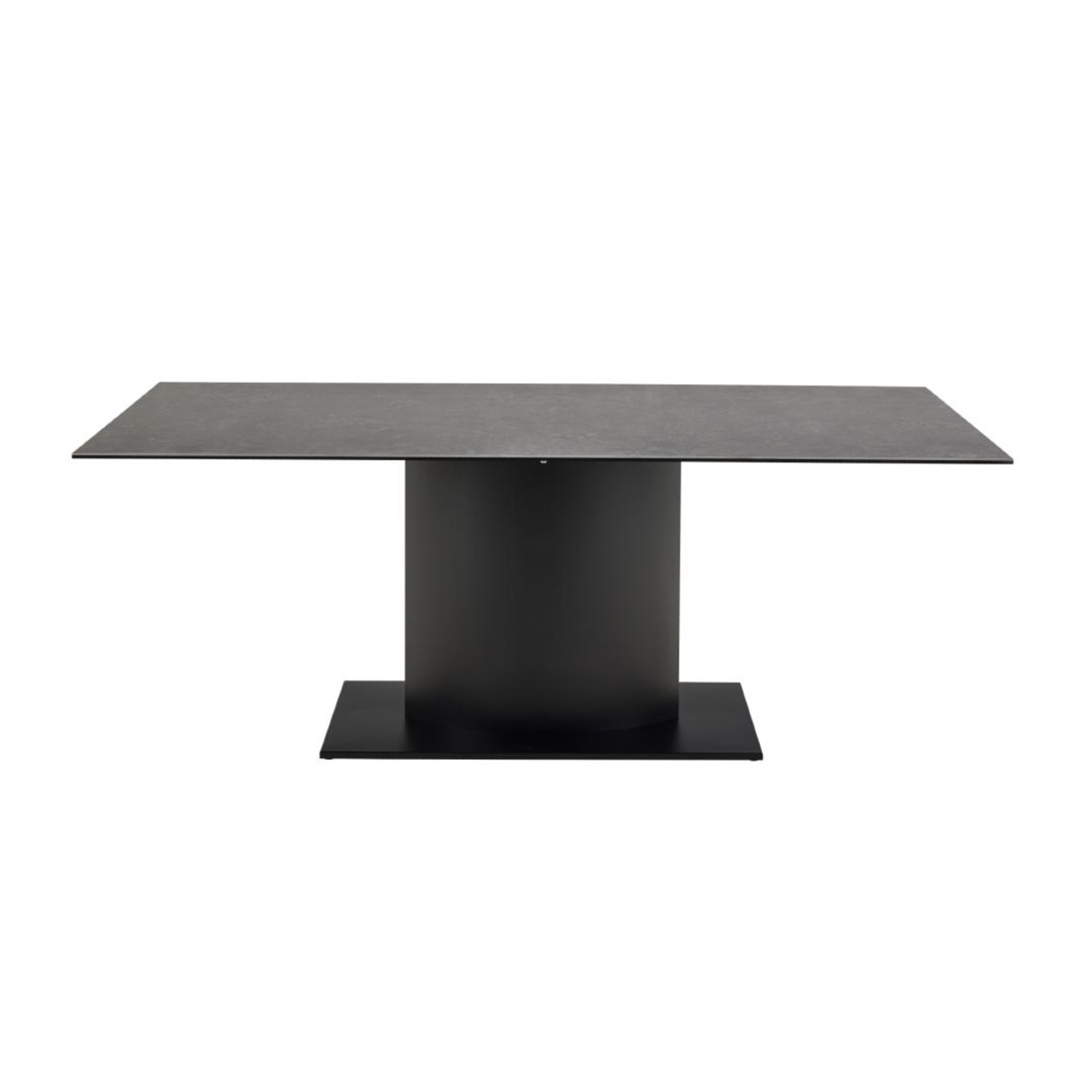 Designul mesei fixe 200 cm cu blat ceramic negru Marbella este completat de un picior central robust și o talpă solidă, ambele realizate din oțel vopsit în negru, un contrast elegant care pune în valoare textura și luminozitatea blatului. Această structură centralizată asigură stabilitate excelentă, dar și libertate de mișcare, oferind loc amplu pentru scaune și o ergonomie superioară.
