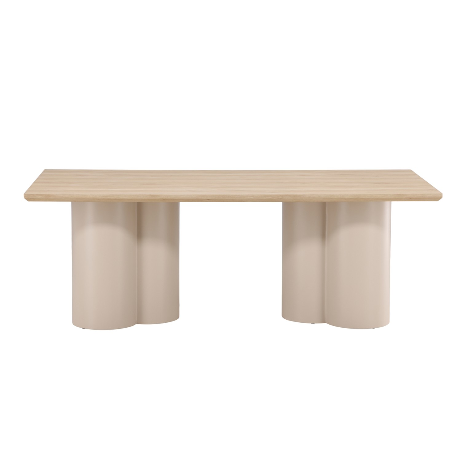 Blatul dreptunghiular, cu aspect de lemn, creează o atmosferă luminoasă și primitoare, oferind senzația de spațiu deschis chiar și în încăperile mai mici. Textura subtilă a blatului completează estetica modernă, fiind totodată ușor de întreținut și rezistentă la uzură. Cele două picioare masive, într-o nuanță caldă de cașmir, oferă stabilitate excelentă și introduc un element vizual echilibrat, potrivit atât pentru decoruri minimaliste, cât și pentru cele în stil scandinav, nordic sau contemporan.