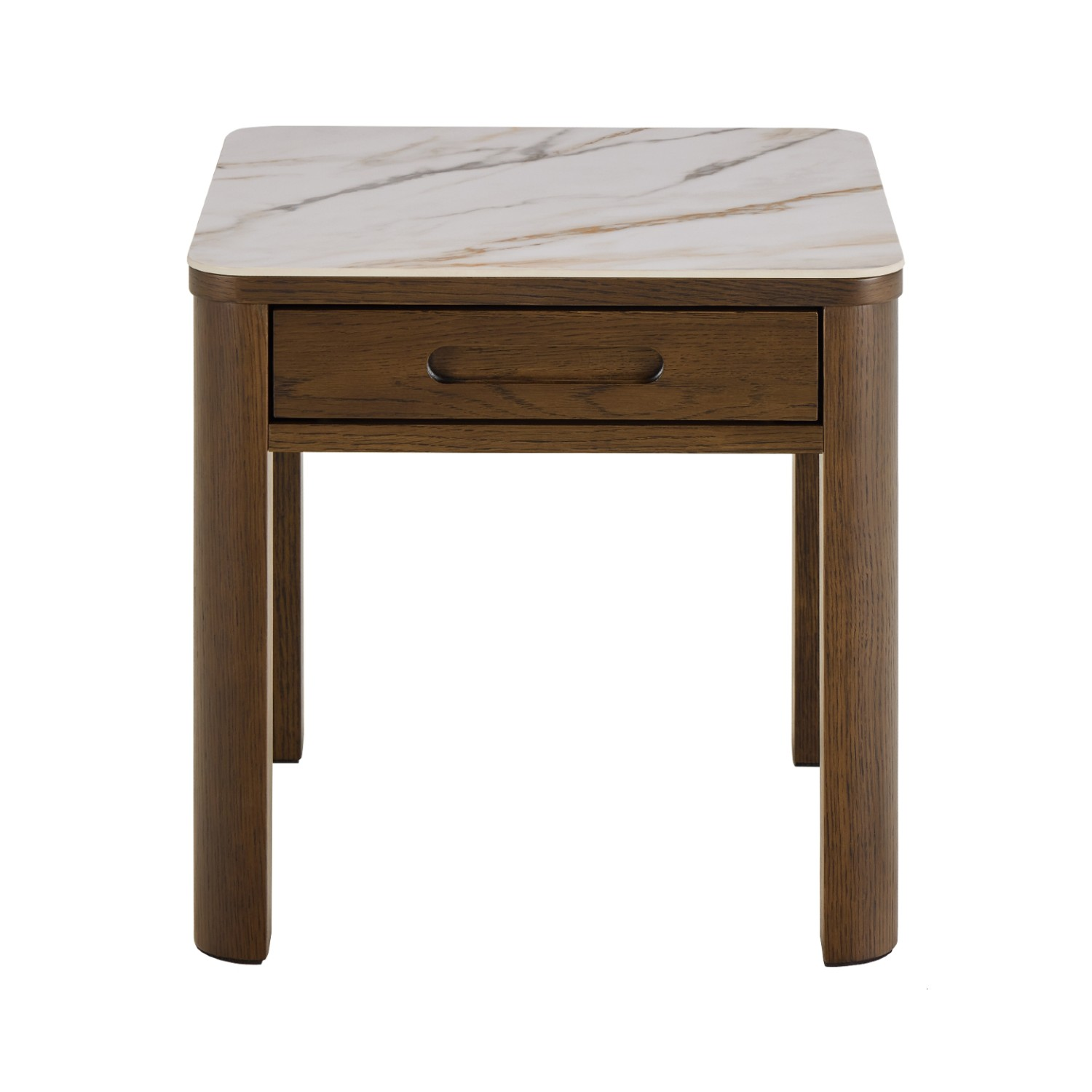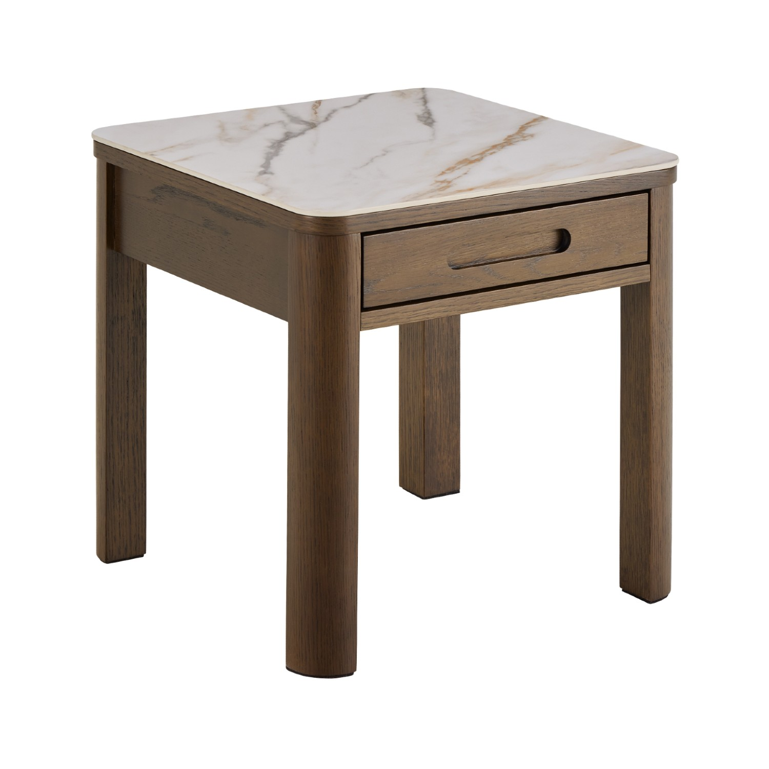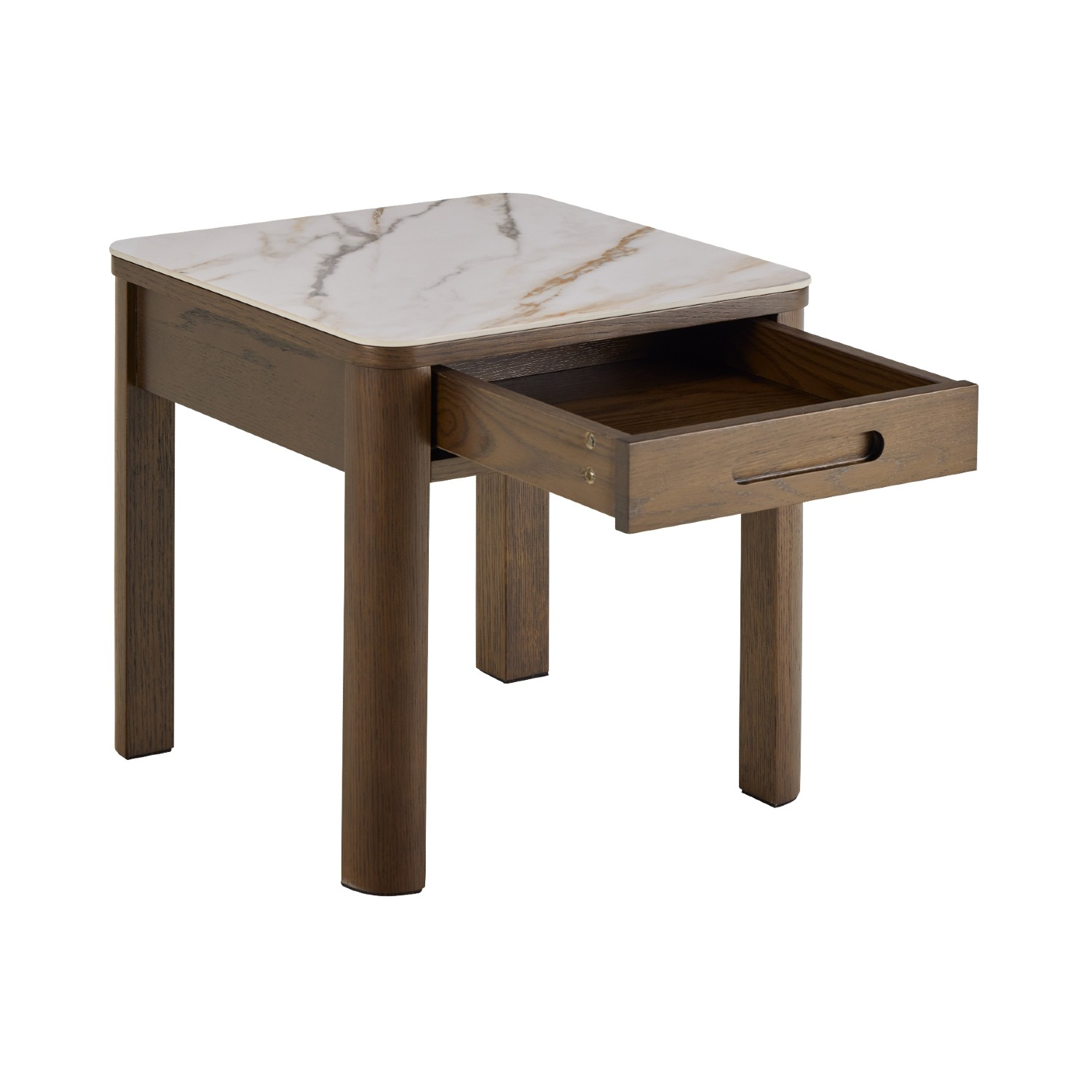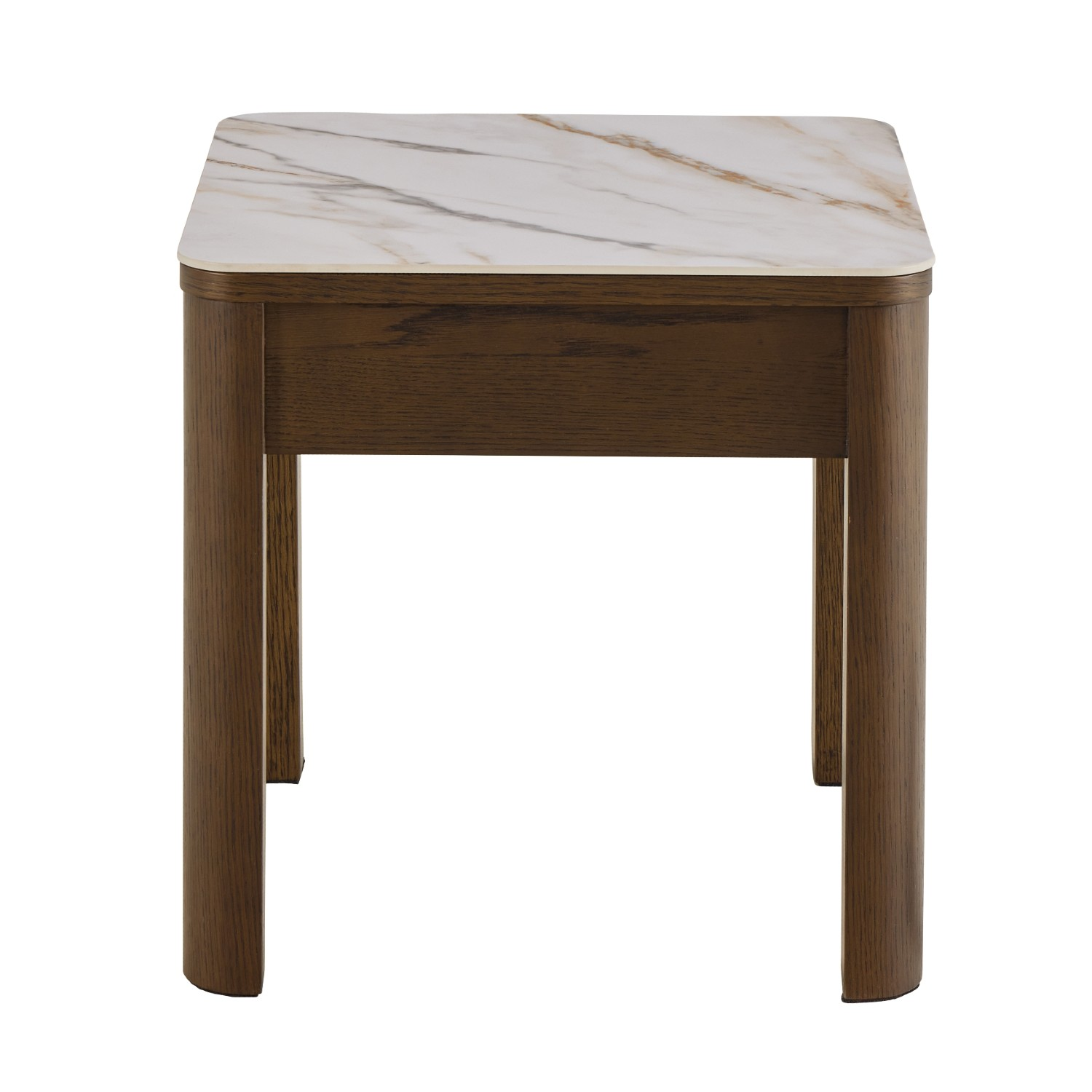 Blatul pătrat, realizat din ceramică rezistentă la căldură, zgârieturi și pete, este ușor de întreținut și își păstrează aspectul impecabil în timp. Picioarele pătrate, robuste, din furnir de stejar afumat lăcuit, oferă stabilitate și un accent natural, echilibrând perfect rafinamentul ceramicii cu căldura lemnului.