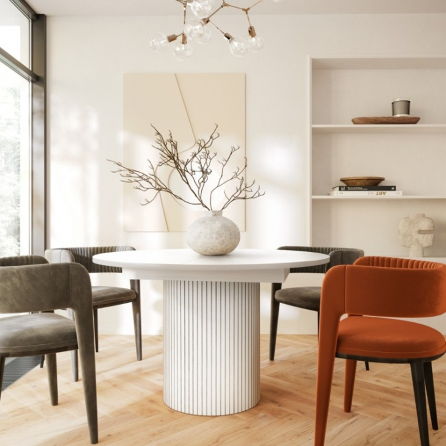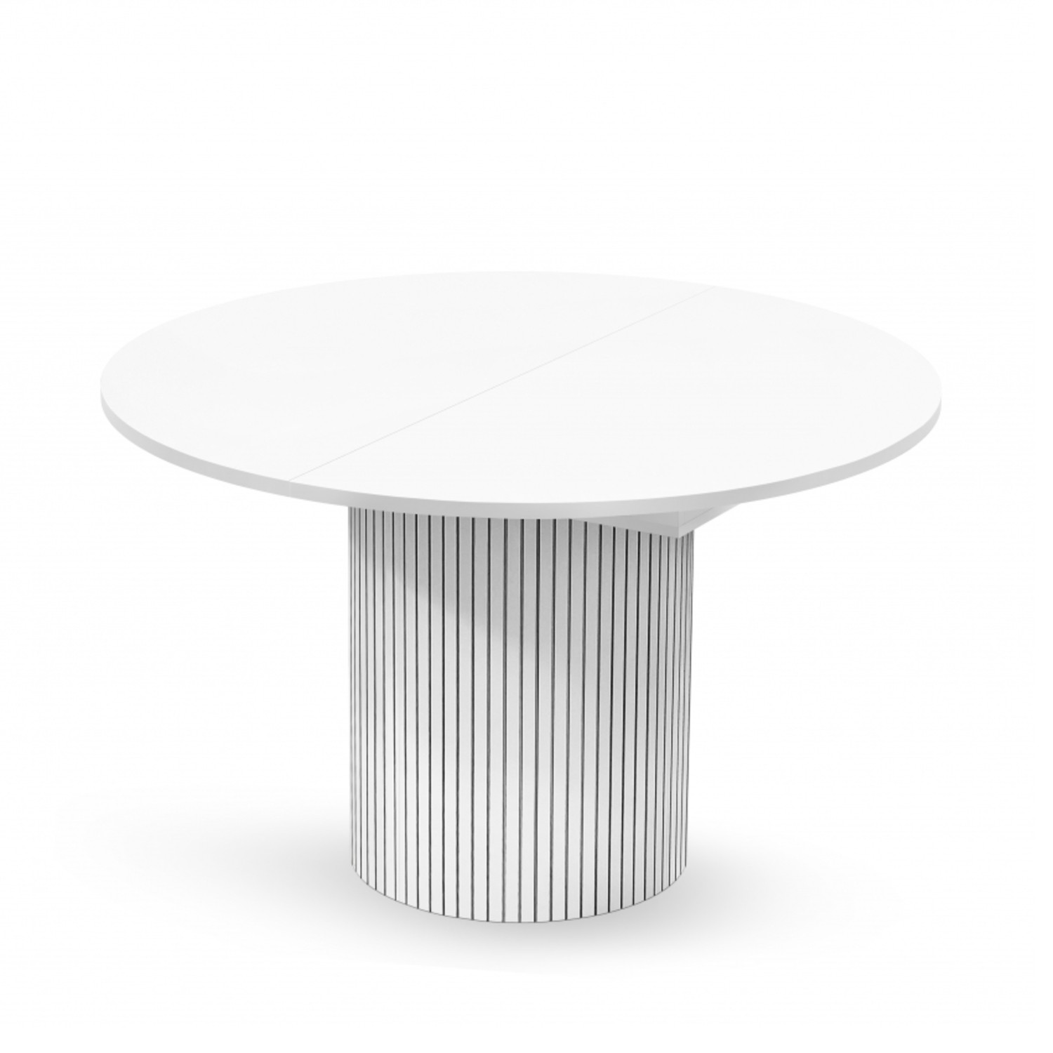 Masa rotundă extensibilă 120/160 cm alb Toscana asigură eleganță și funcționalitate pentru sufrageria ta. Este o masă rotundă extensibilă care îți poate transforma sufrageria într-un spațiu primitor, modern și elegant. Modelul Toscana impresionează prin finisajul său deosebit, materialele de calitate și detaliile atent lucrate. Piciorul cilindric canelat, realizat din MDF vopsit alb cu finisaj lăcuit, reprezintă un element de design modern, perfect pentru interioarele contemporane.