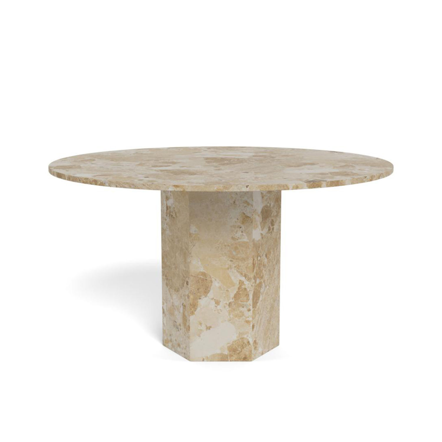 Masa de dining rotundă fixă 130 cm marmură bej Naxos impresionează prin designul său sculptural, cu un blat rotund elegant și un picior central robust, realizat din marmură naturală. Nuanțele calde și variațiile unice ale pietrei aduc un plus de lux și rafinament, fiecare piesă fiind distinctă. Finisajul mat lăcuit îi oferă un aspect modern și totodată o protecție suplimentară, transformând această masă într-un punct central de atracție în orice sufragerie sau spațiu de dining. Masa dining rotundă fixă 130cm marmură bej Naxos este ideală pentru cine în familie sau întâlniri cu prietenii, oferind suficient spațiu pentru 4–6 persoane.